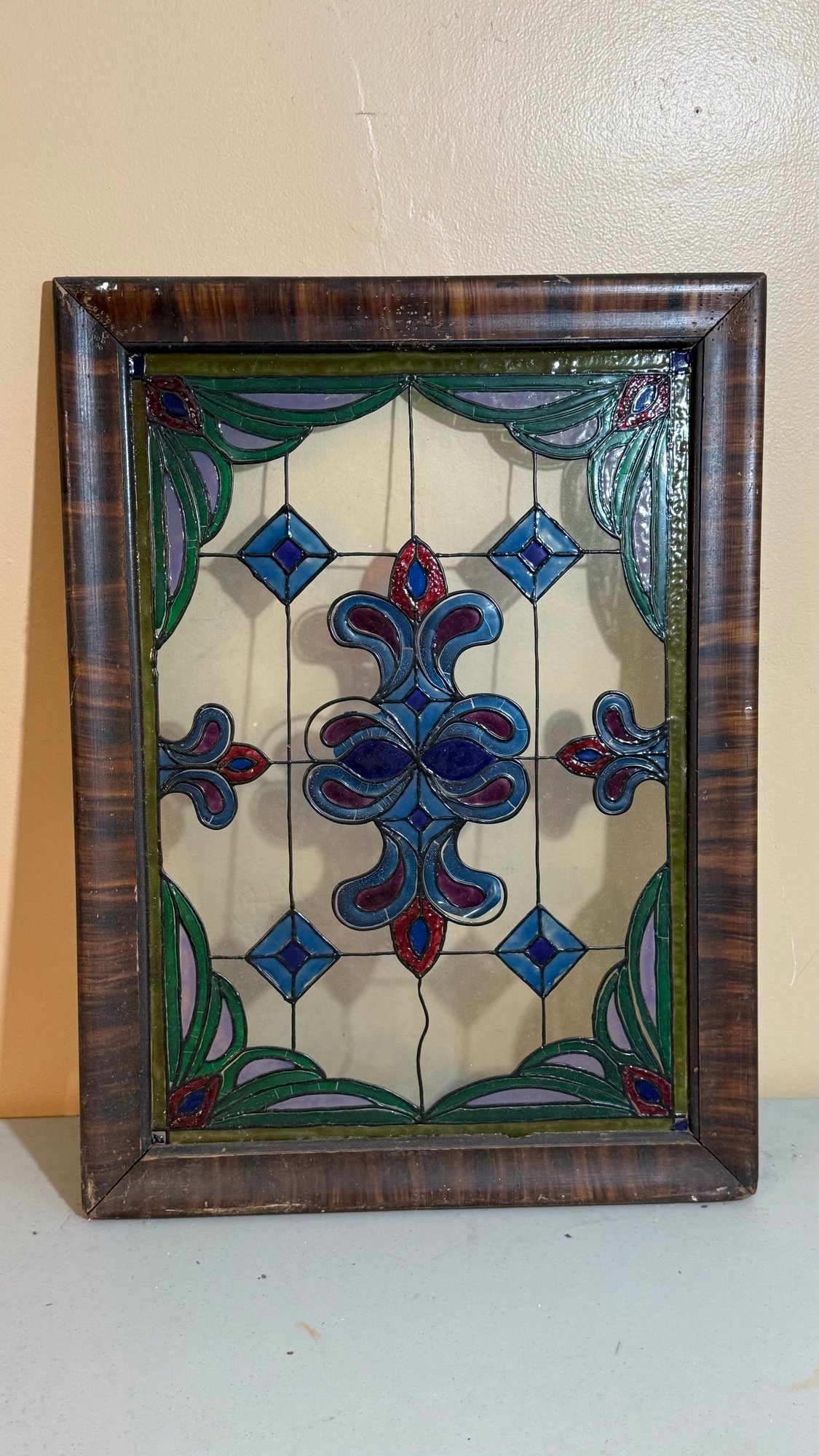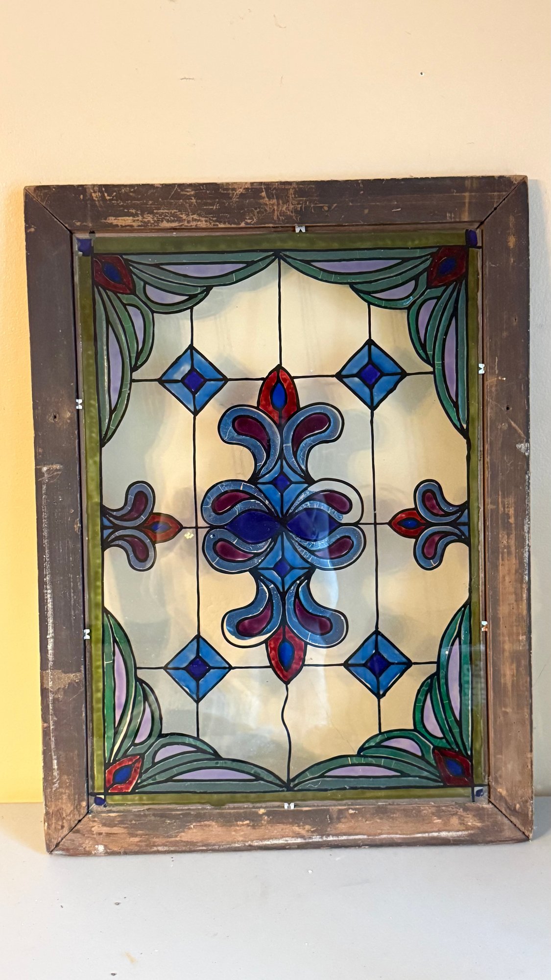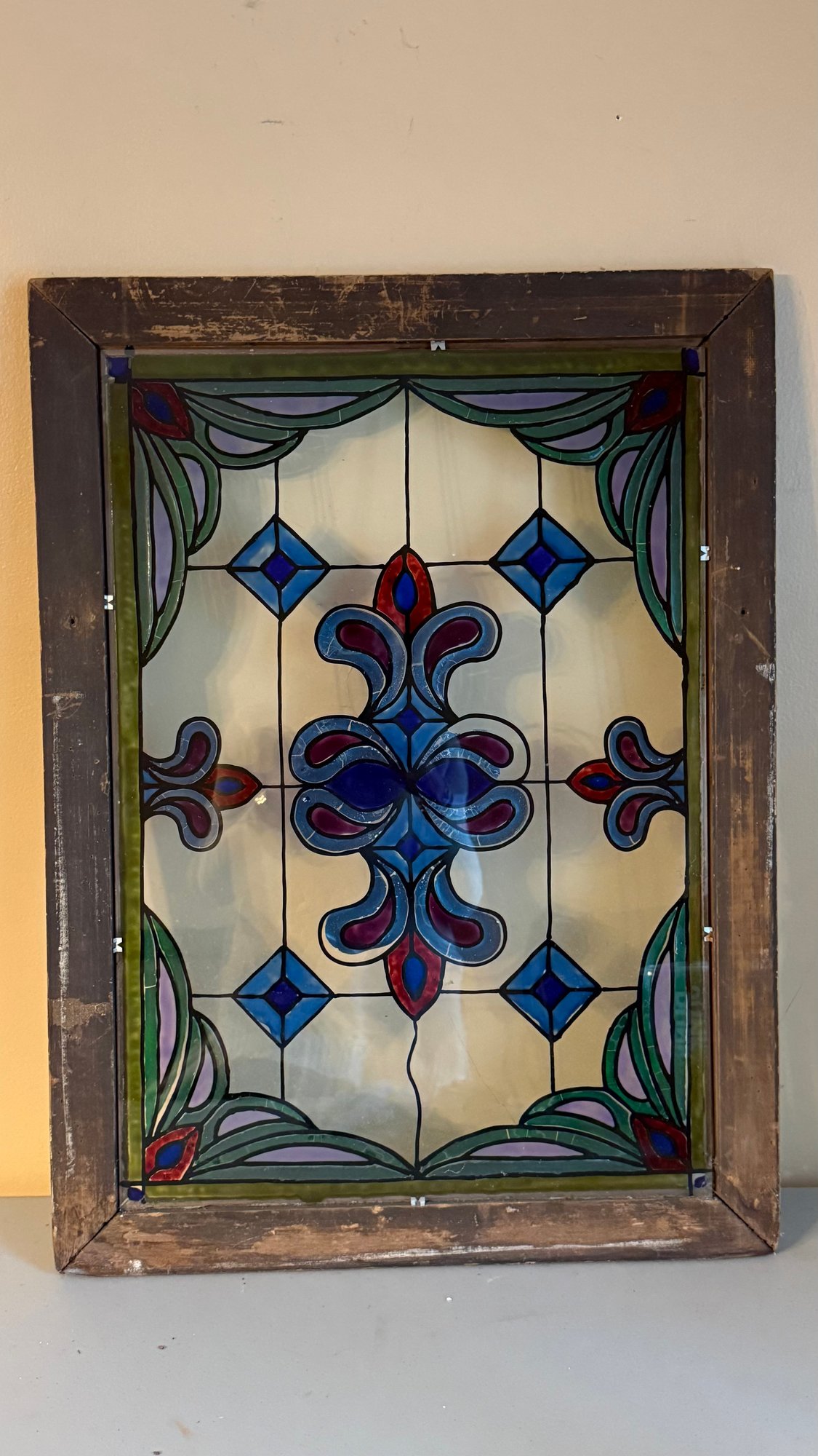Architectural style window panel featuring a beautifully weathered, chippy painted wood frame and decorative colored insect design. The frame shows layers of distressed paint, giving it a rustic, timeworn character. The center panel features colored elements that appear to be decorative cut inserts rather than traditional stained glass.