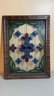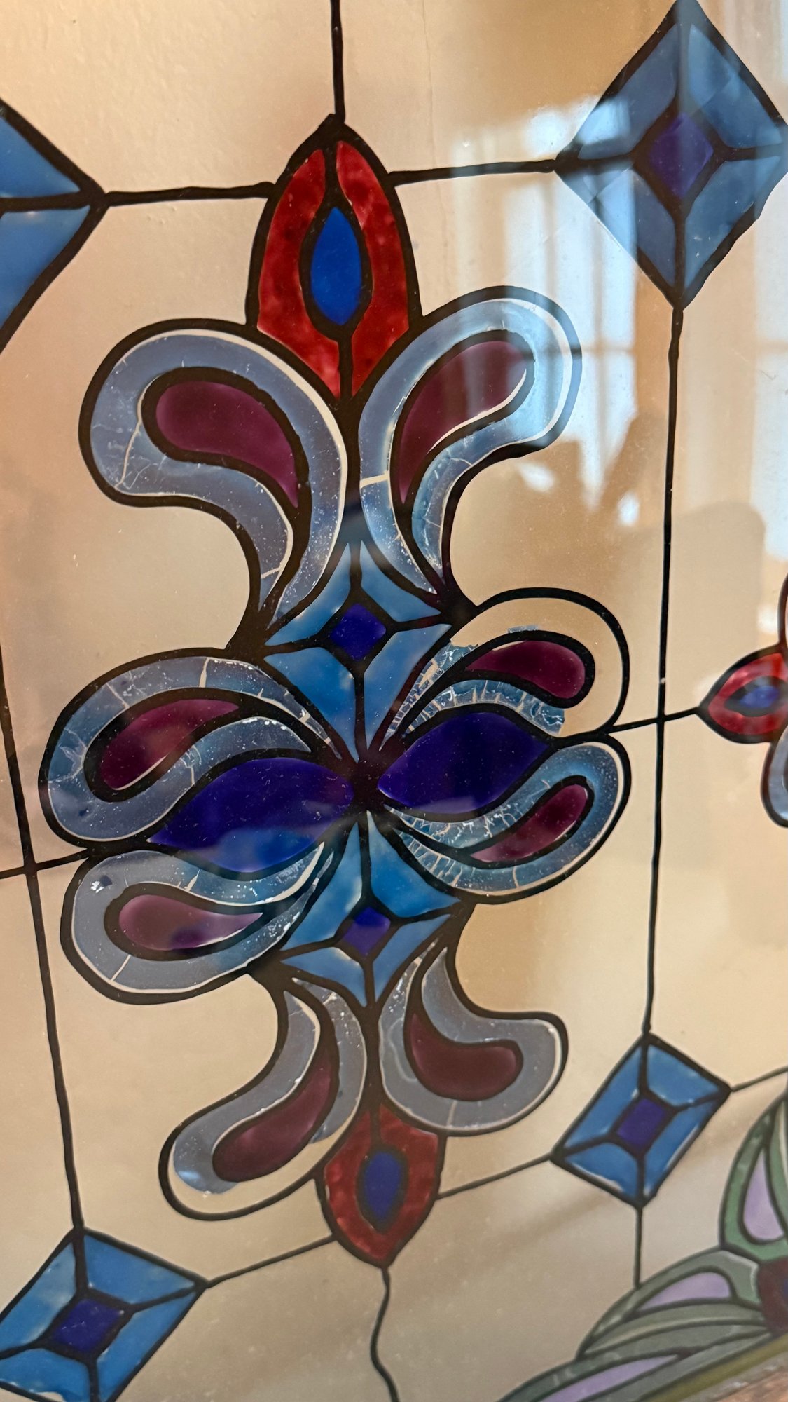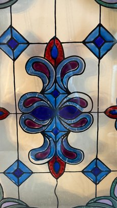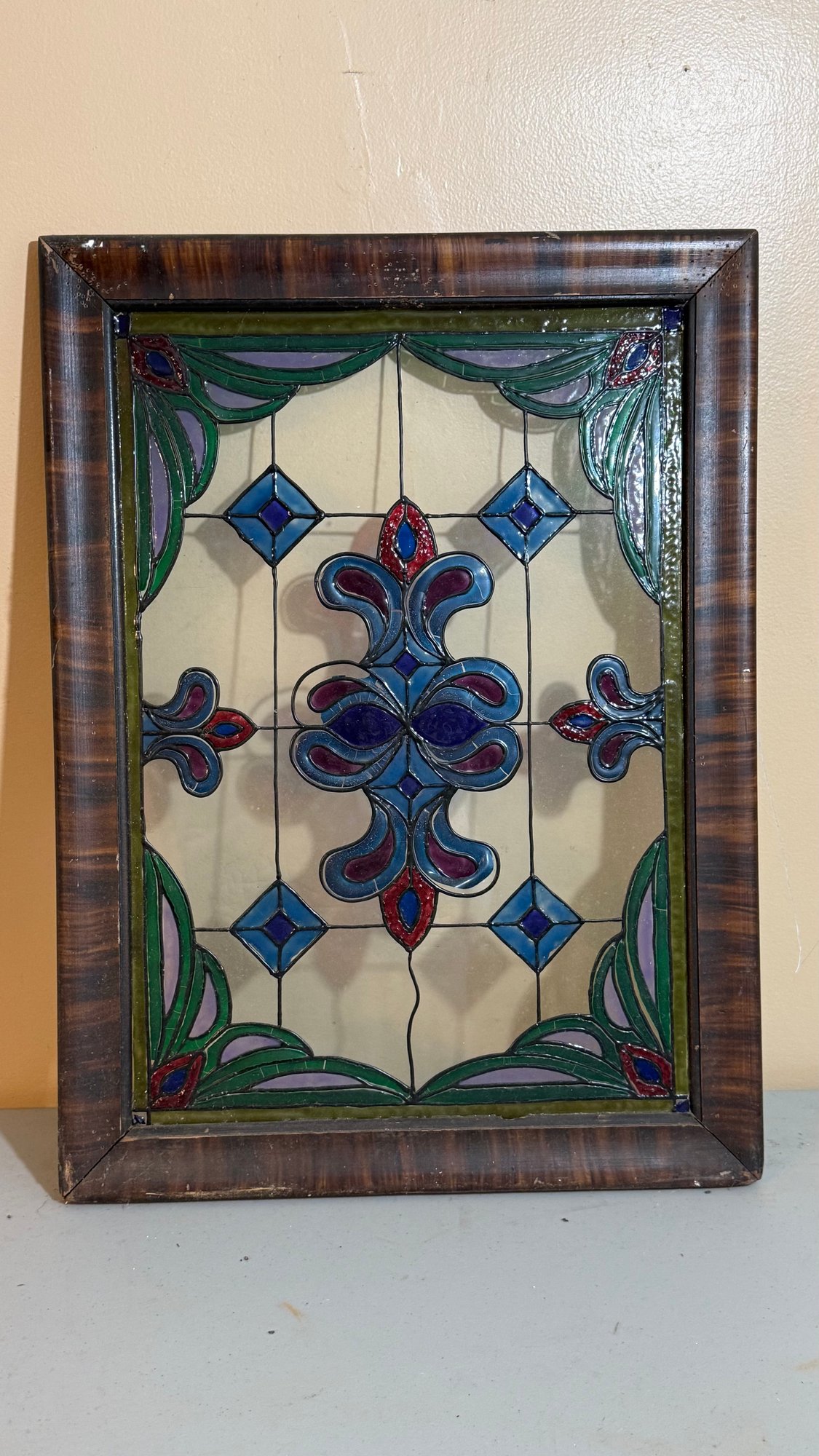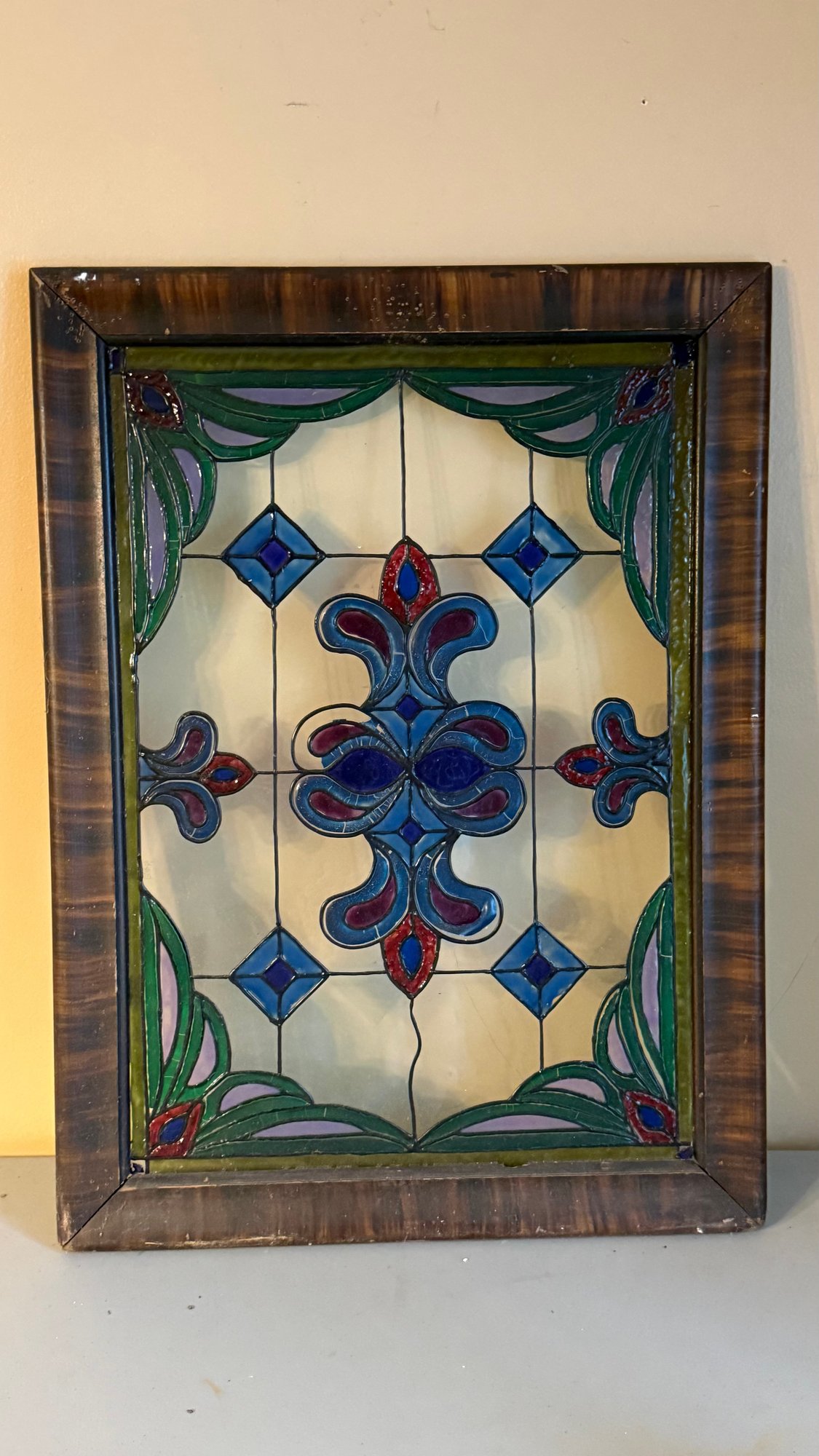 Architectural style window panel featuring a beautifully weathered, chippy painted wood frame and decorative colored insect design. The frame shows layers of distressed paint, giving it a rustic, timeworn character. The center panel features colored elements that appear to be decorative cut inserts rather than traditional stained glass.