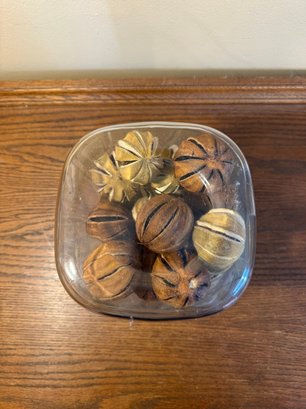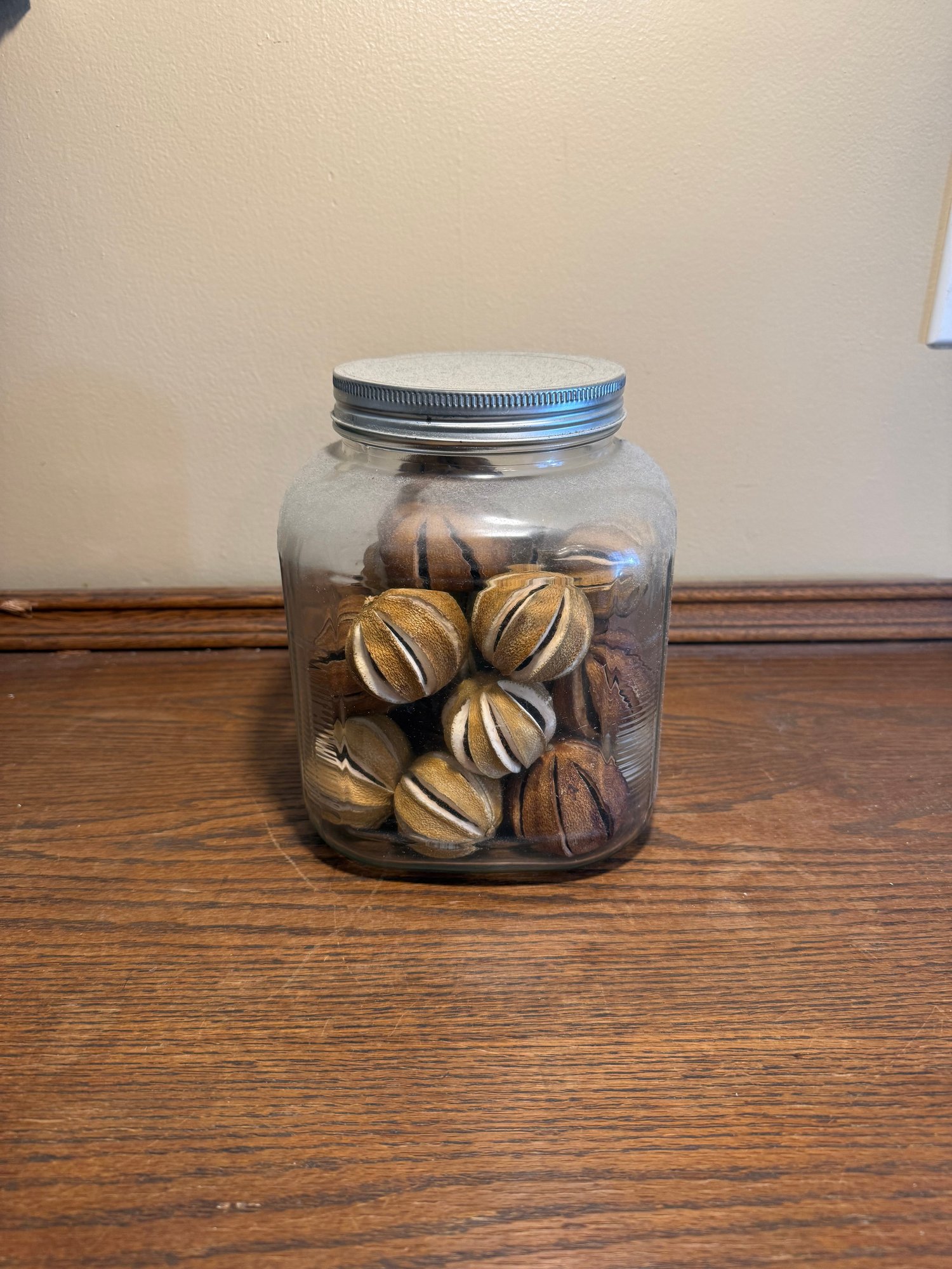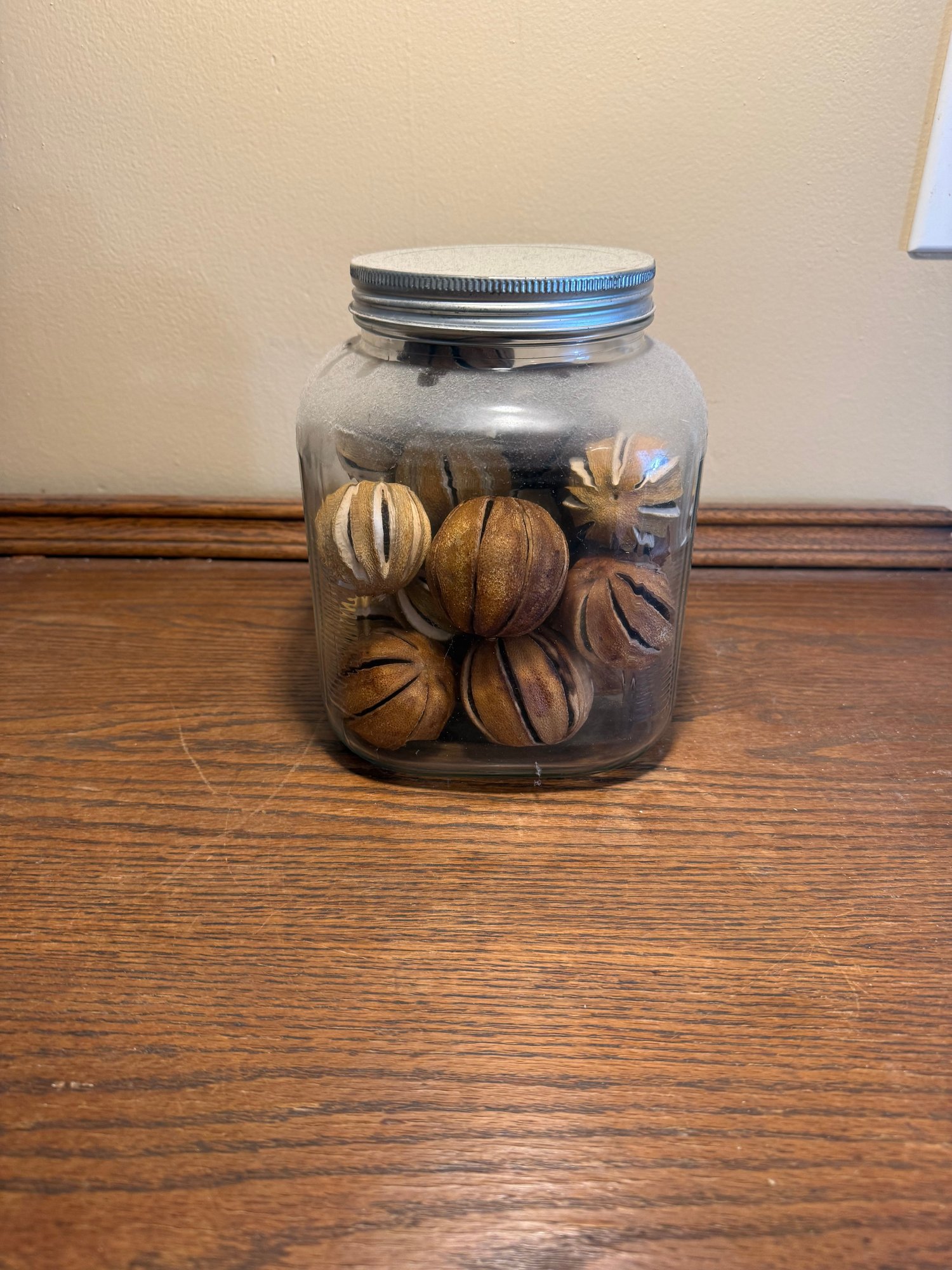 A collection of unique, dried natural elements, possibly processed nuts or fruits, perfect for adding a rustic touch to any home decor setting. The clear glass jar allows for versatile display options.