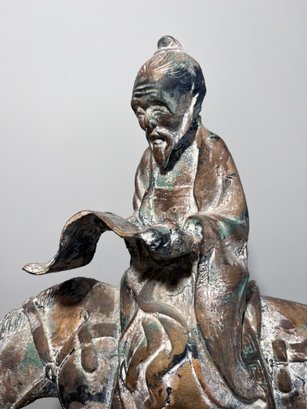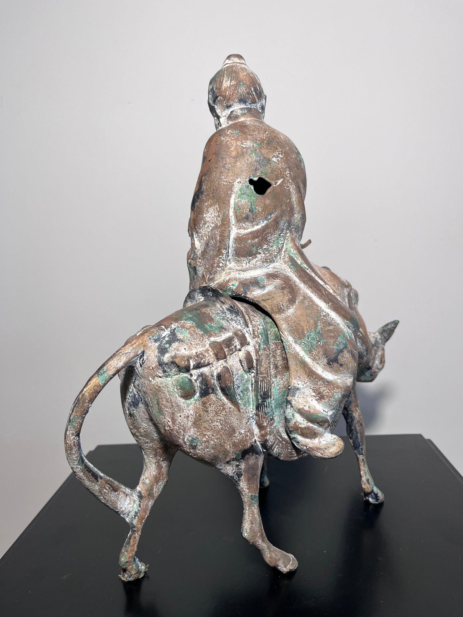 Patinated bronze sculpture depicting a Chinese scholar or sage riding a donkey. It appears to be a collectible incense burner, as such figures often feature holes for releasing smoke when incense is burned inside.