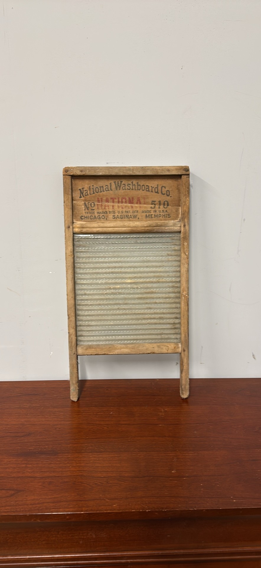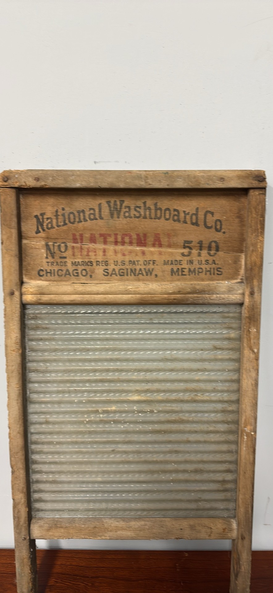 Vintage National Washboard Co. No. 510 washboard. Has wood frame and corrugated metal washing surface. Great piece for rustic decor or collectors.