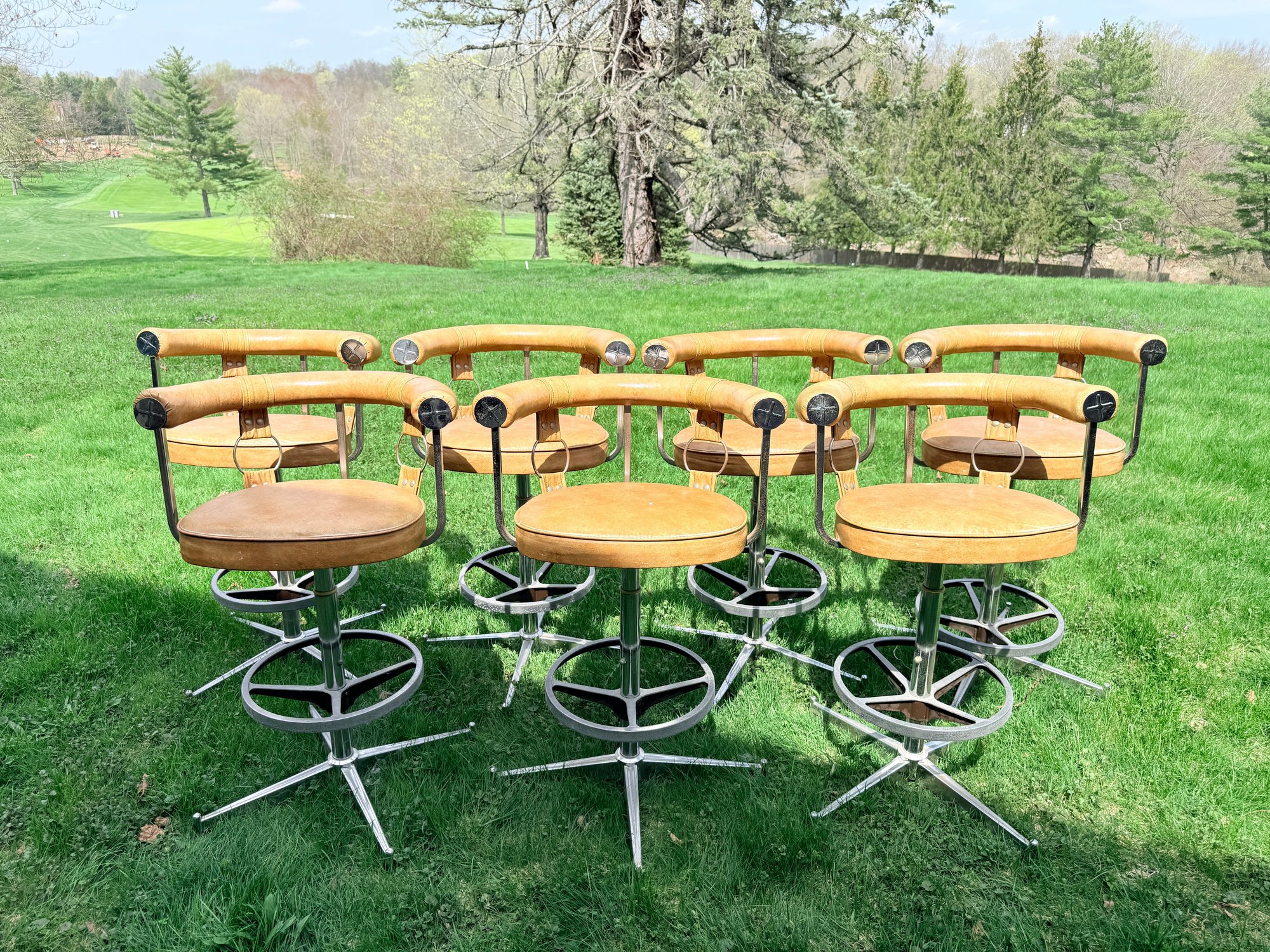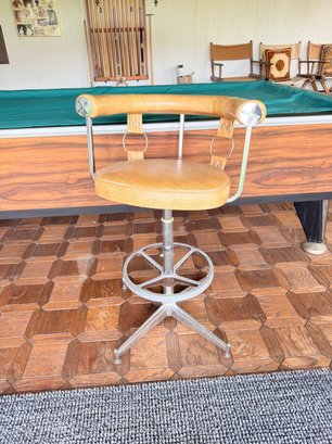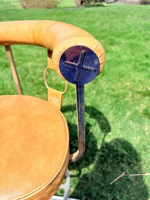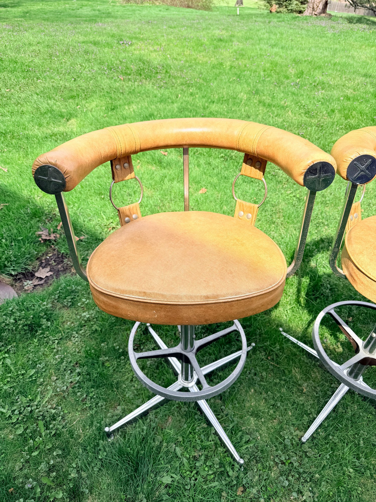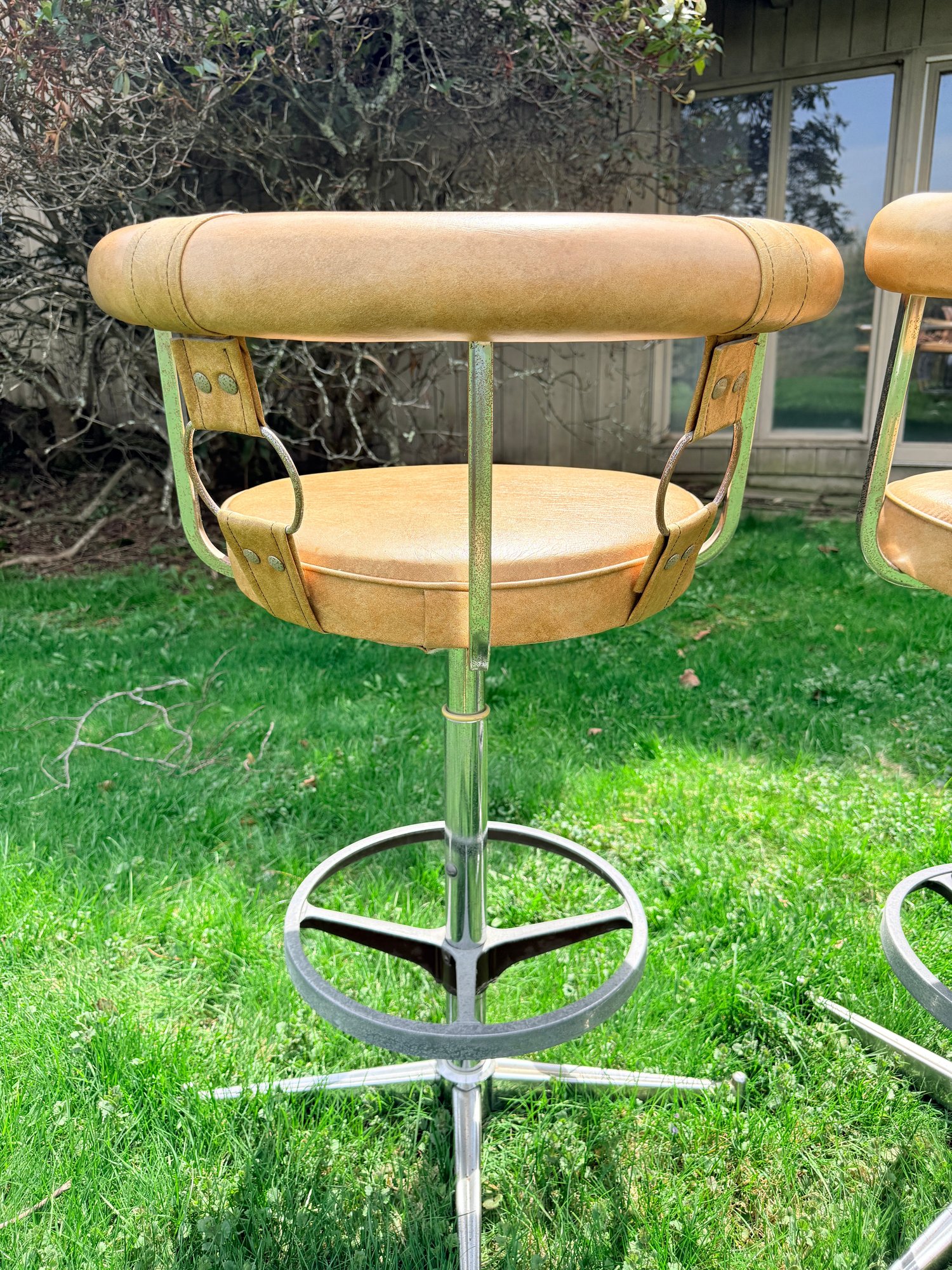 Materials: Features a chrome-plated steel frame and a caramel or honey-tan faux leather (vinyl) seat and backrest.