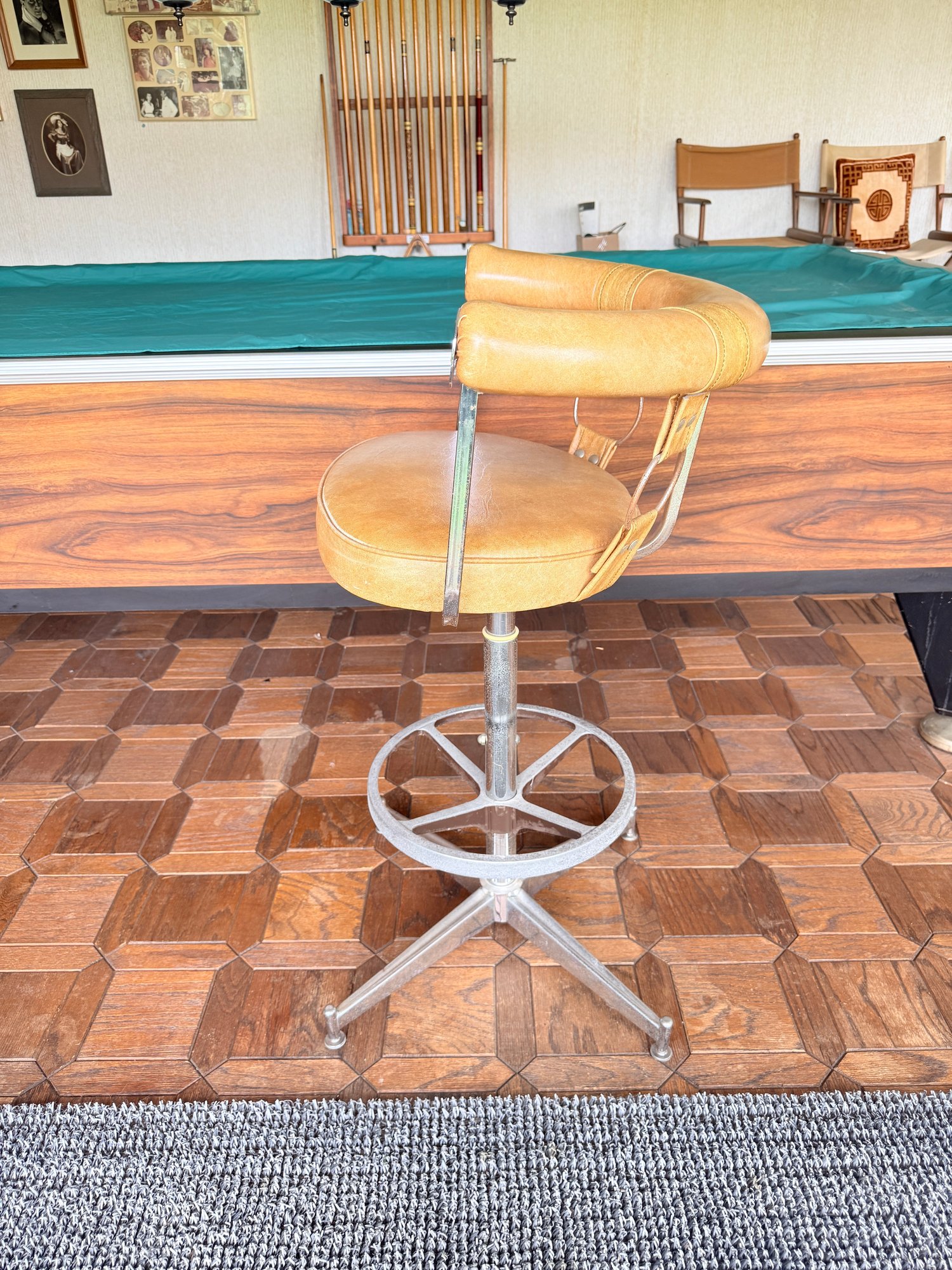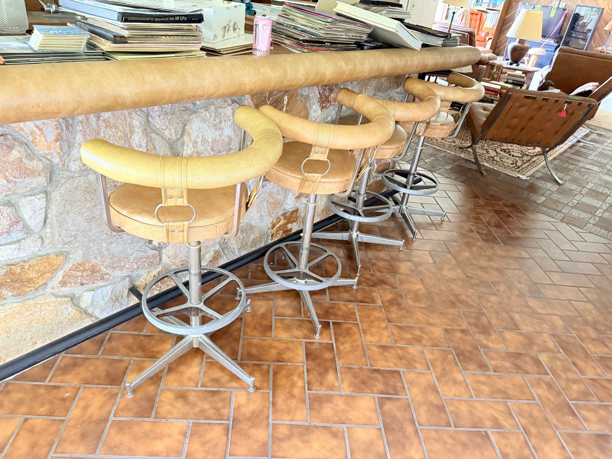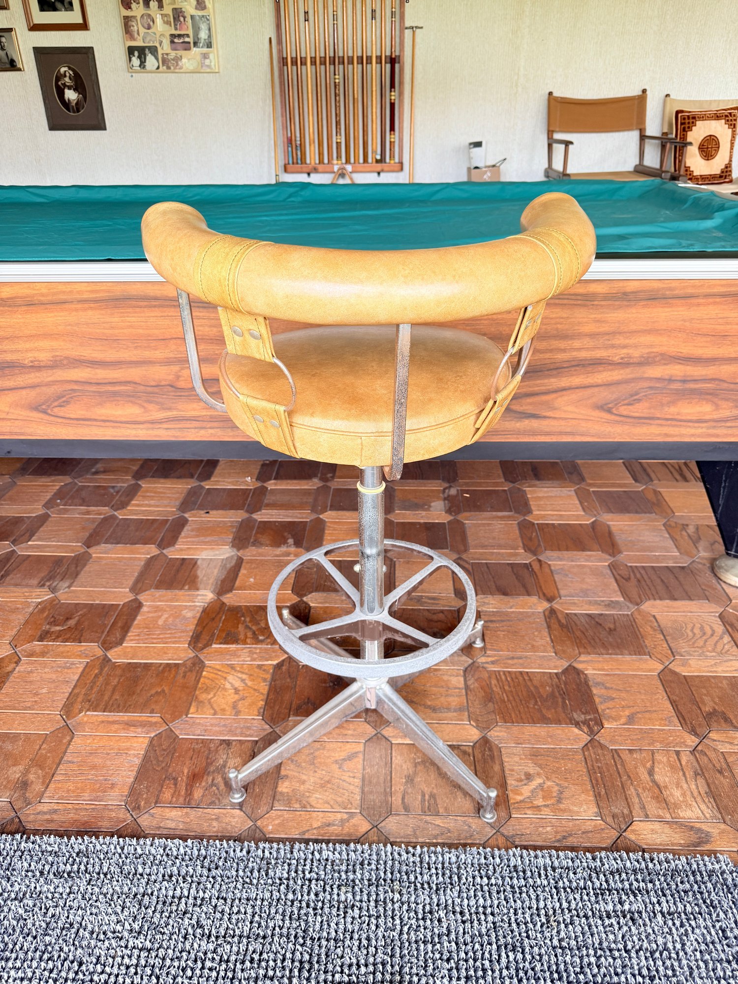 Materials: Features a chrome-plated steel frame and a caramel or honey-tan faux leather (vinyl) seat and backrest.