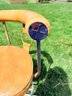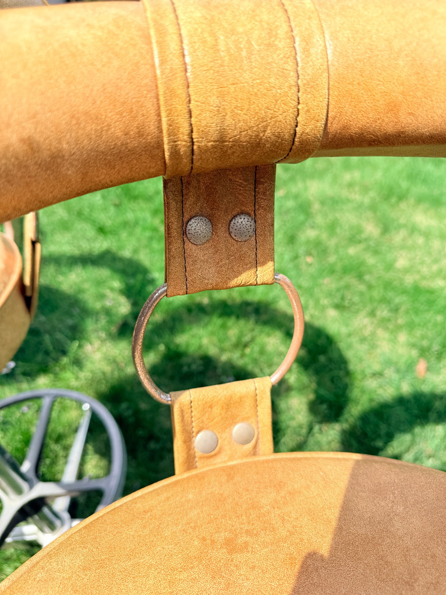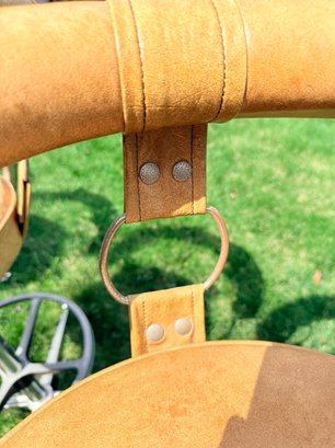 Design Elements: Distinctive barrel-shaped backrest supported by chrome straps with circular ring accents.