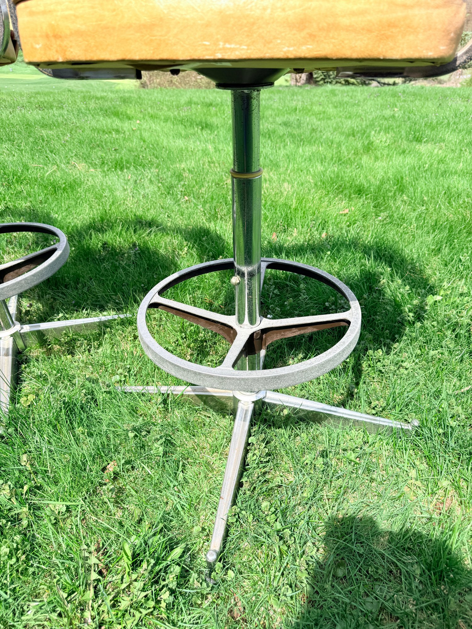 Base: A four-point "X" style chrome base equipped with a circular ring footrest.