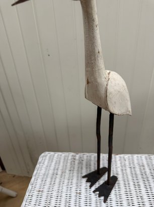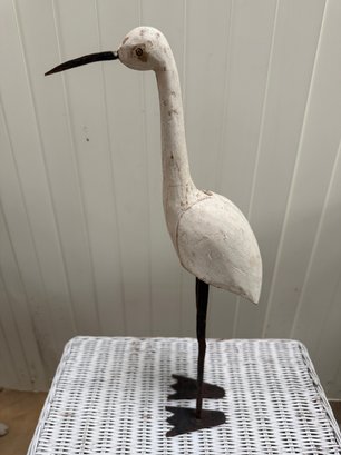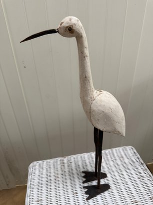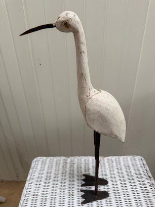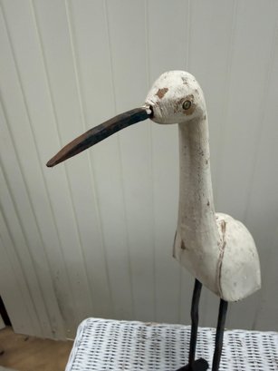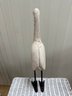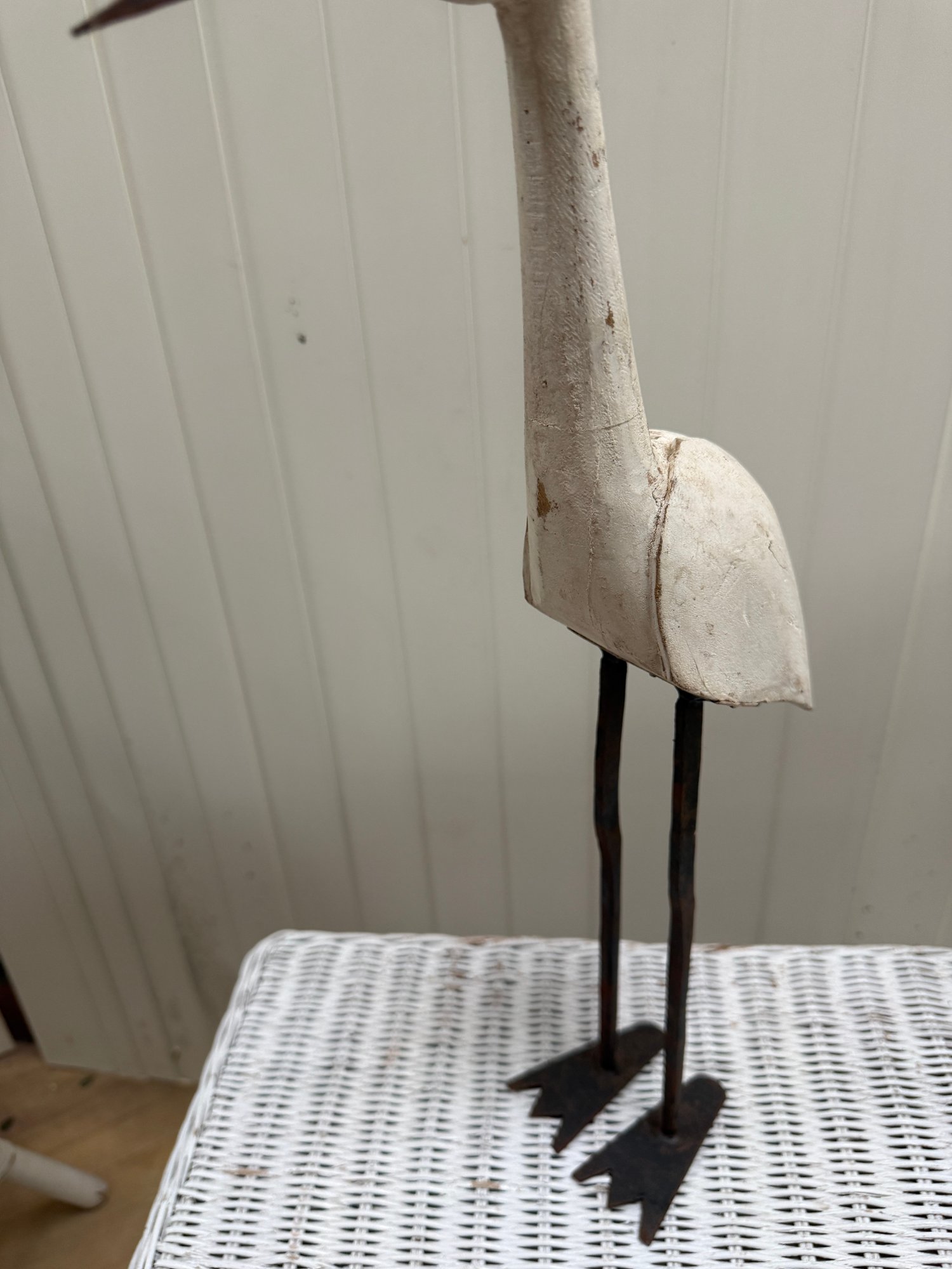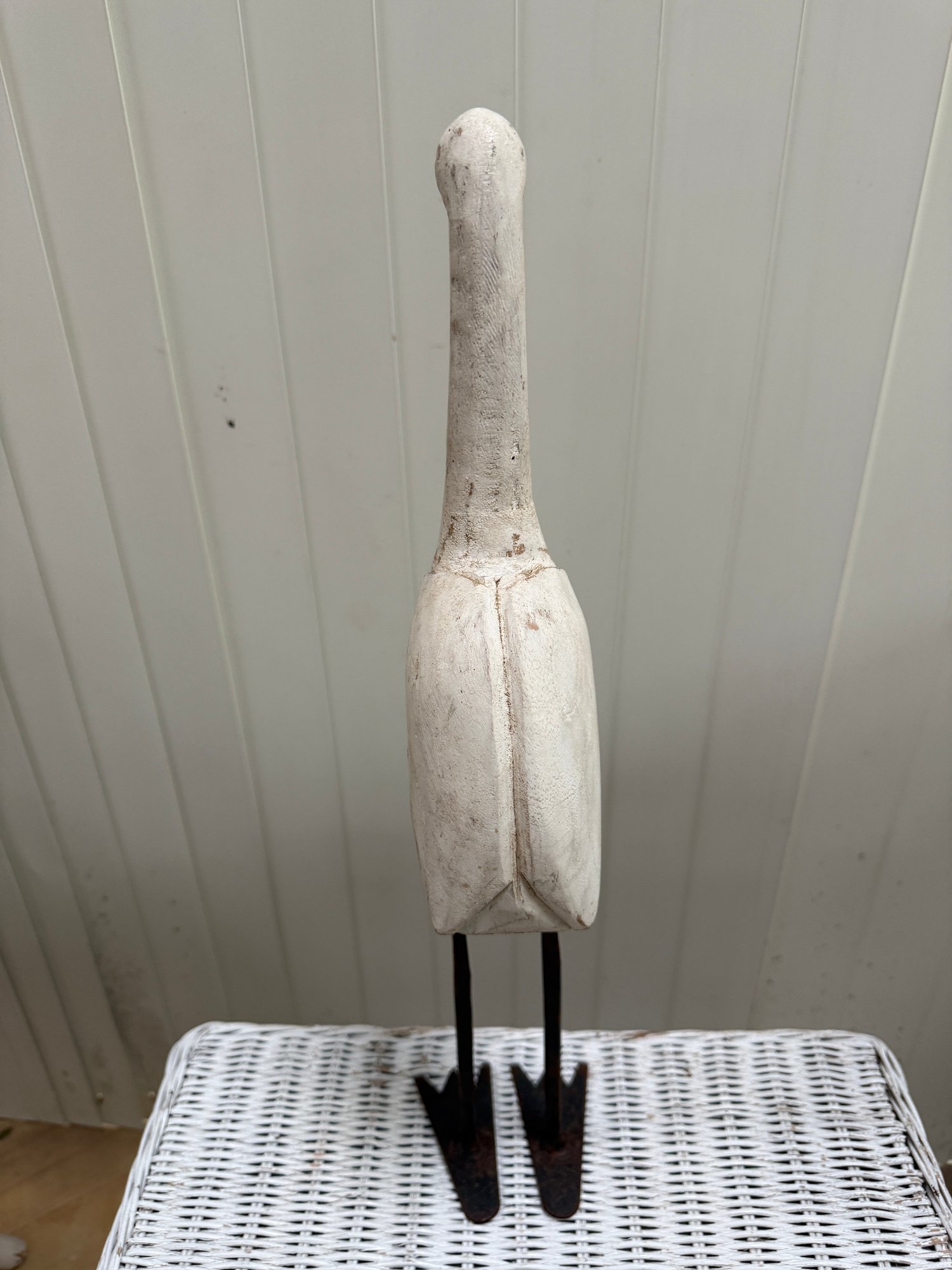 Rustic, hand-carved bird statue is a classic example of coastal folk art, featuring a weathered white finish that gives it an authentic, aged appearance.