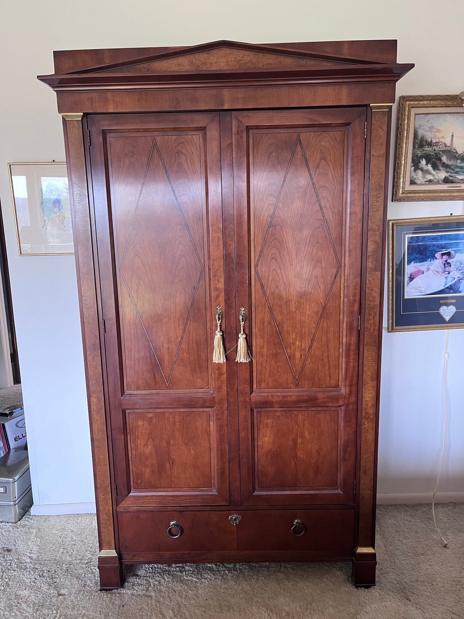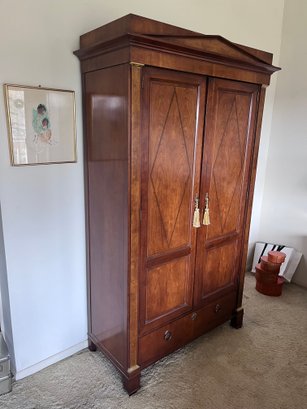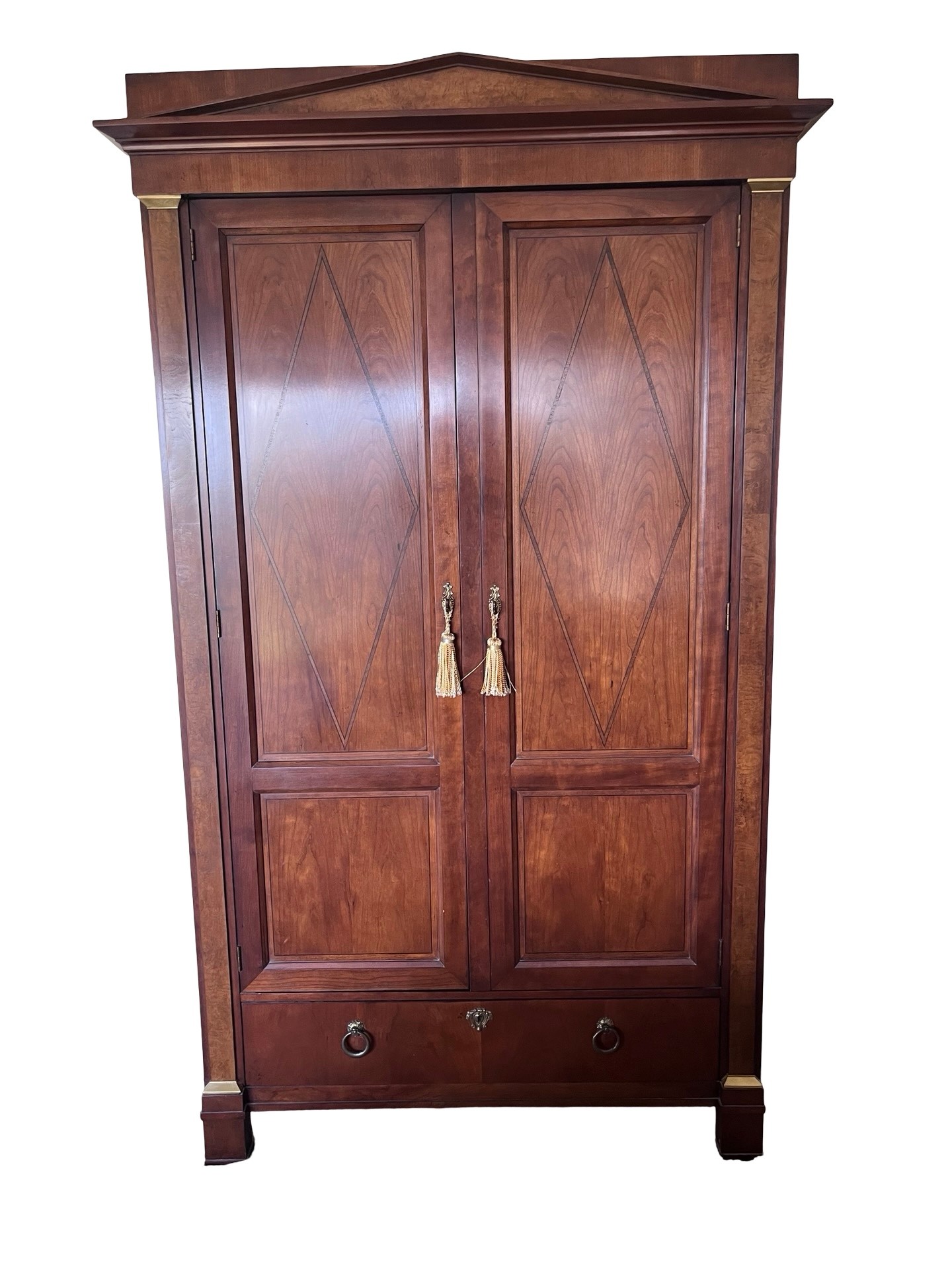Exceptional vintage Baker Furniture armoire / wardrobe crafted in rich mahogany with elegant neoclassical styling. Features a striking pediment crown top, paneled double doors with inlaid diamond motifs, brass-tone decorative accents, and original ornate hardware with tassel pulls.