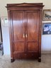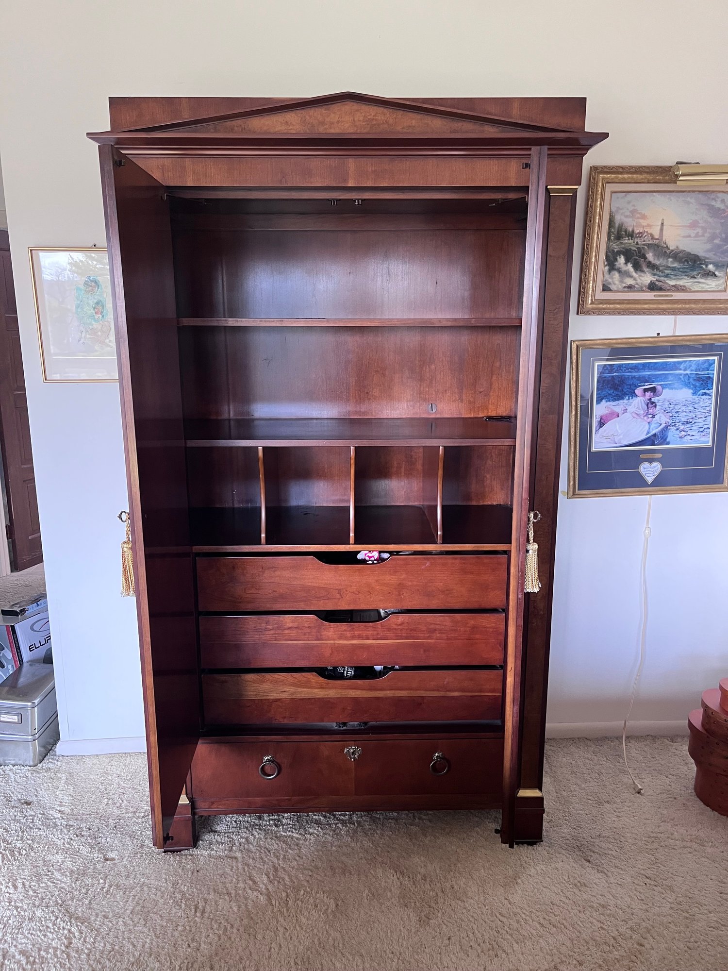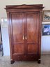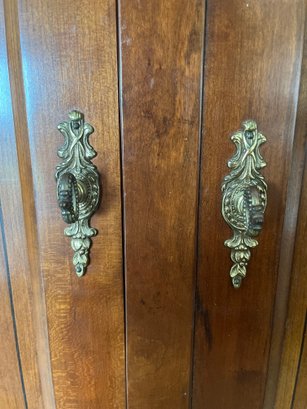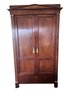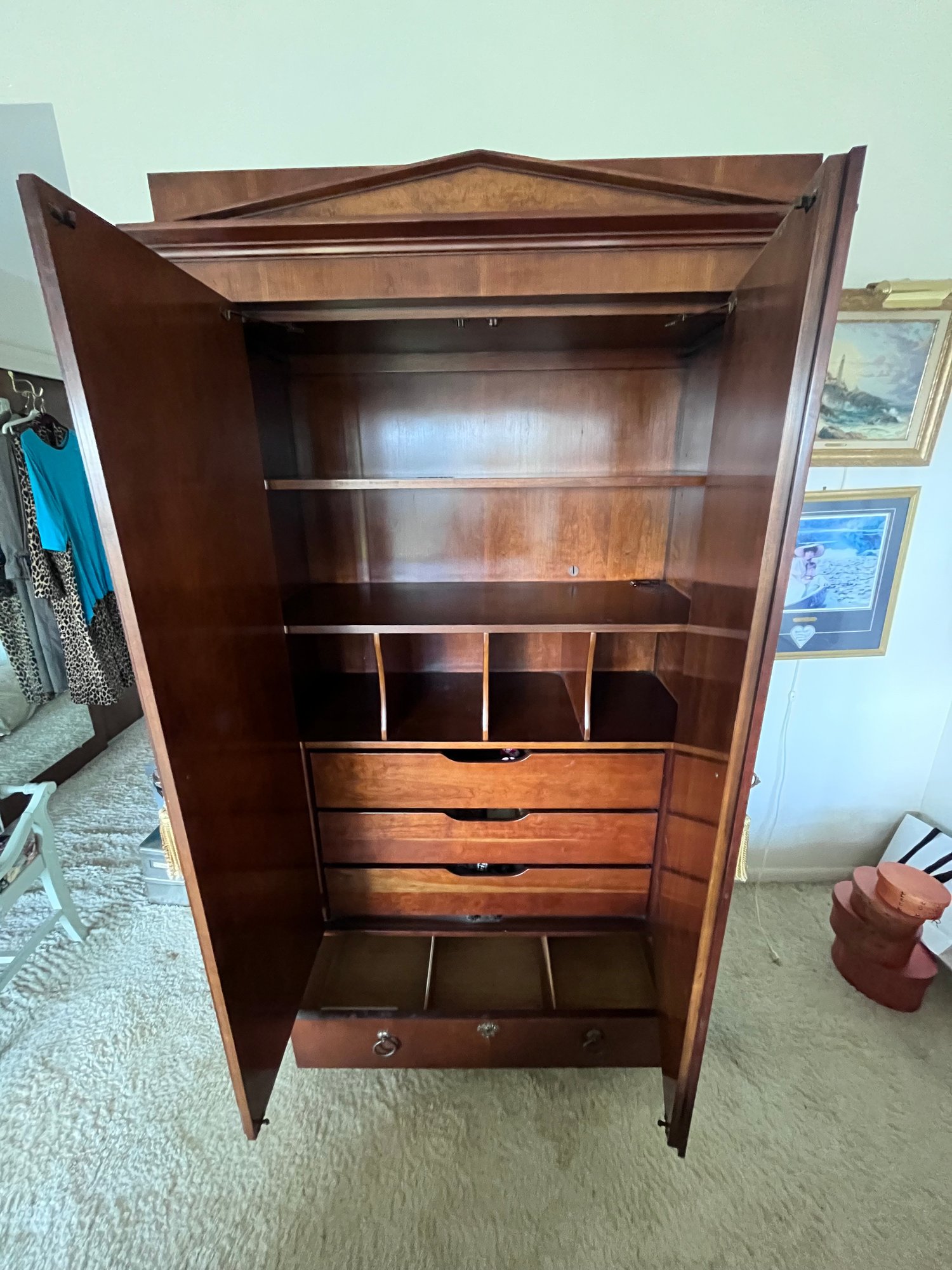 Inside offers versatile storage with shelves, cubbies, multiple drawers, and hanging space—ideal as a gentleman’s chest, wardrobe, linen cabinet, or luxury media cabinet.