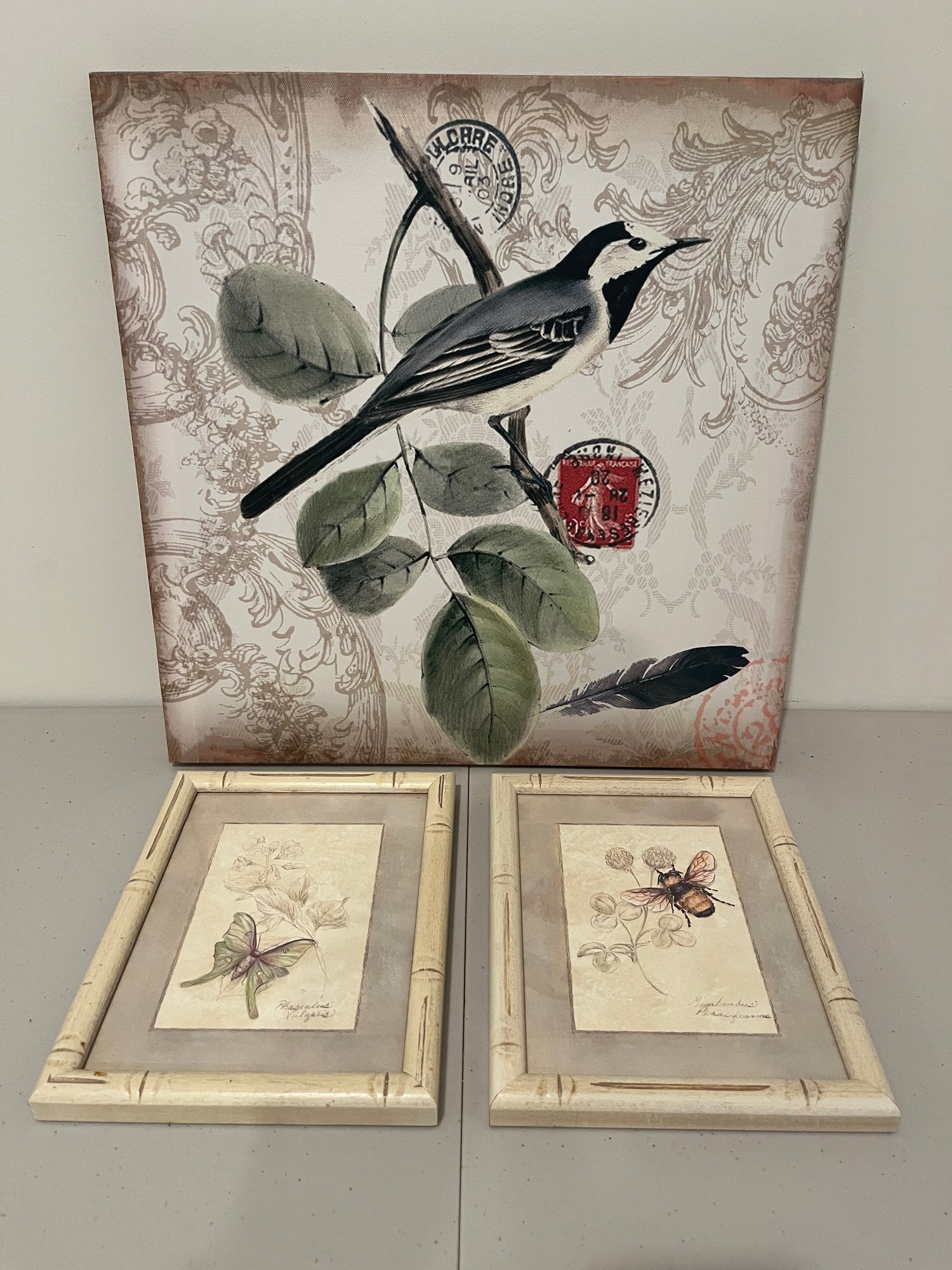 Hummingbird canvas measures 16 inches across by 16 inches high. Butterfly and bee measure 7 inches across by 9 inches high.