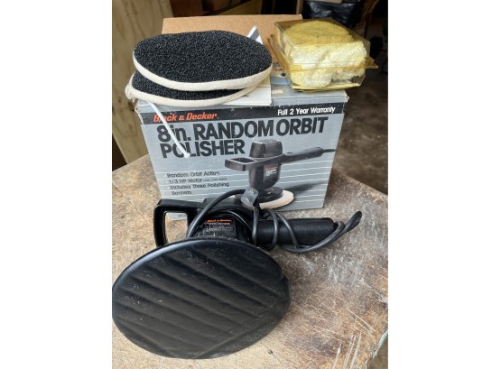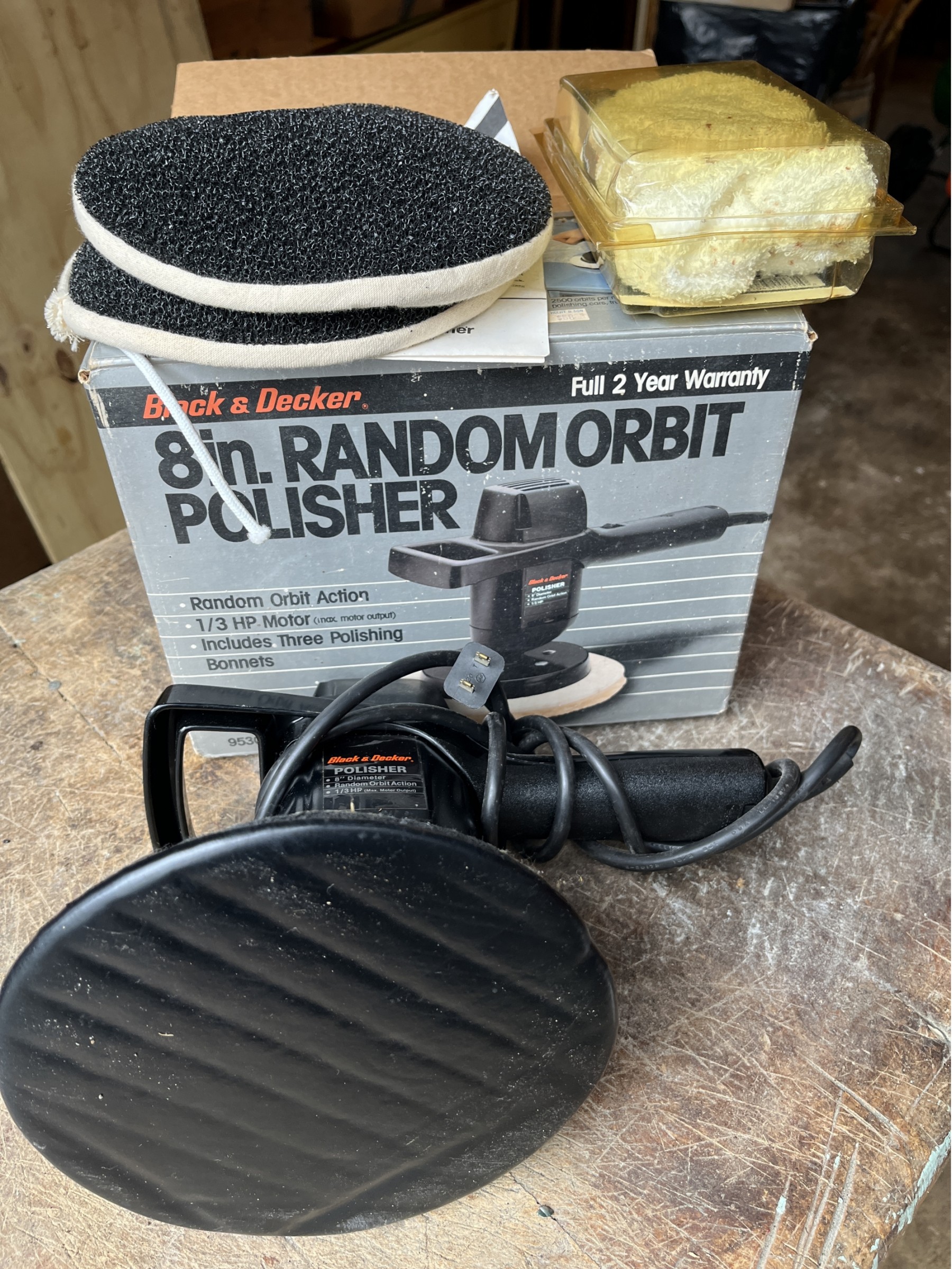 8 inch orbit polisher with two polishing bonnets. Operates as it should.