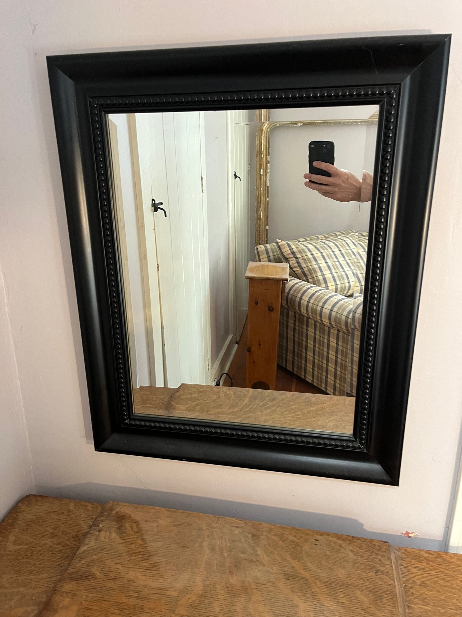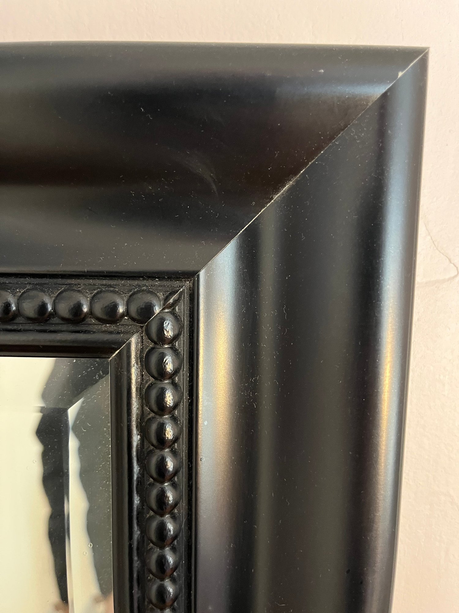 Black framed mirror featuring a traditional or classic design, characterized by a thick frame with decorative beaded molding along the inner edge.