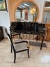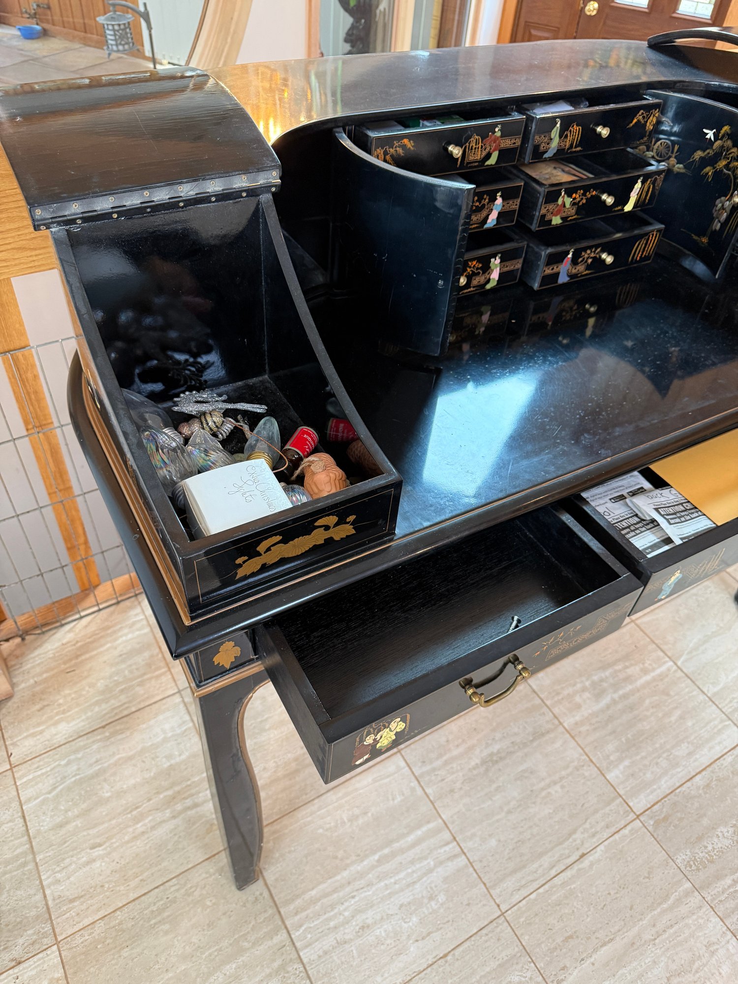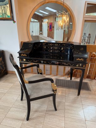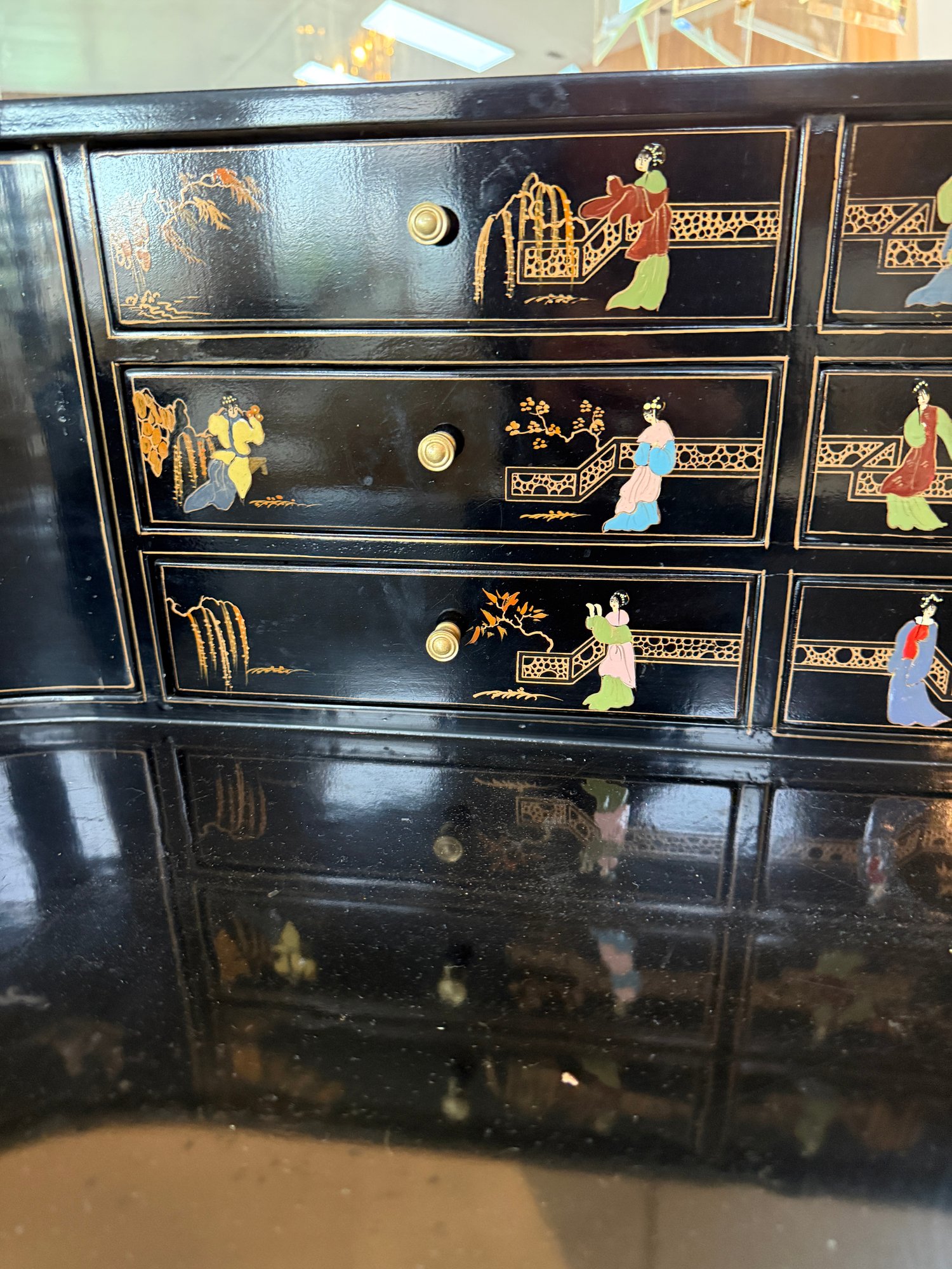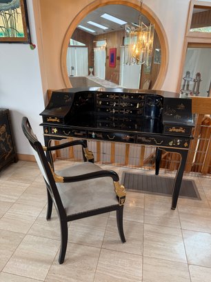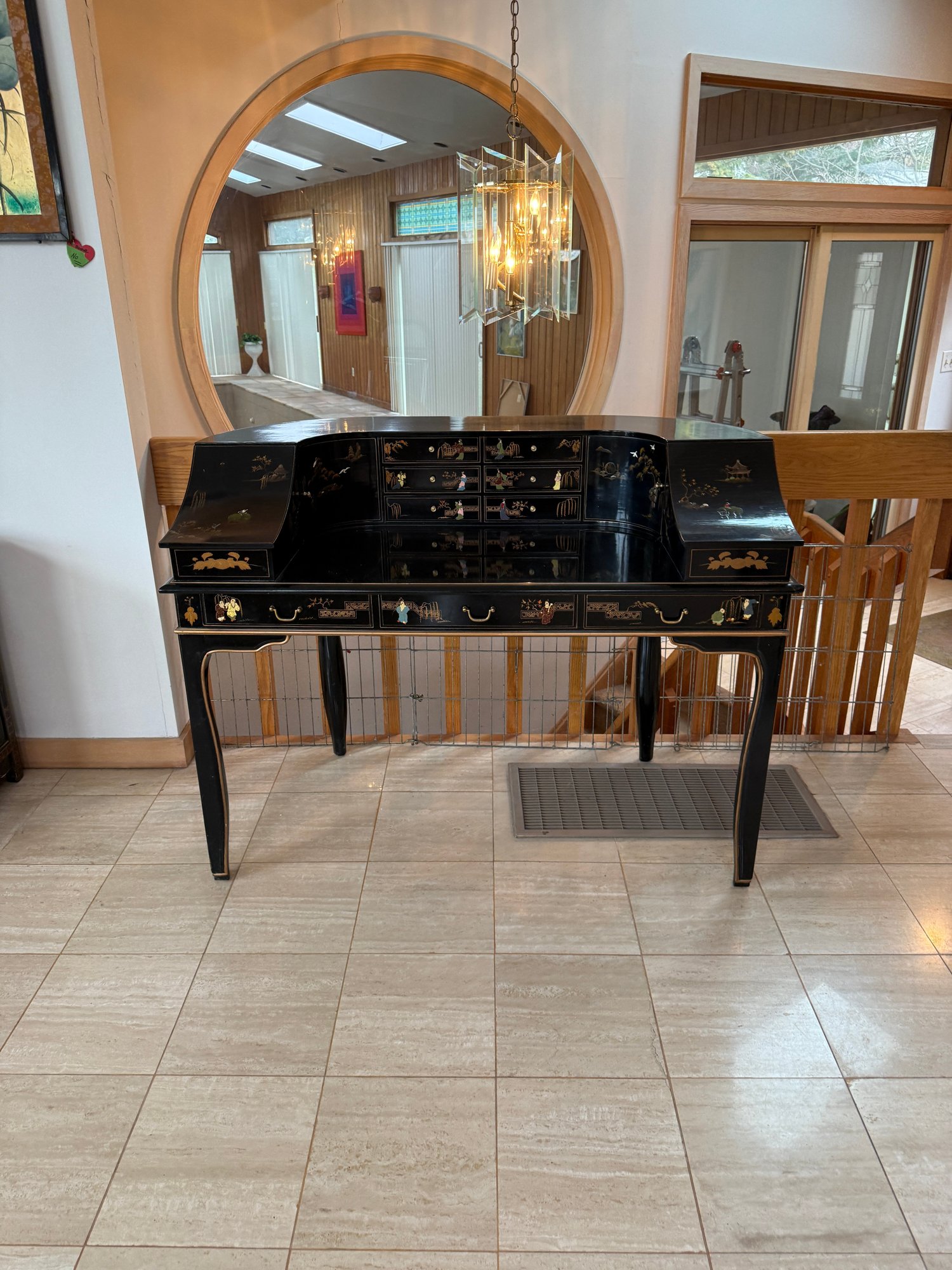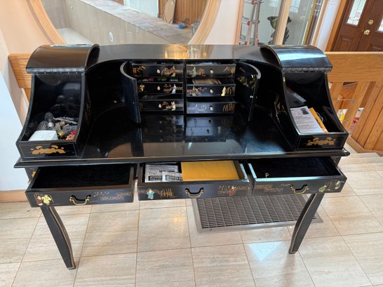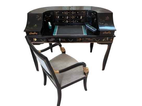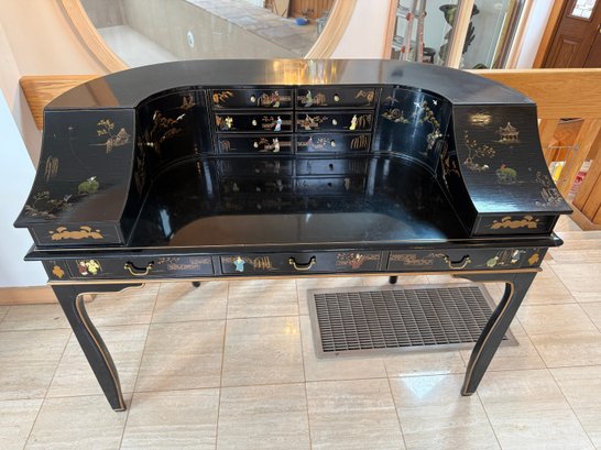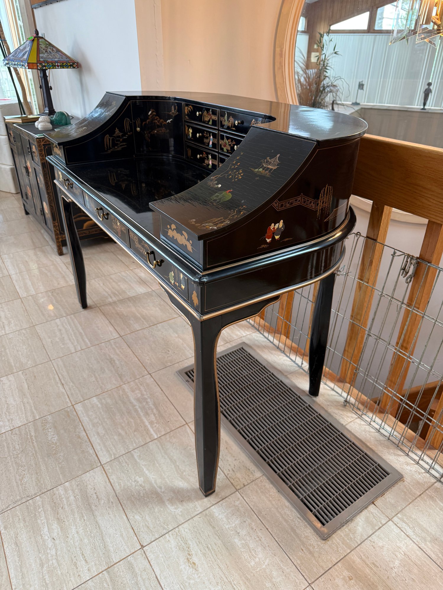 Black Lacquer Oriental Writing Desk featuring a classic Chinoiserie landscape. This piece is inspired by the 18th-century harpsichord style and is often referred to as a Carlton House desk.