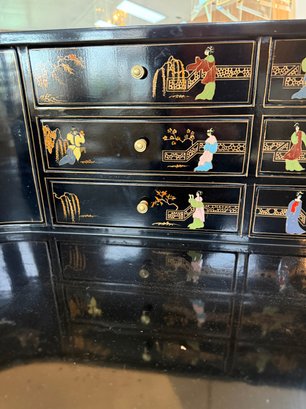 Details: Features a Chinoiserie scenery with hand-inlaid mother of pearl motifs.