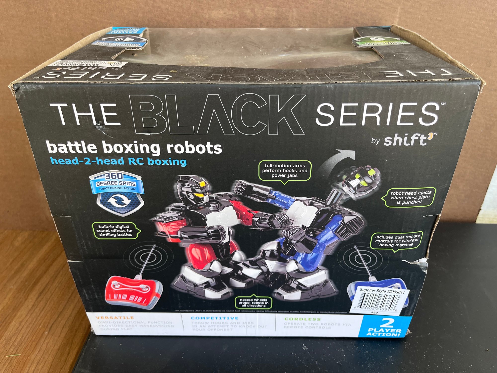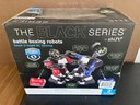 Features two remote-controlled robots (red and blue) for head-to-head competition.