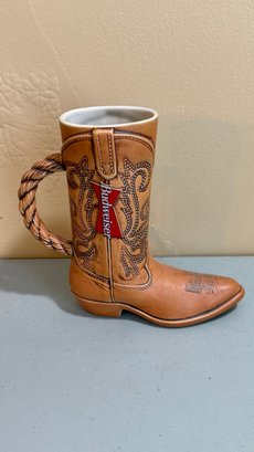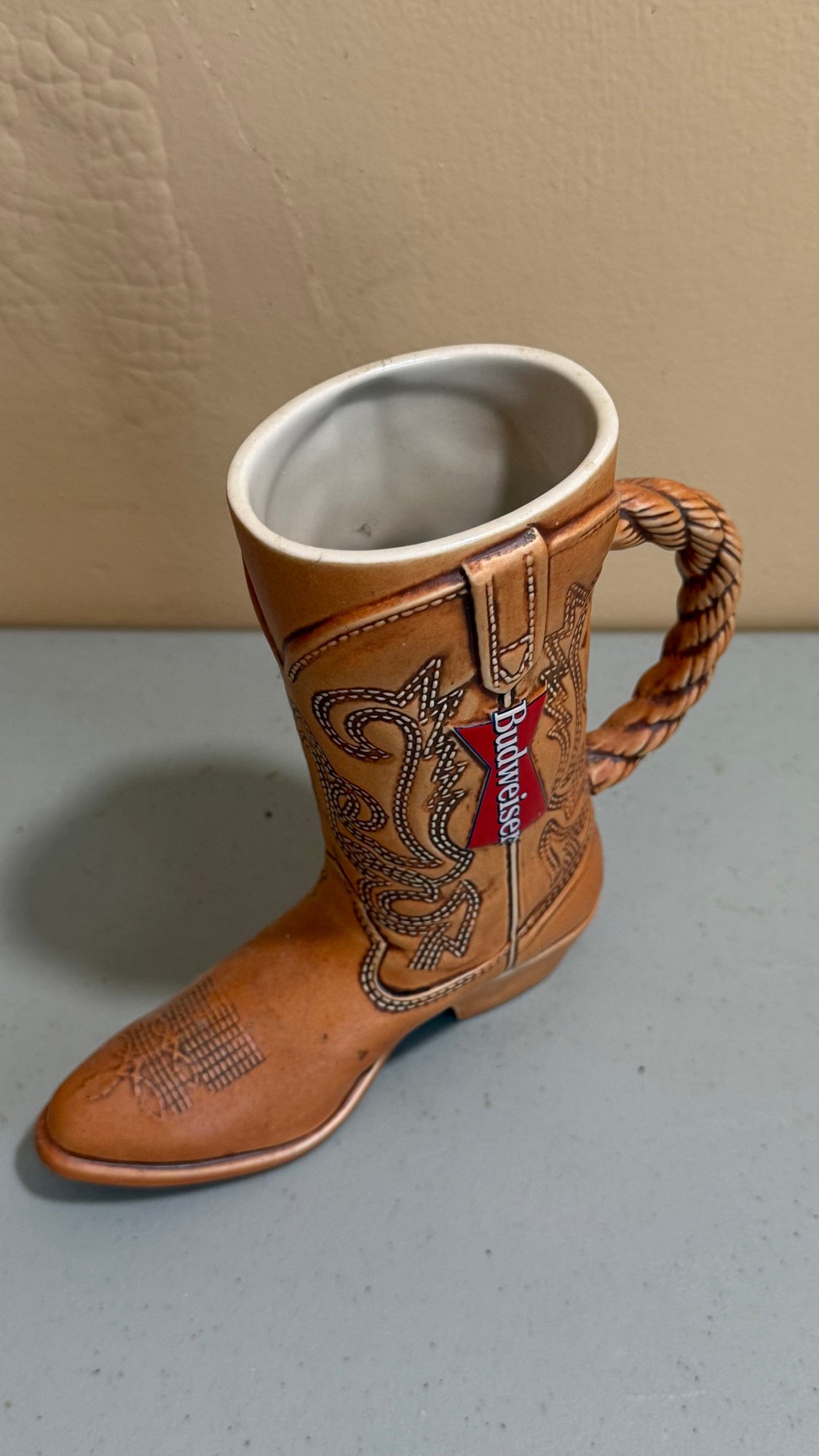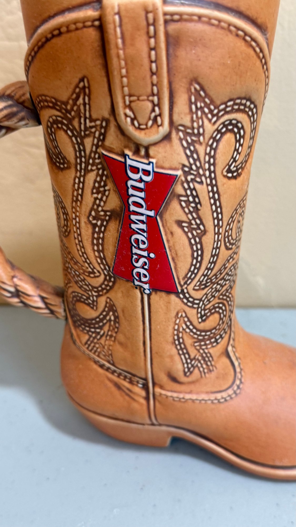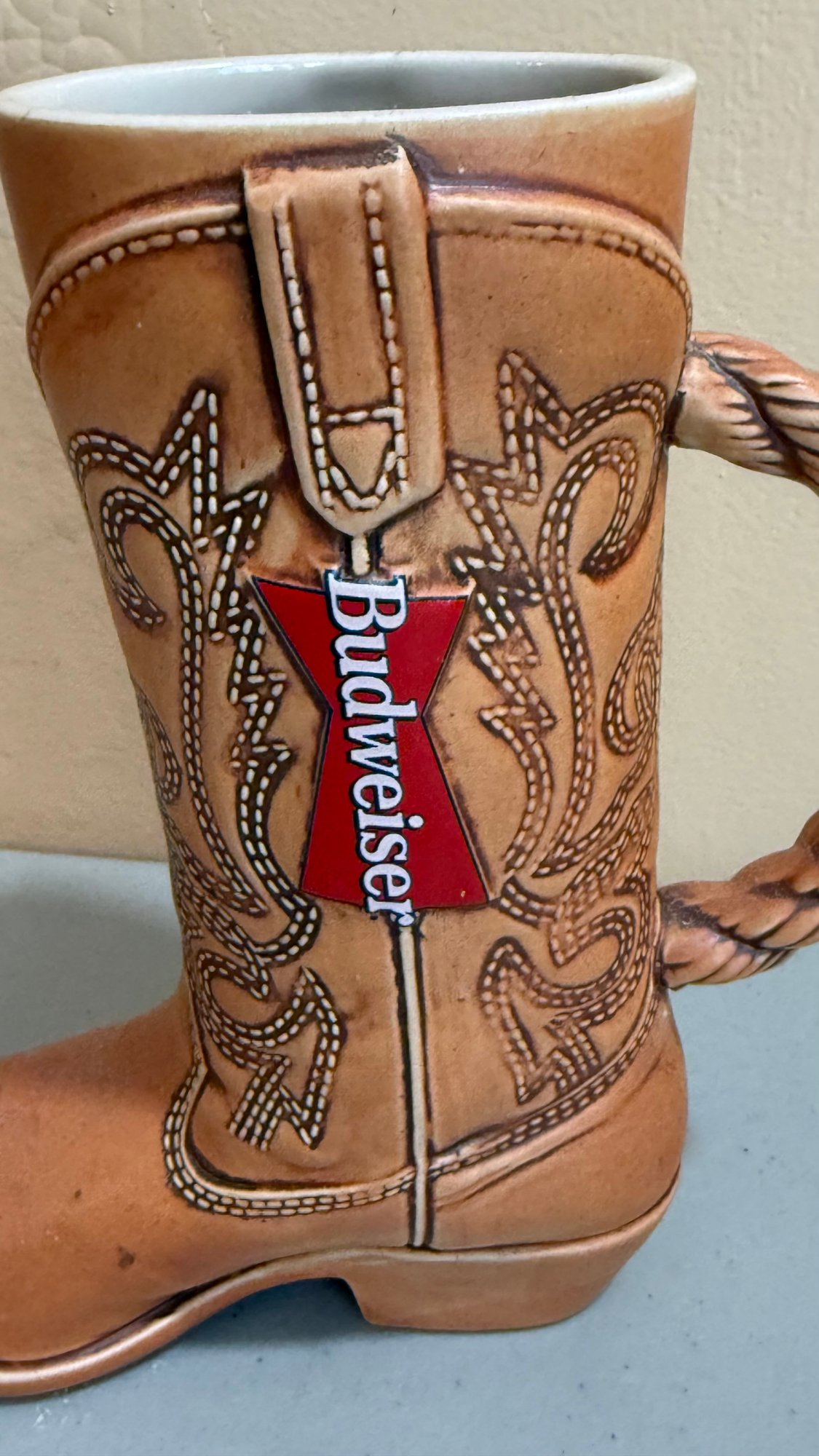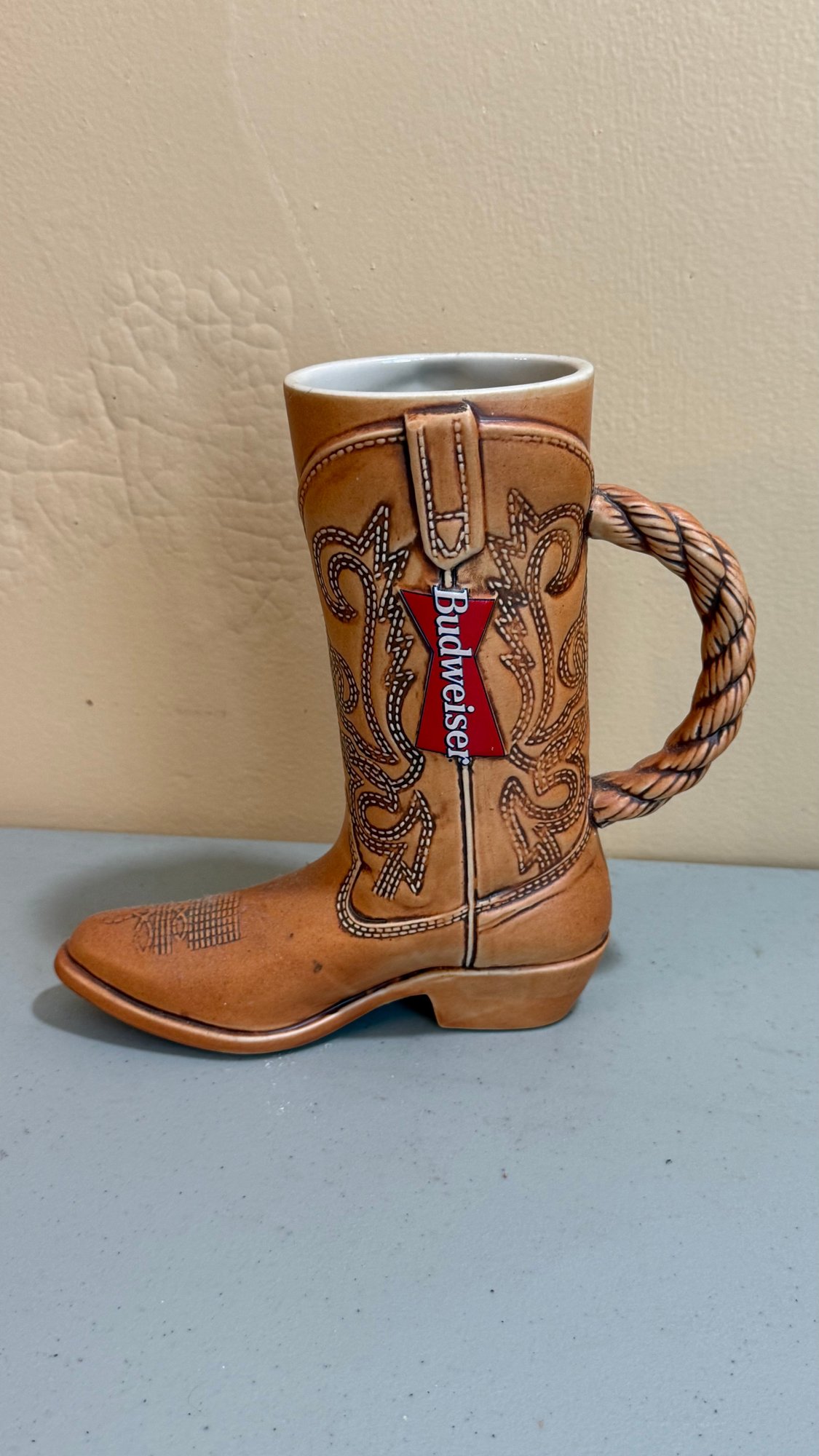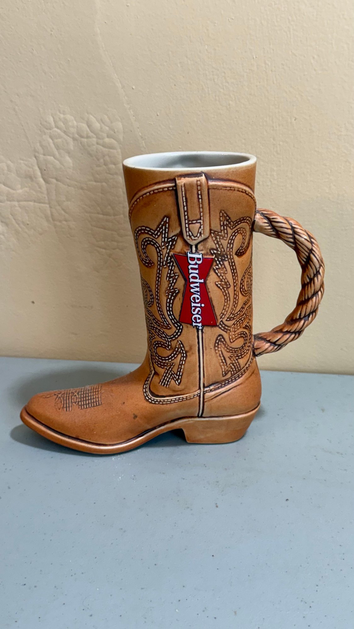 This Budweiser boot mug is a fun, nostalgic collectible that works as a drinking glass or a display piece for home bars, man caves, or Budweiser memorabilia collections. Its iconic boot shape makes it a standout item for any beer lover.