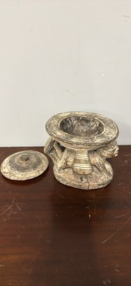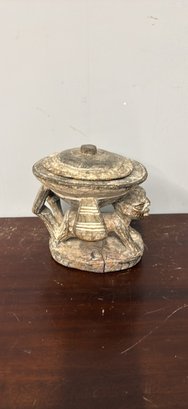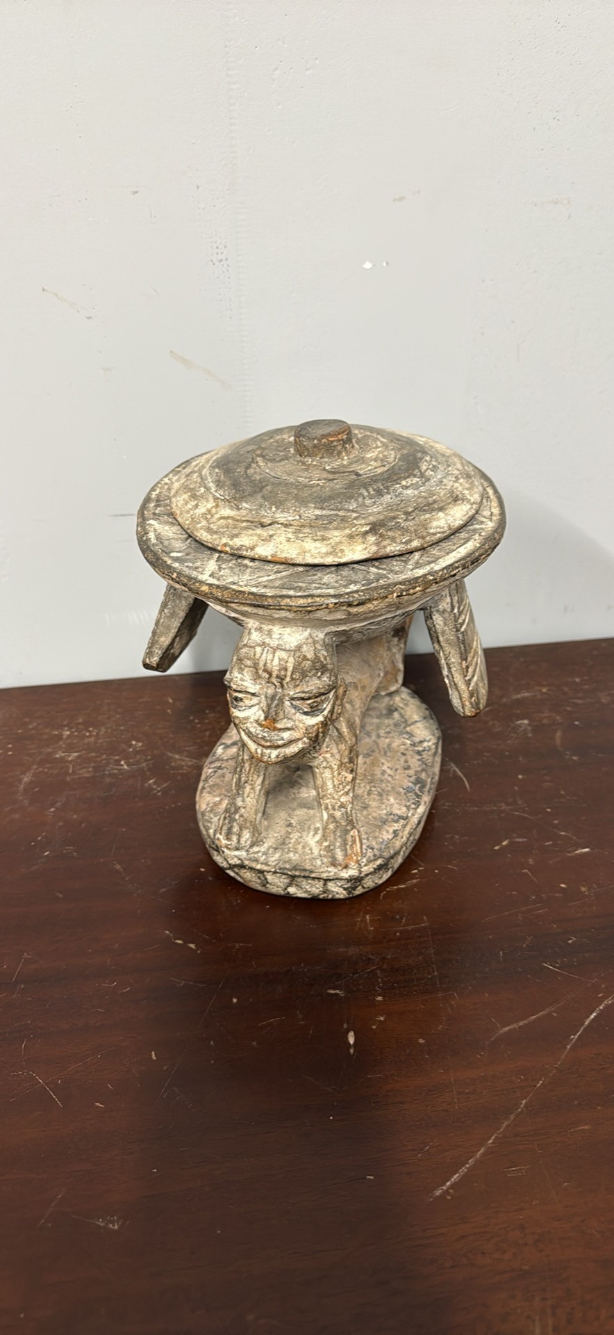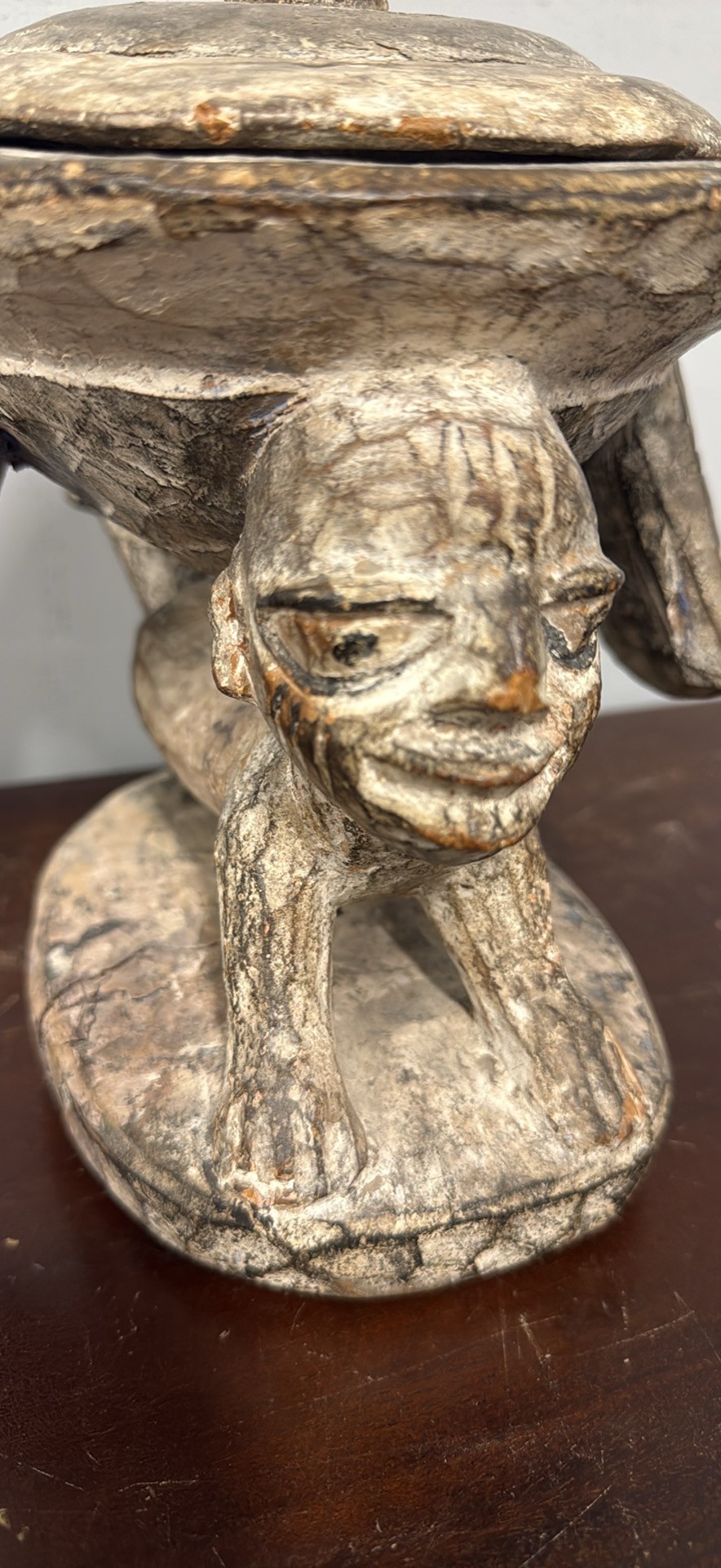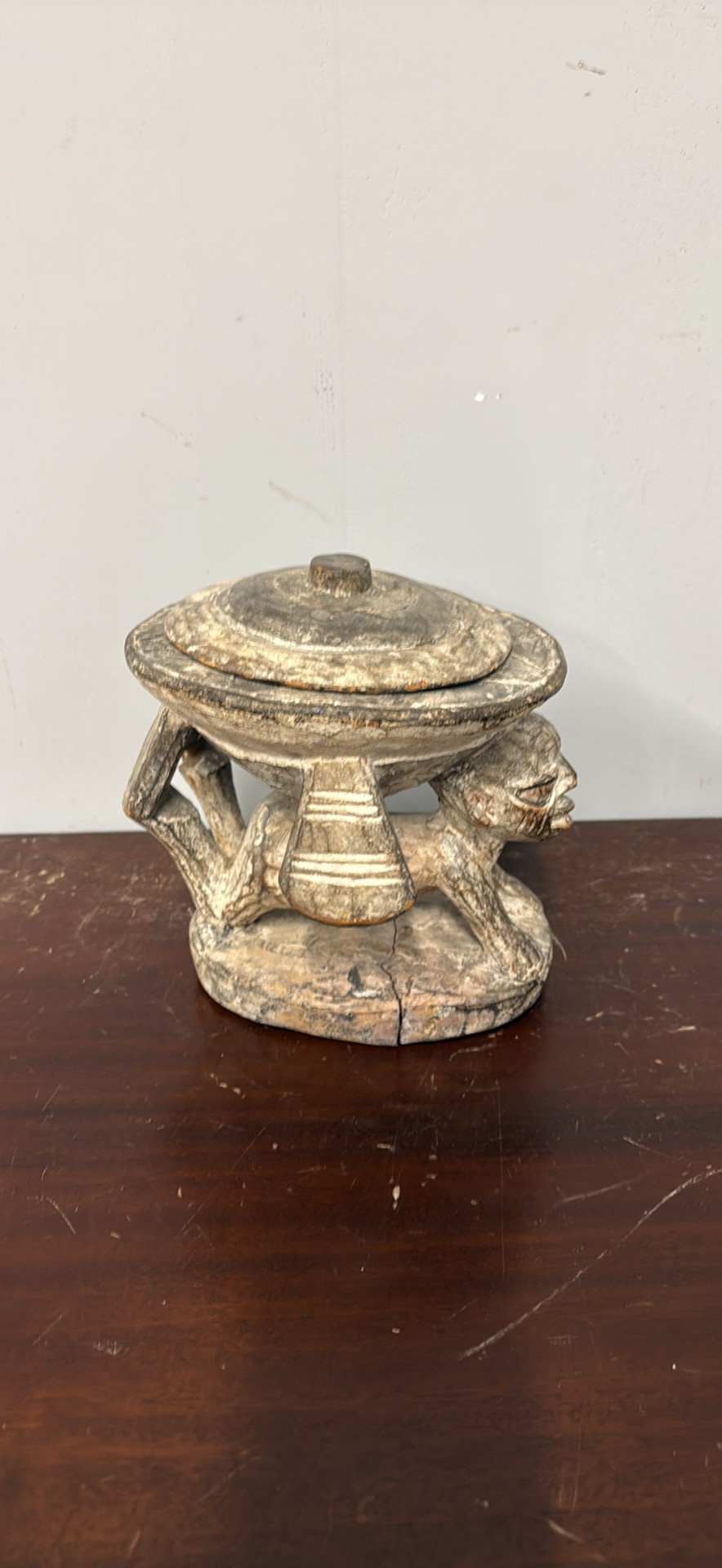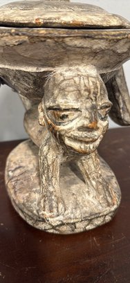 Unique hand-carved wooden piece. Features a cool figure holding up the top. Great for adding a unique touch to your home.