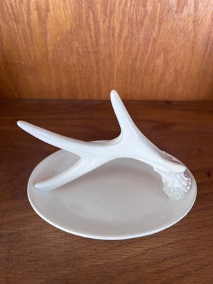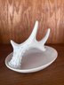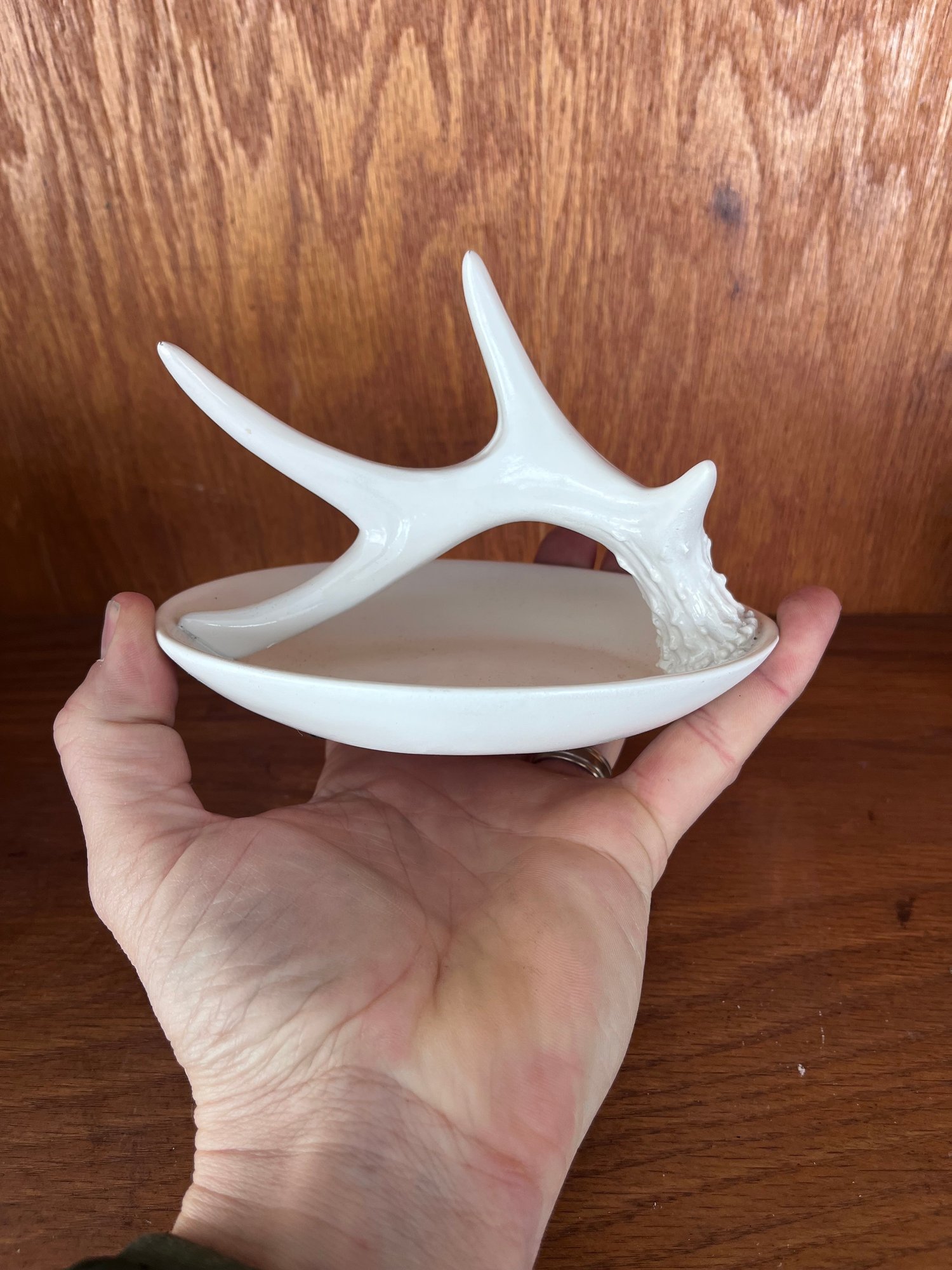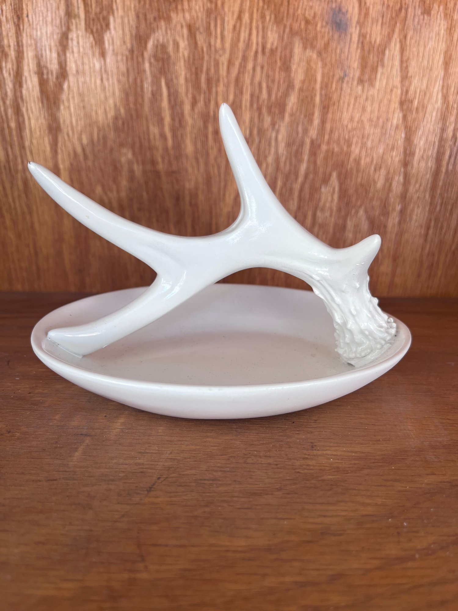 Ceramic antler trinket or jewelry dish. It is a popular home decor item designed to hold small items like rings, earrings, keys, or loose change. The raised antlers often serve as a post for organizing rings.