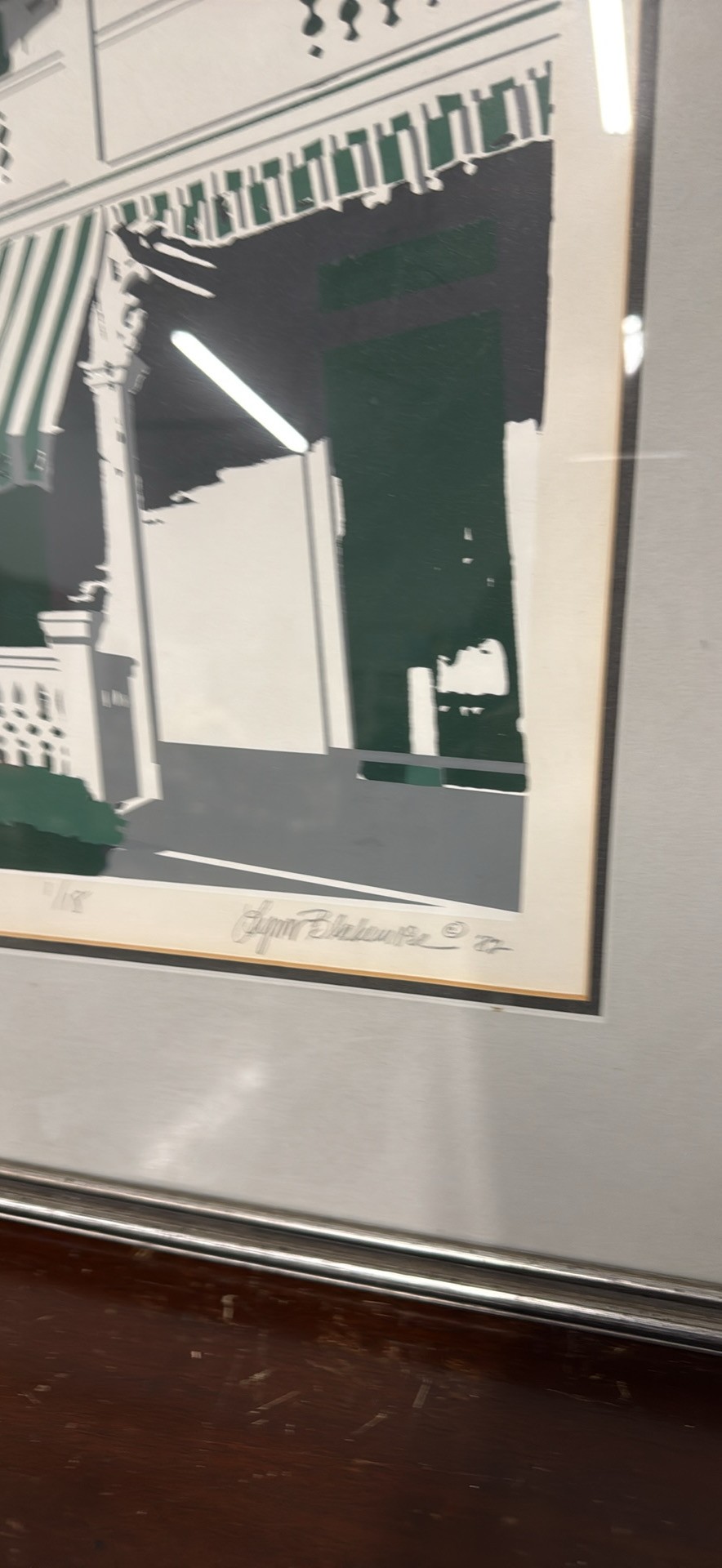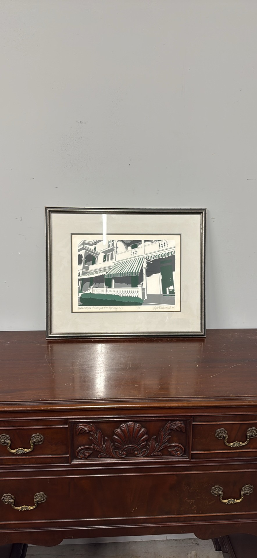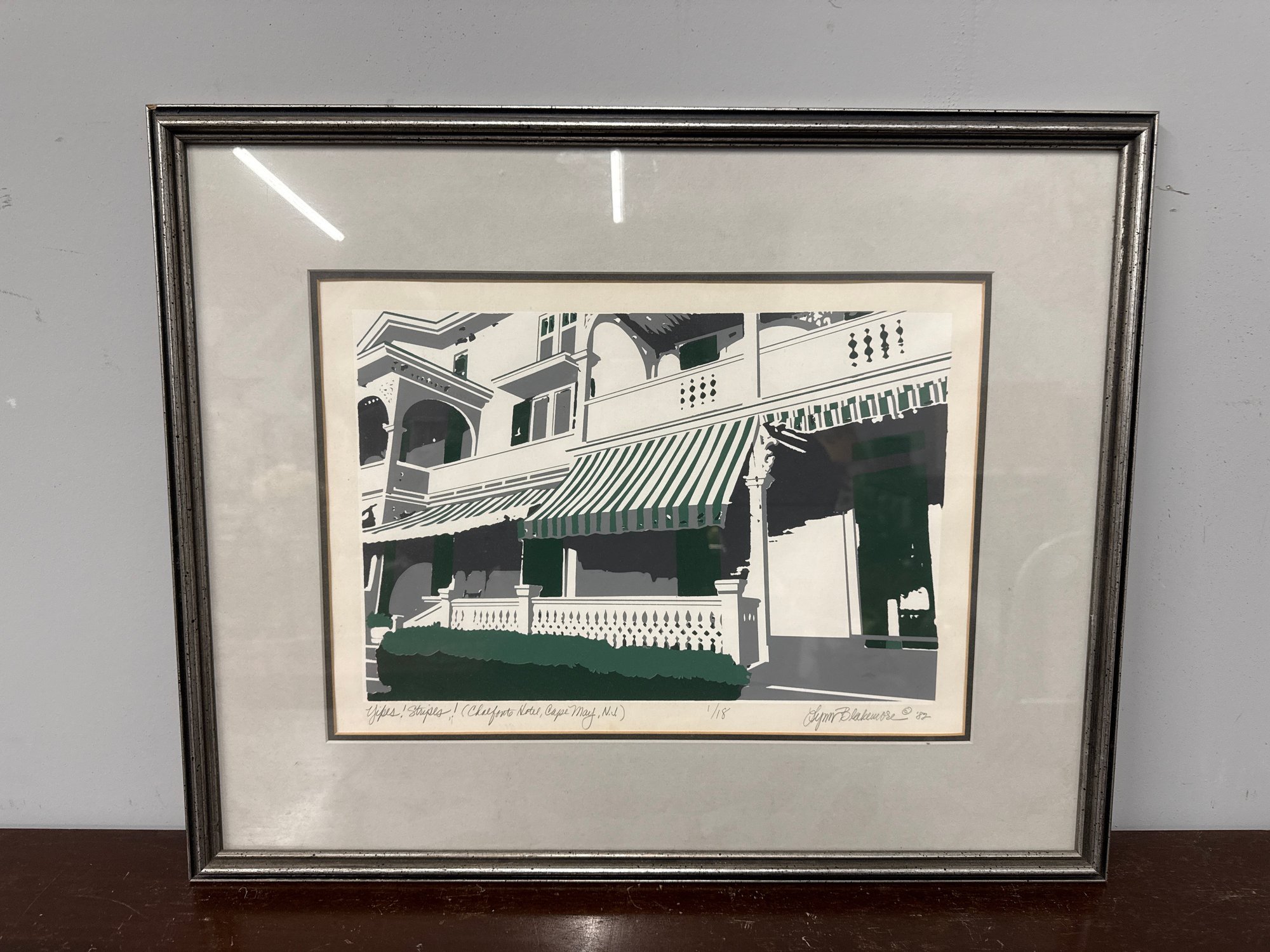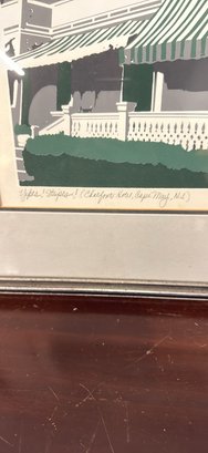 Vintage framed art print by Lynn Blakemore ‘82. Has a cool depiction of the Chalfonte Hotel in Cape May, NJ, with those classic green and white striped awnings. Dated 1987.