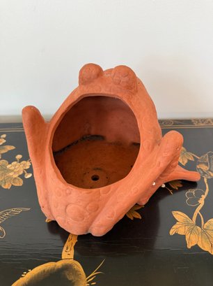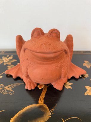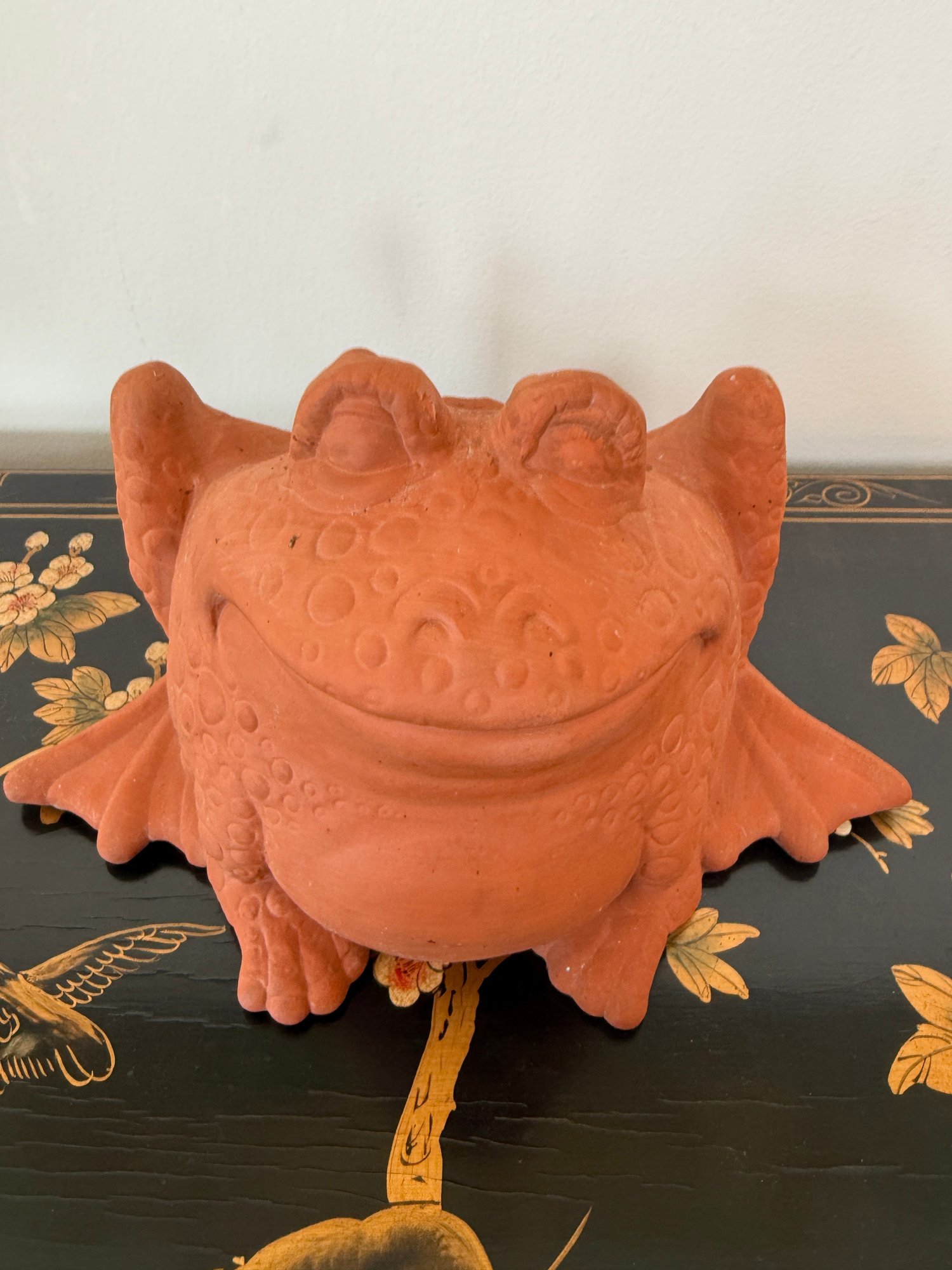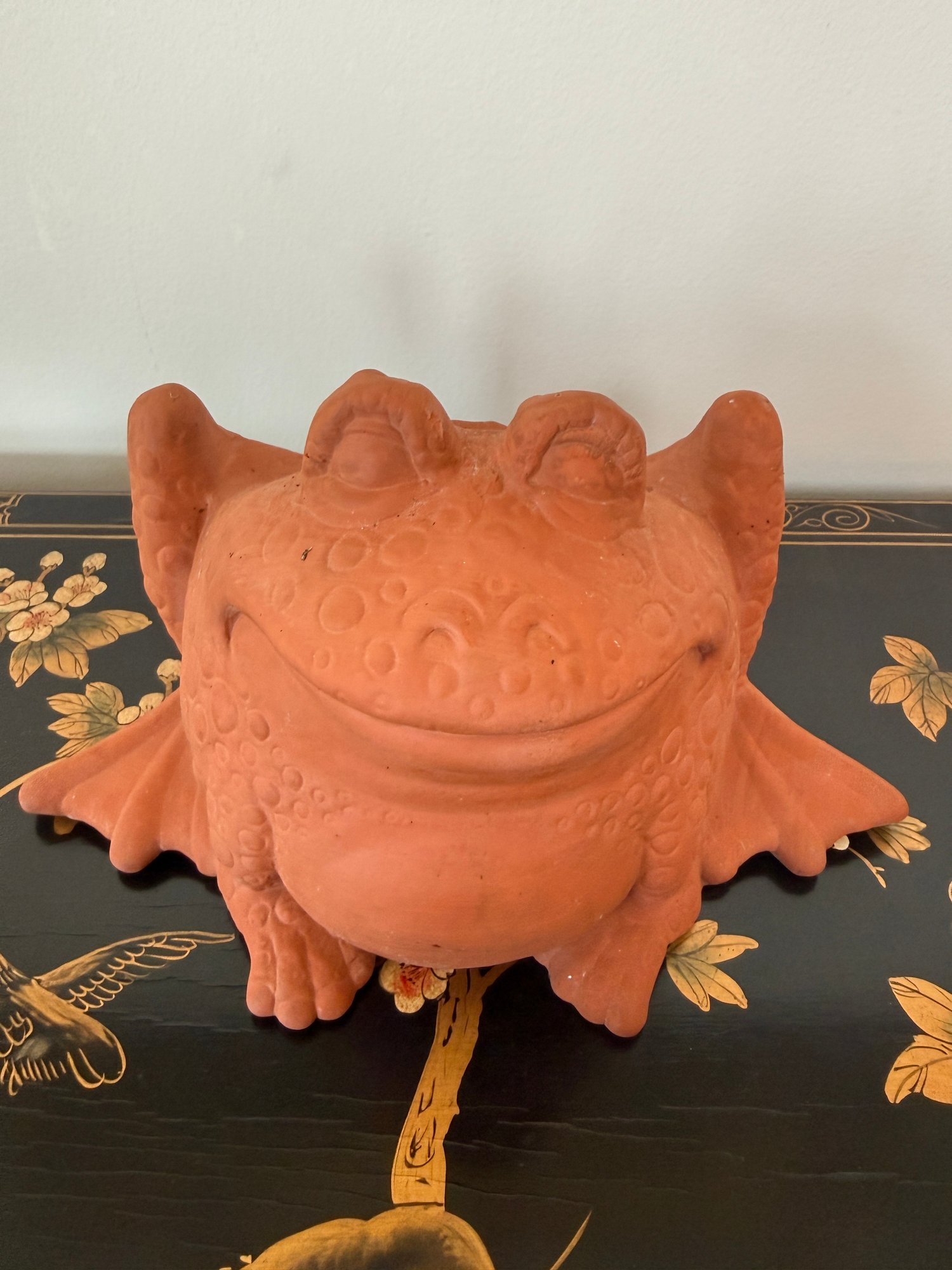 Charming terracotta frog figurine features a rustic, hand-sculpted look with a wide, friendly smile and unique bat-like wings. Its earthy orange-brown hue and textured "skin" make it a perfect addition to any garden, patio, or eclectic indoor shelf.
