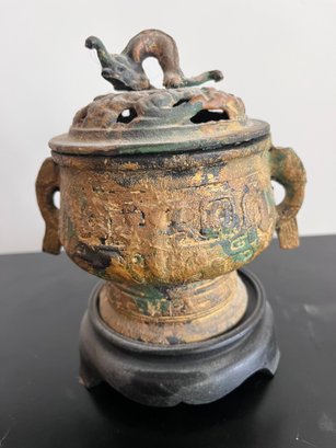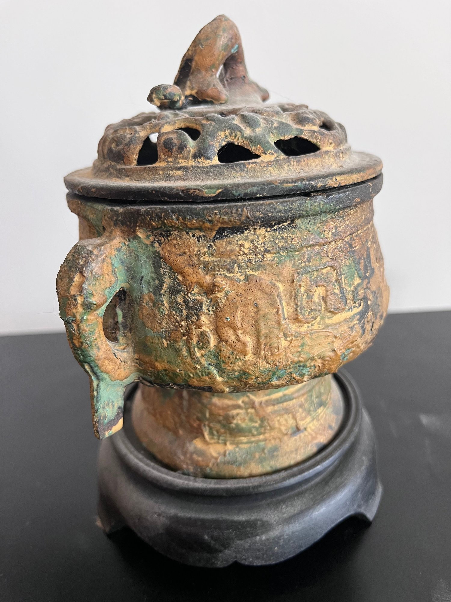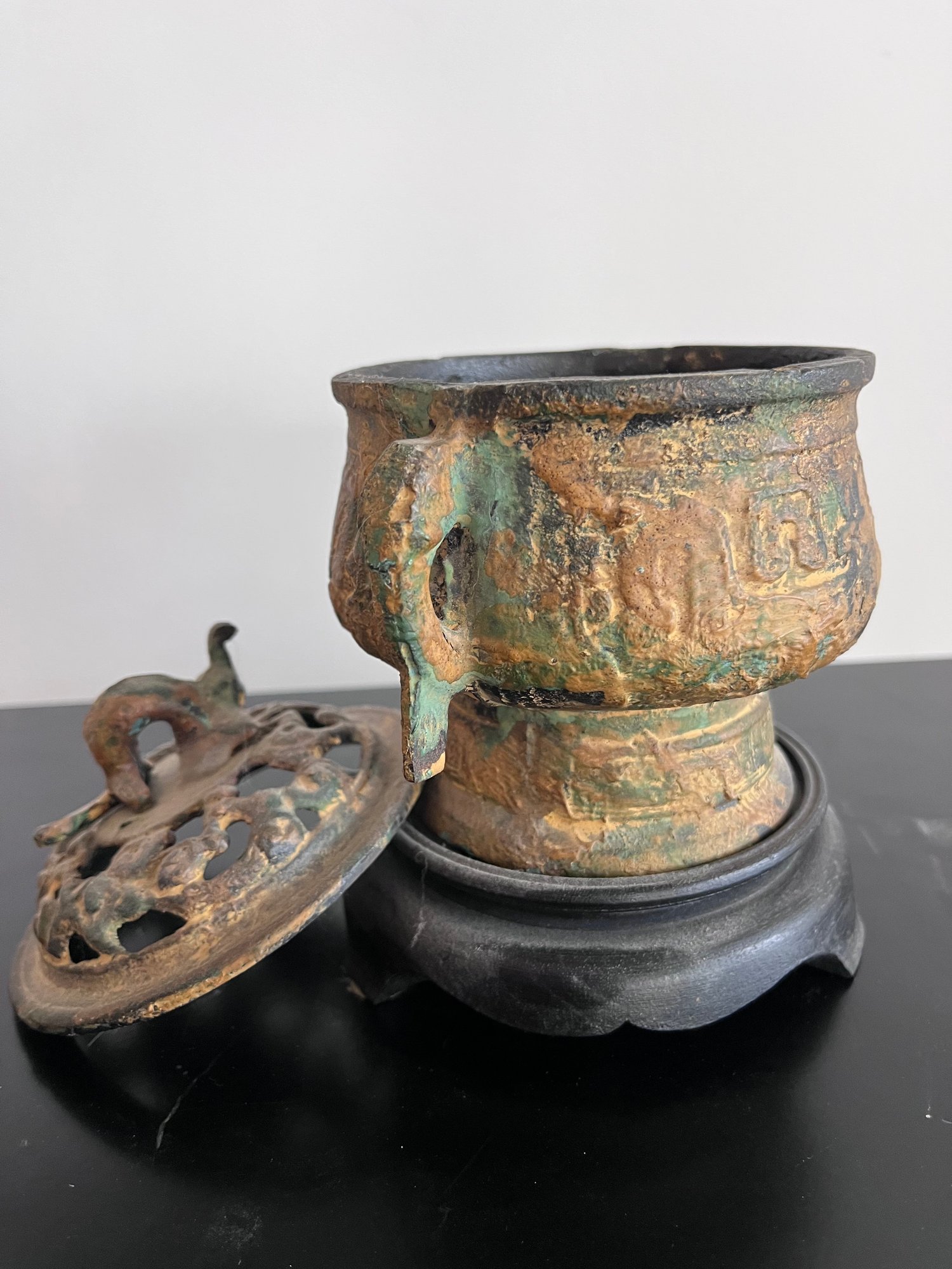 Chinese iron figural dragon incense burner censer, featuring a lid with a decorative cut-out and a beast or serpent figurine on top.