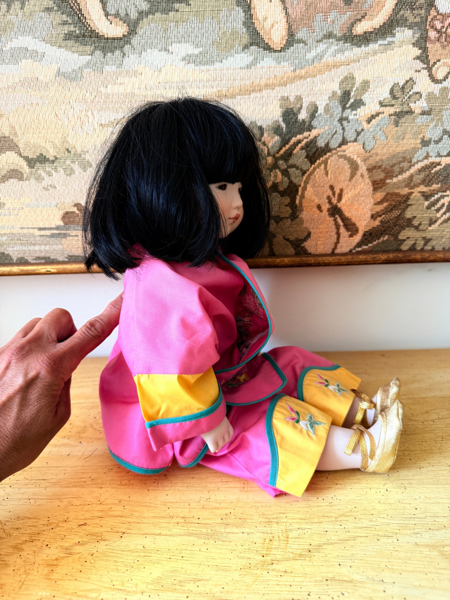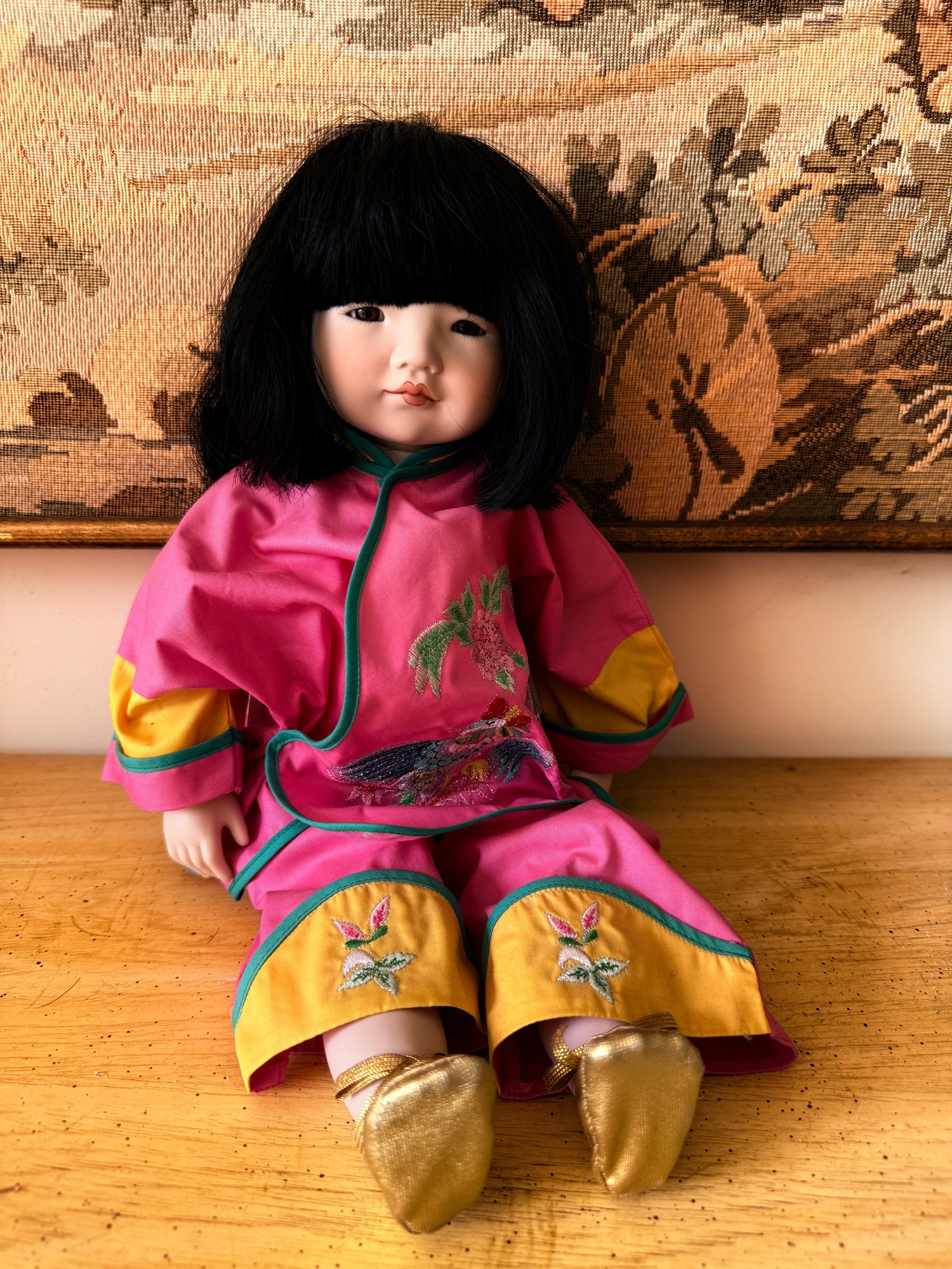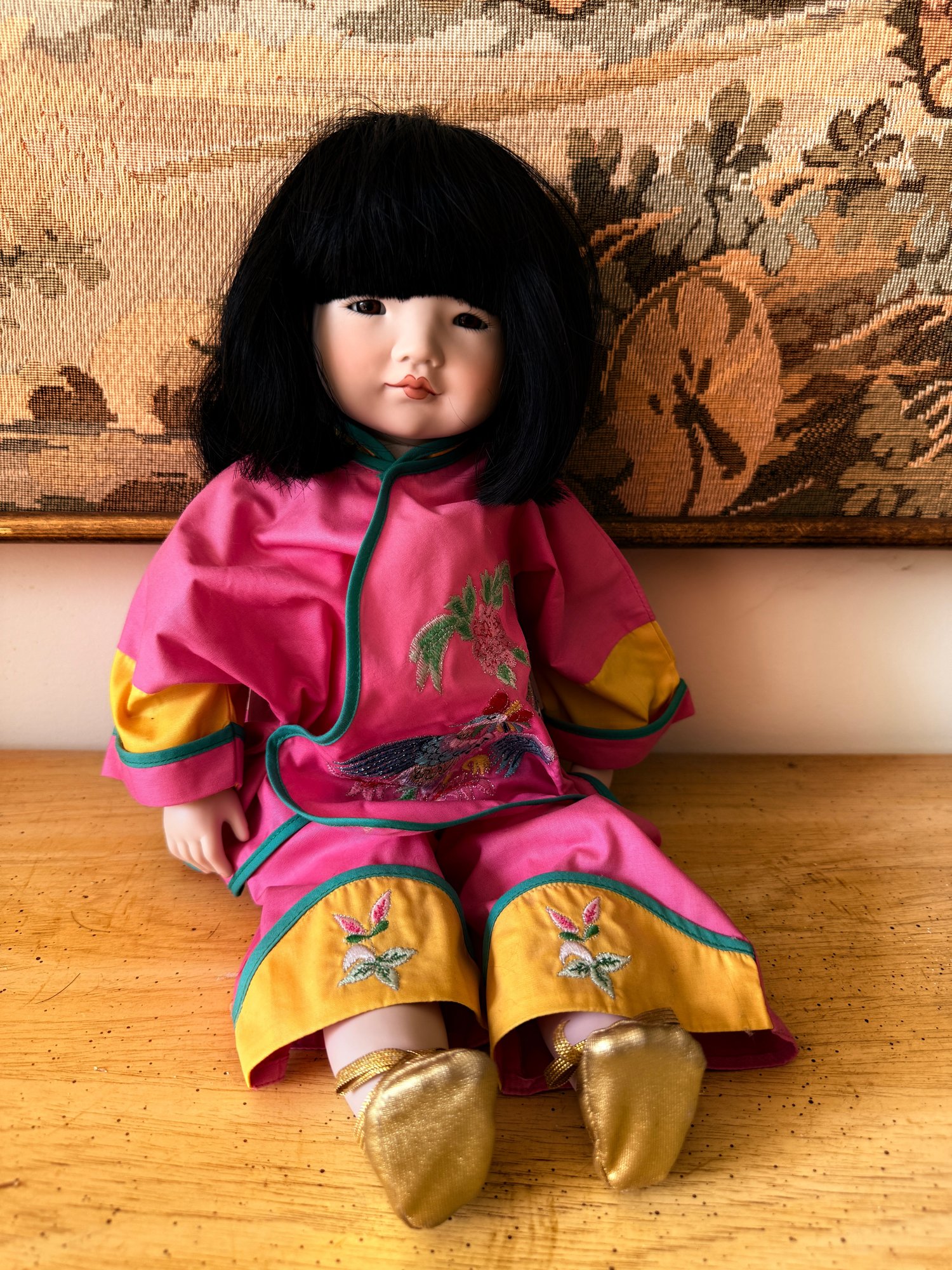 Collectable porcelain doll, "Lan Tau" model from the Dolls by Pauline collection, dressed in a traditional pink and yellow Chinese outfit.