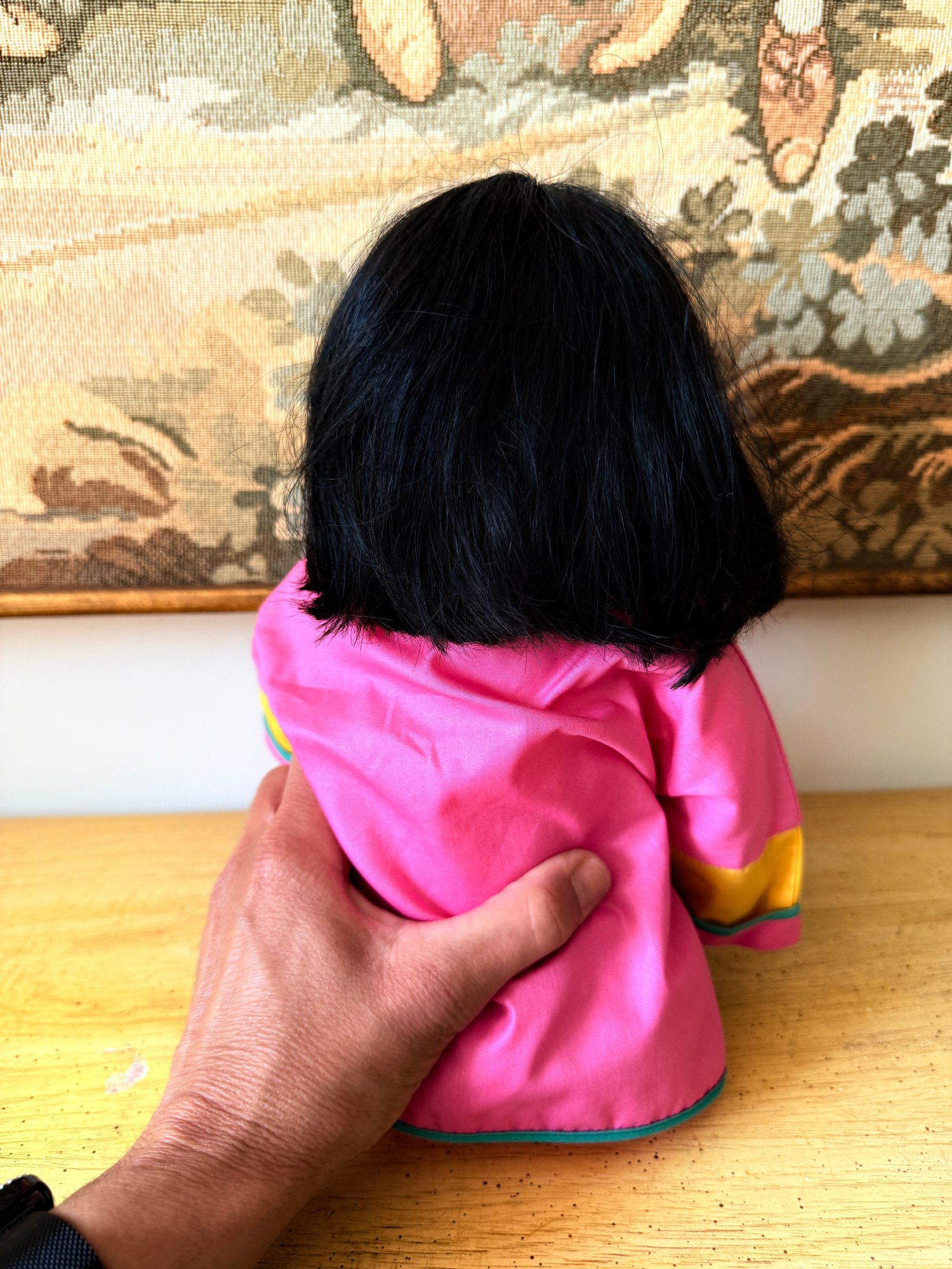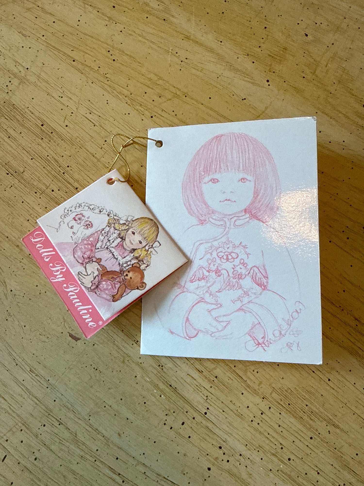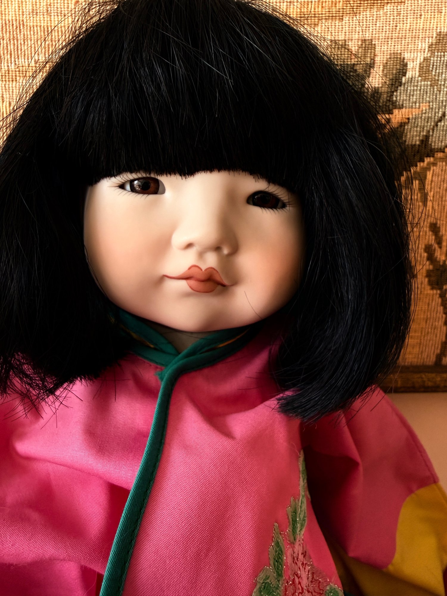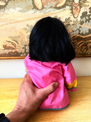 Collectable porcelain doll, "Lan Tau" model from the Dolls by Pauline collection, dressed in a traditional pink and yellow Chinese outfit.