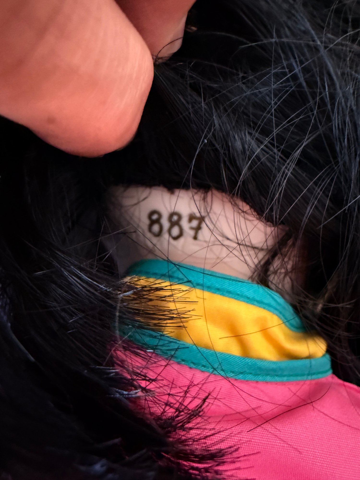 Embroidered clothing with bird motifs, gold shoes, and black hair.