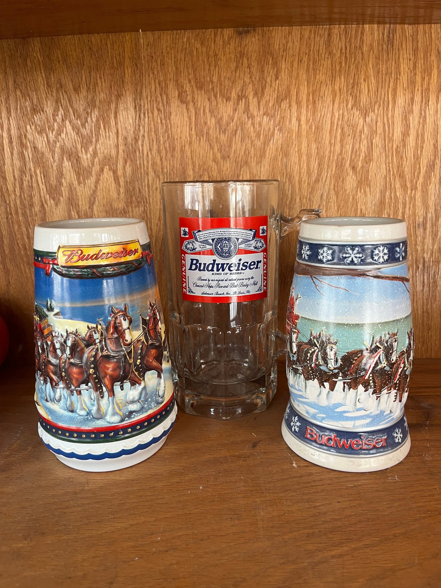 The steins featured are part of the Budweiser Holiday Stein series, which showcases iconic scenes of the Clydesdale horses.