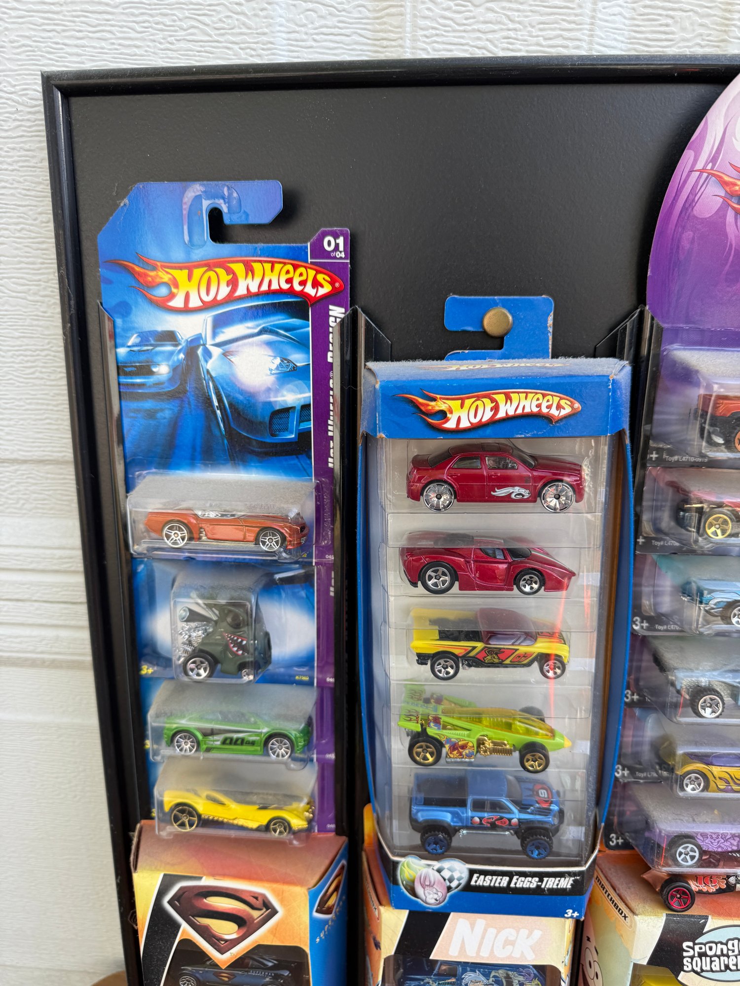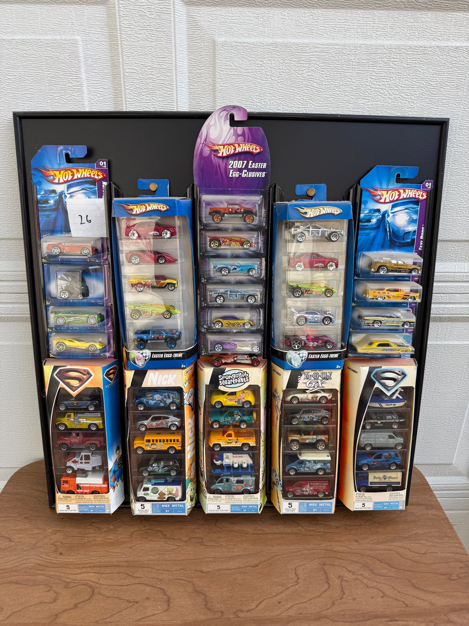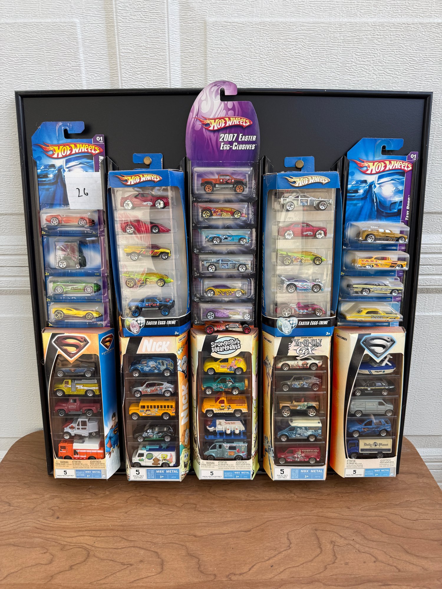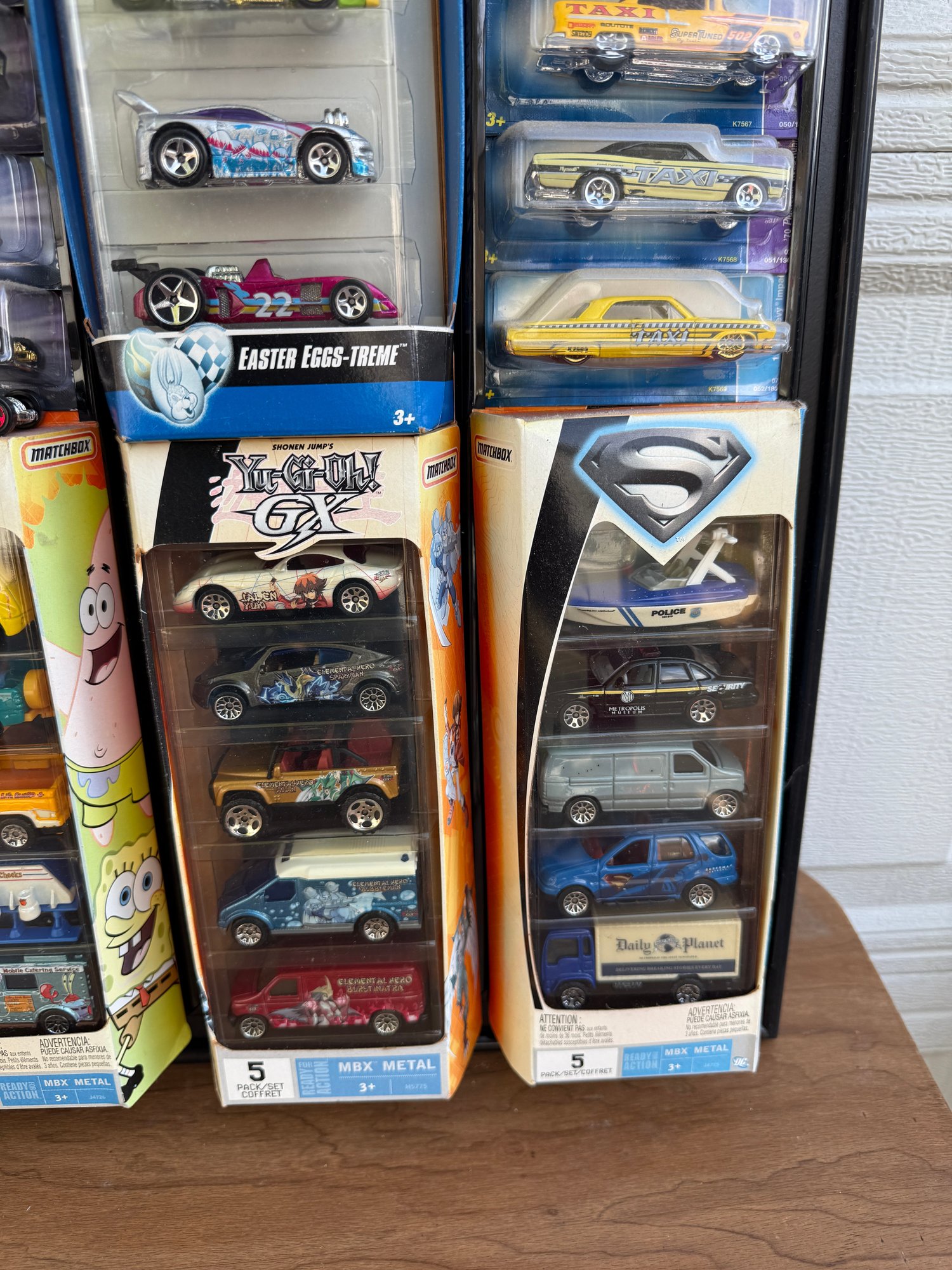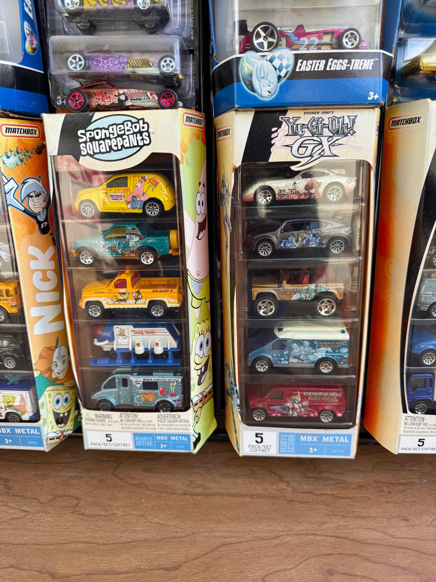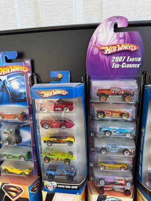 Collection of Hot Wheels 5-pack sets, including the specifically branded 2007 Easter Egg-Clusives sets and various themed packs from that era.