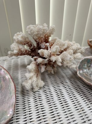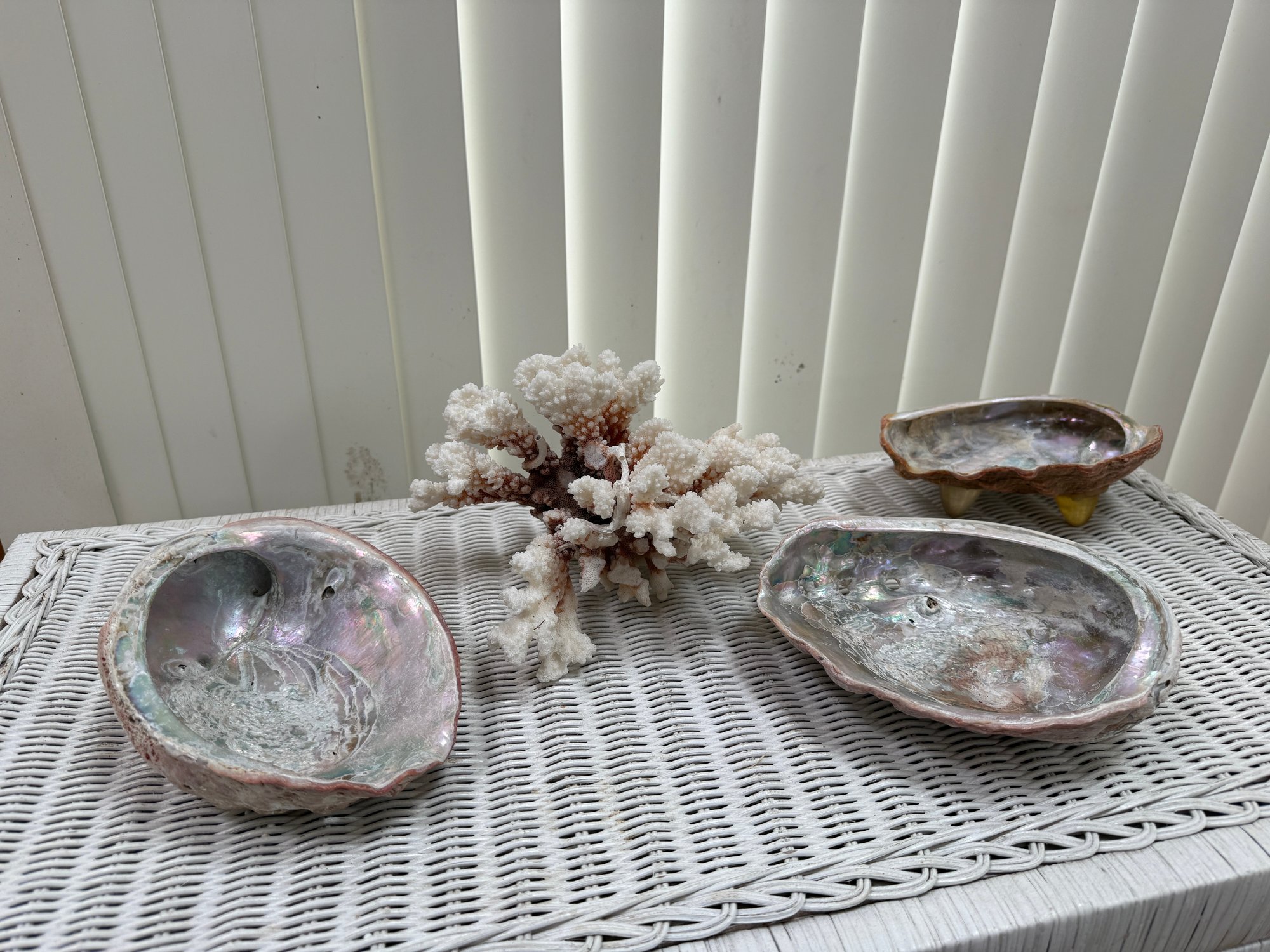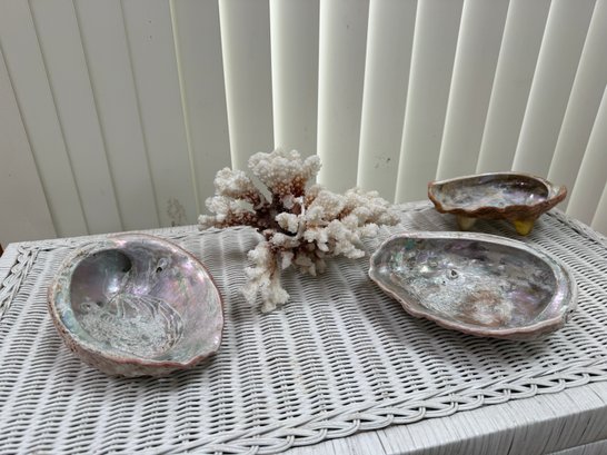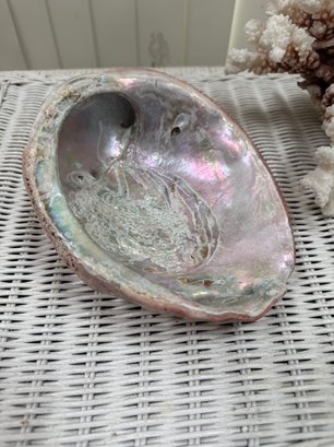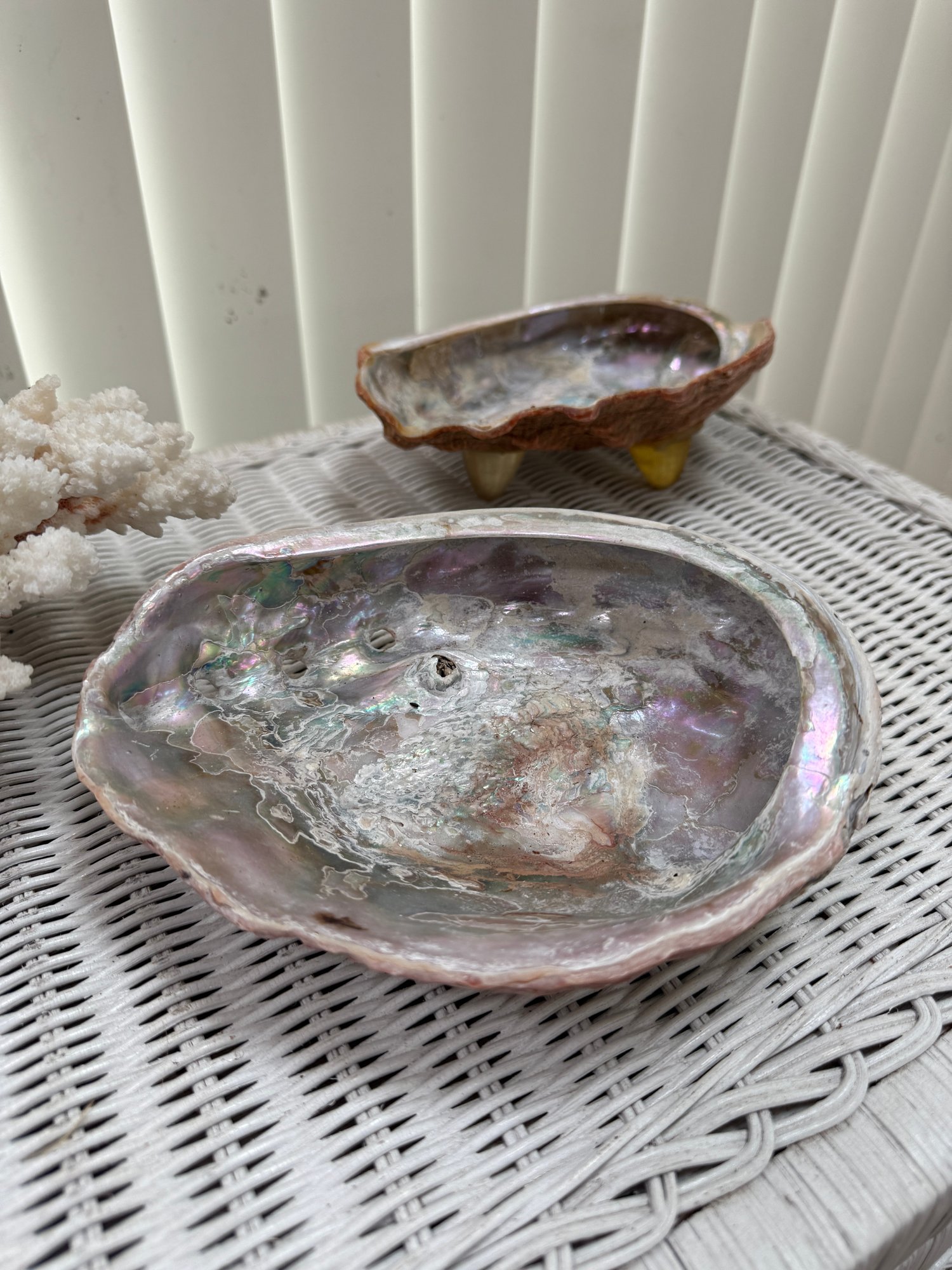 collection of polished abalone shells, with one shell functioning as a trinket dish on small golden feet. These iridescent shells, known for their multicolored sheen, are often used for decorative purposes, smudging rituals, or holding small jewelry.