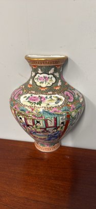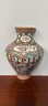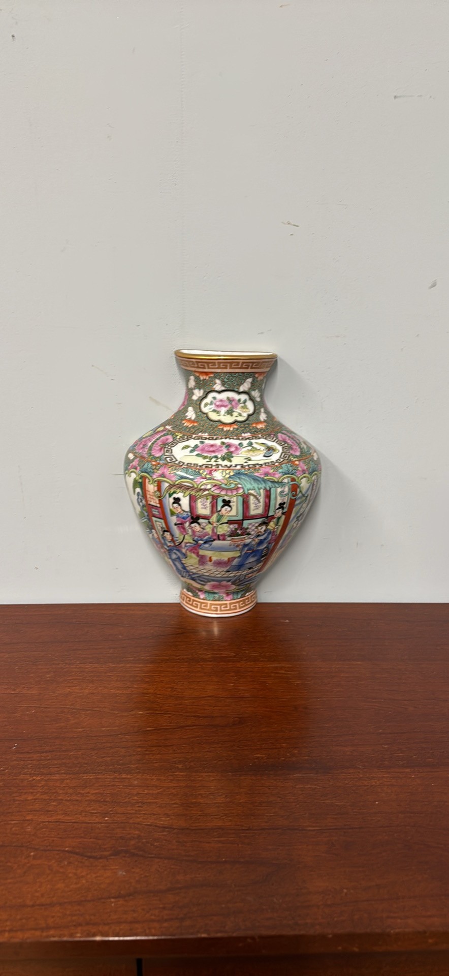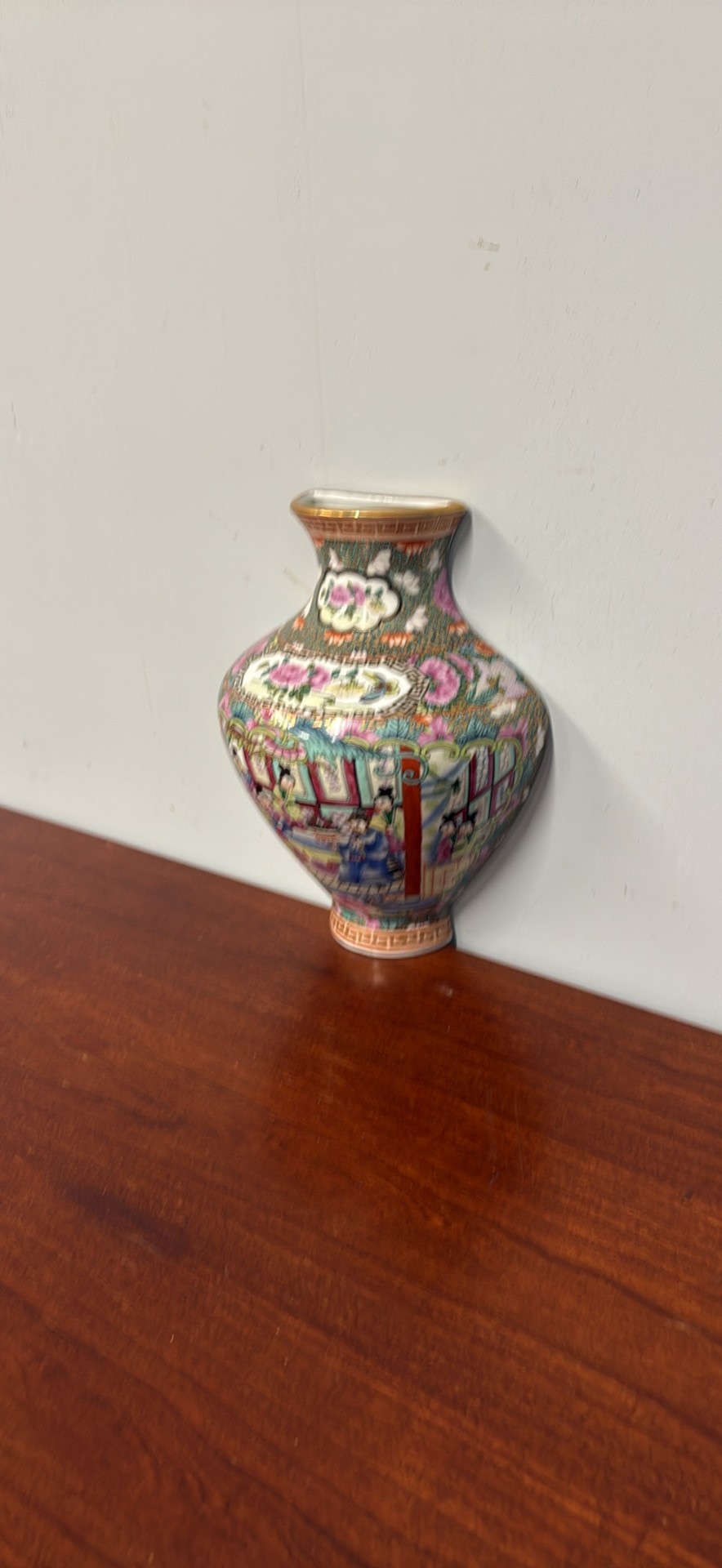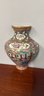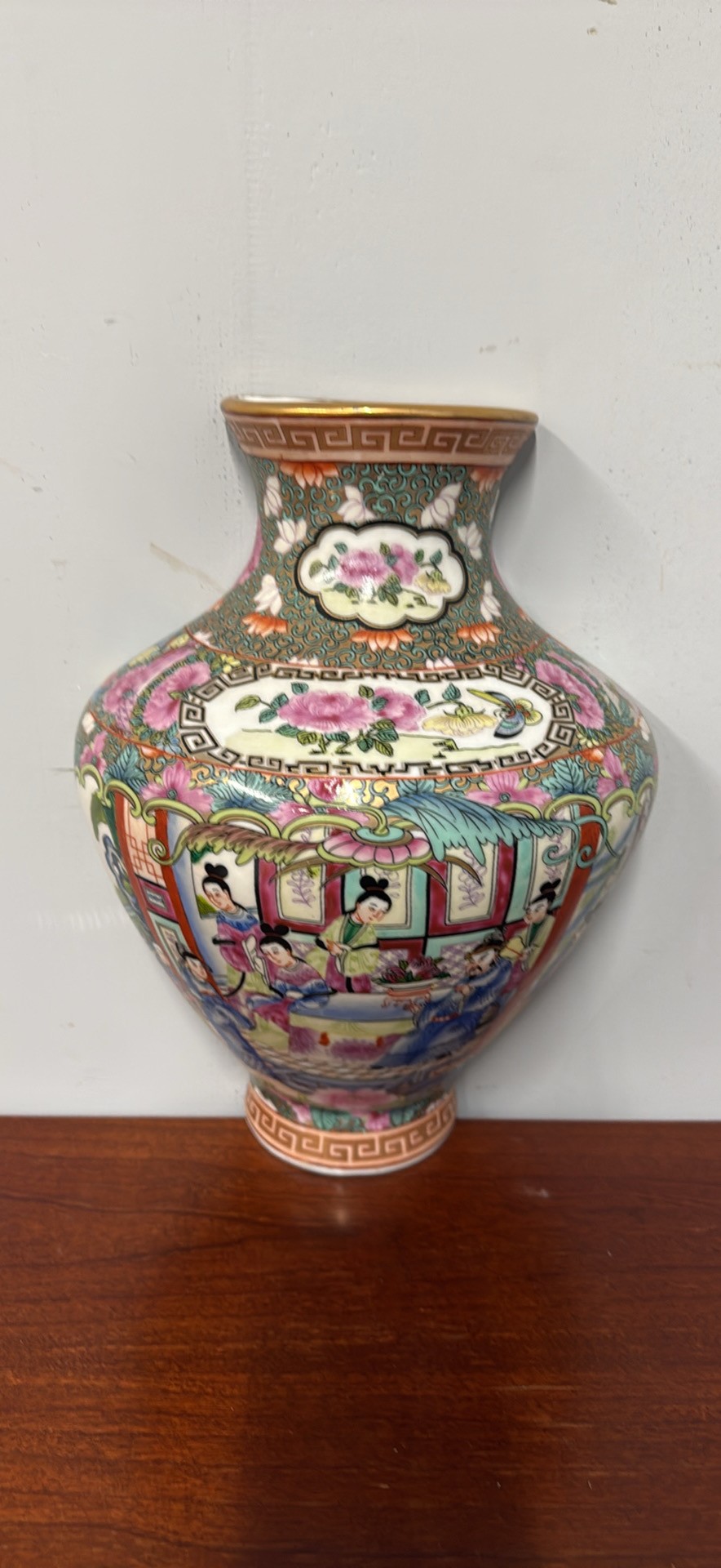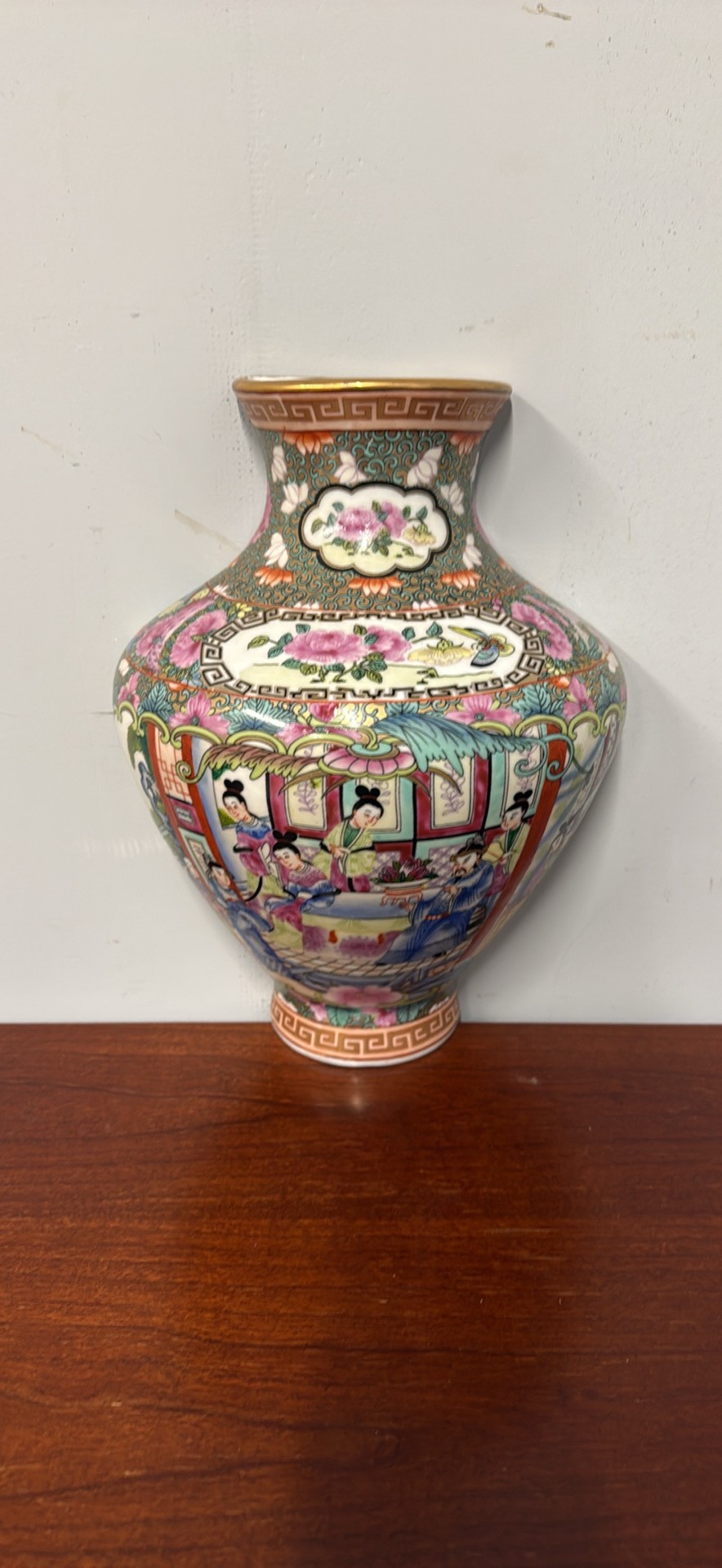Colorful vase with intricate floral designs and figures. Has vibrant pink, green, blue, and gold colors. Great decorative piece.