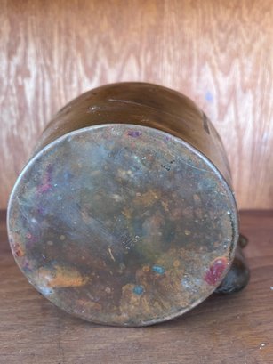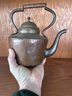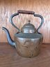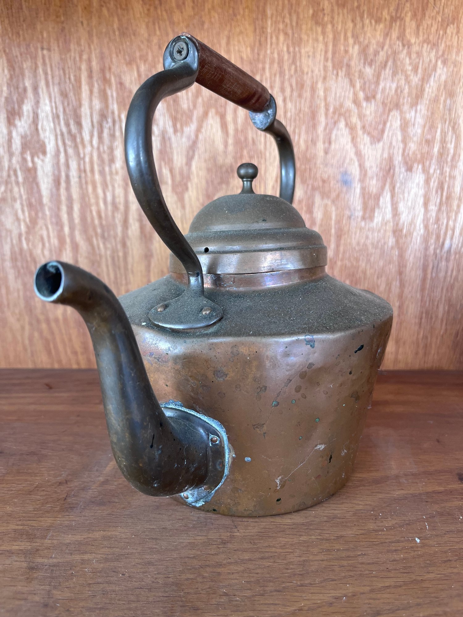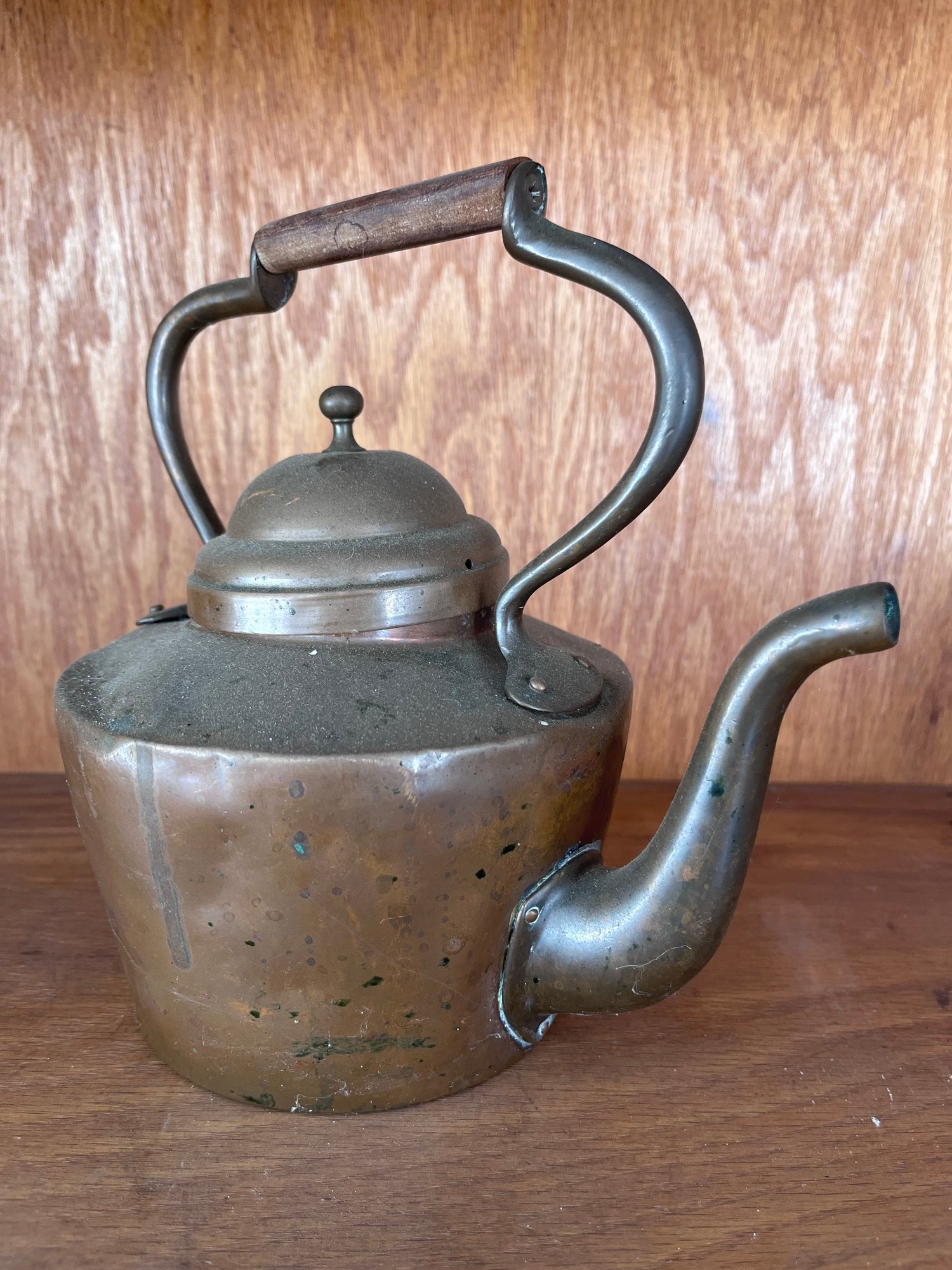 The kettle shows significant wear, dents, and a rich patina, indicating its age and use.