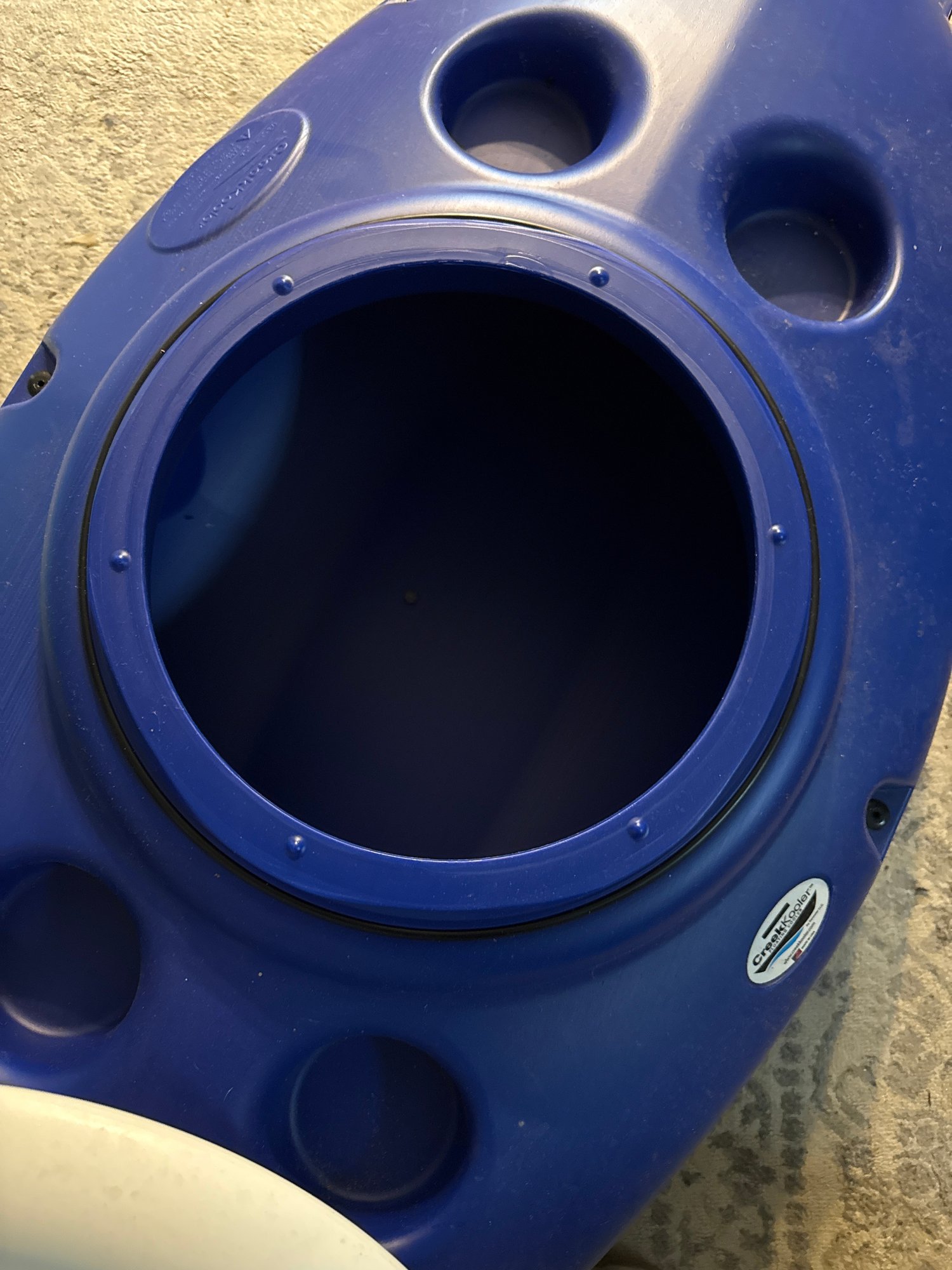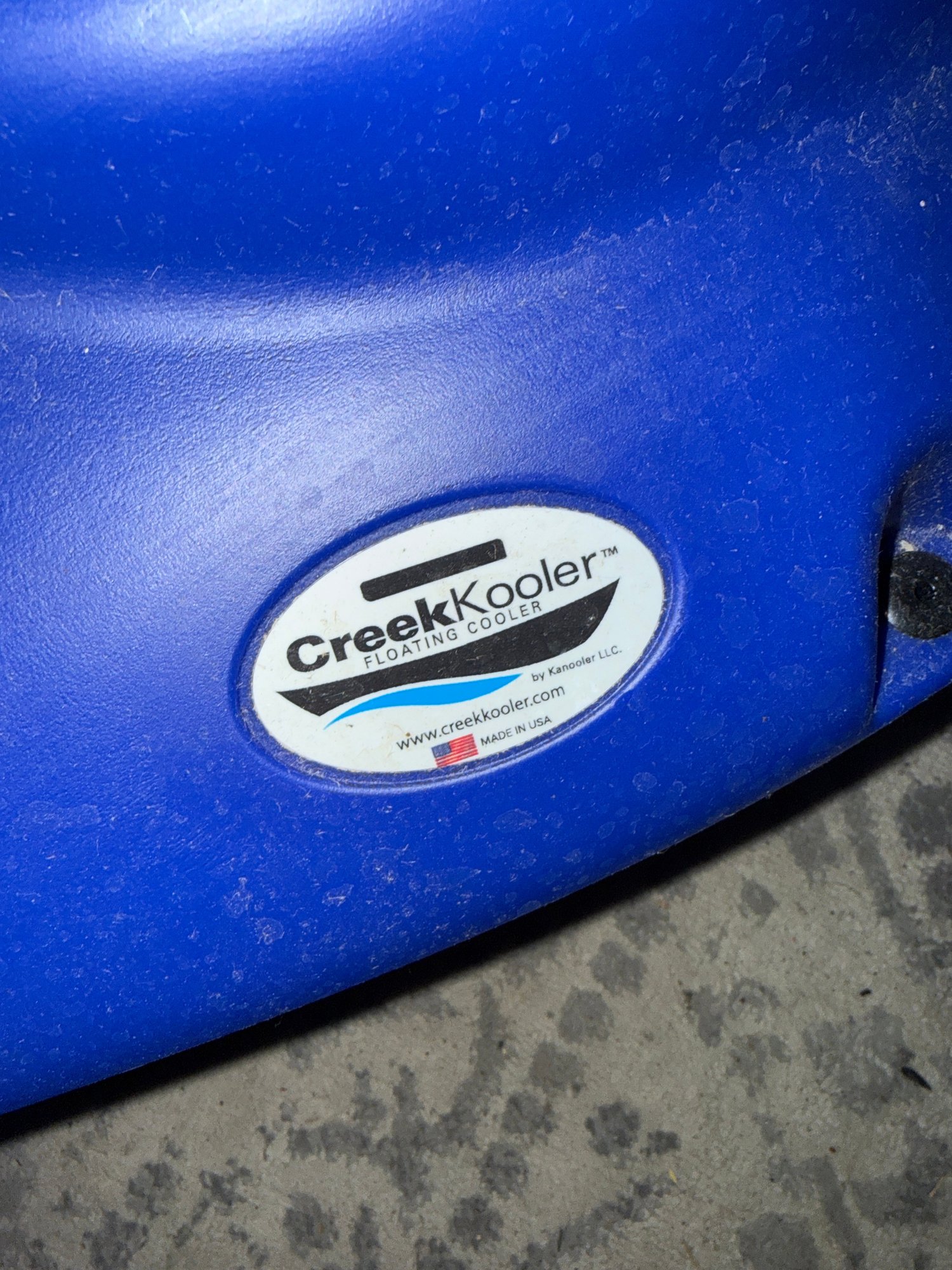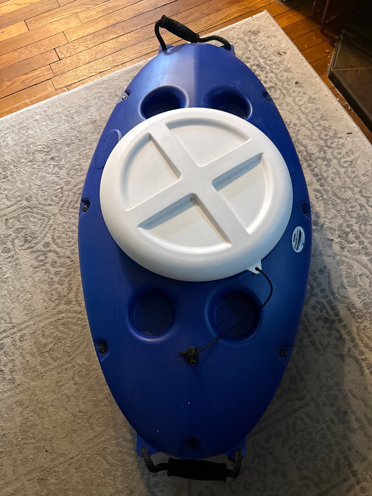 Large plastic floating cooler with handles is 40 inches wide, 20 inches deep in approximately 12 inches high.