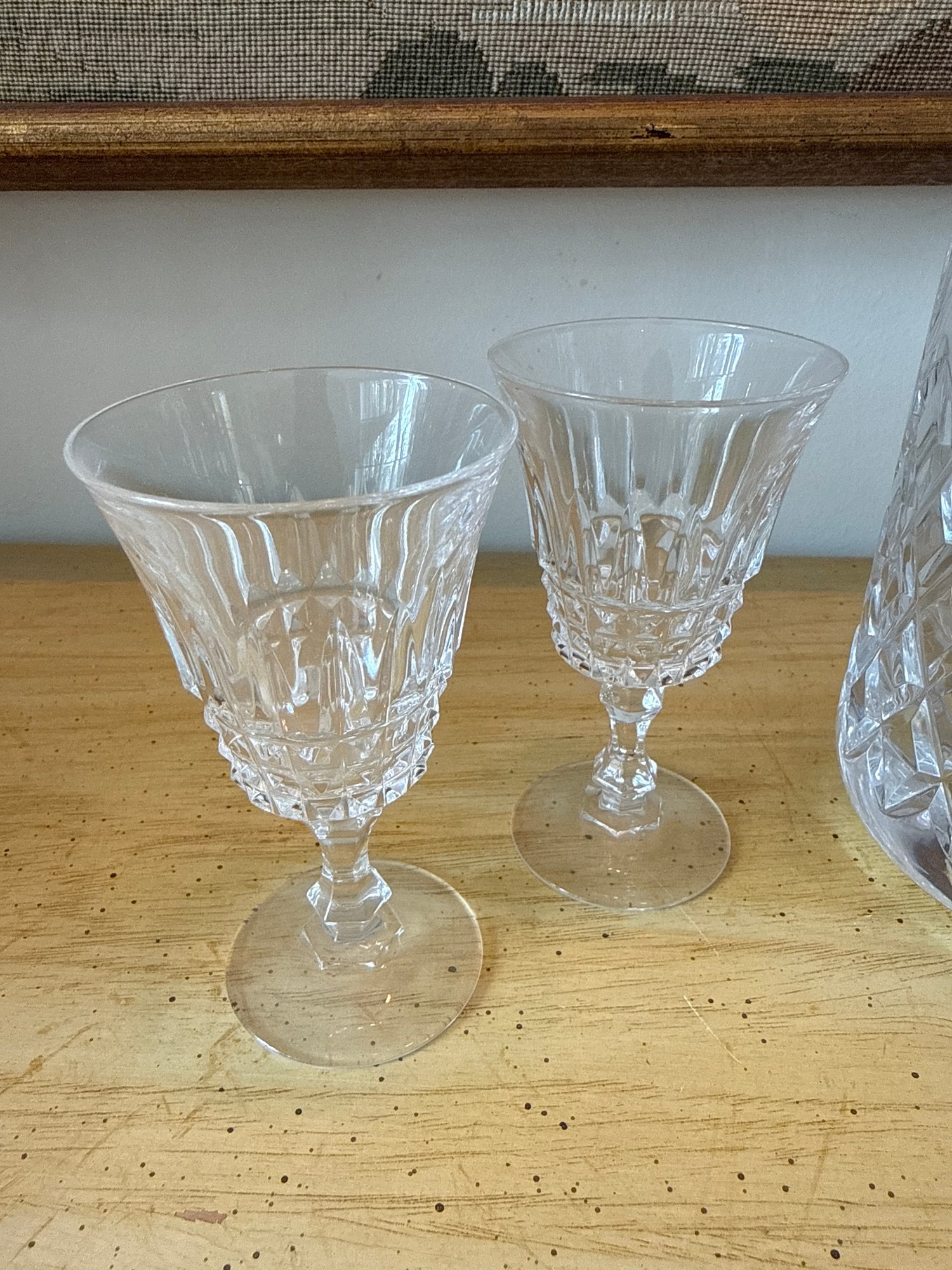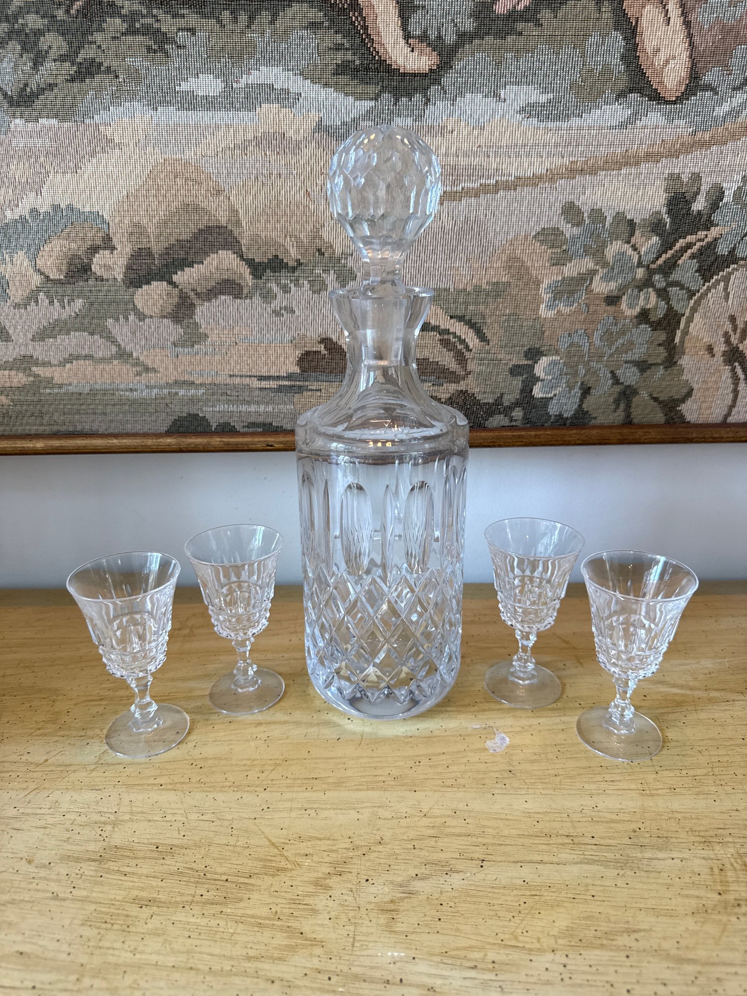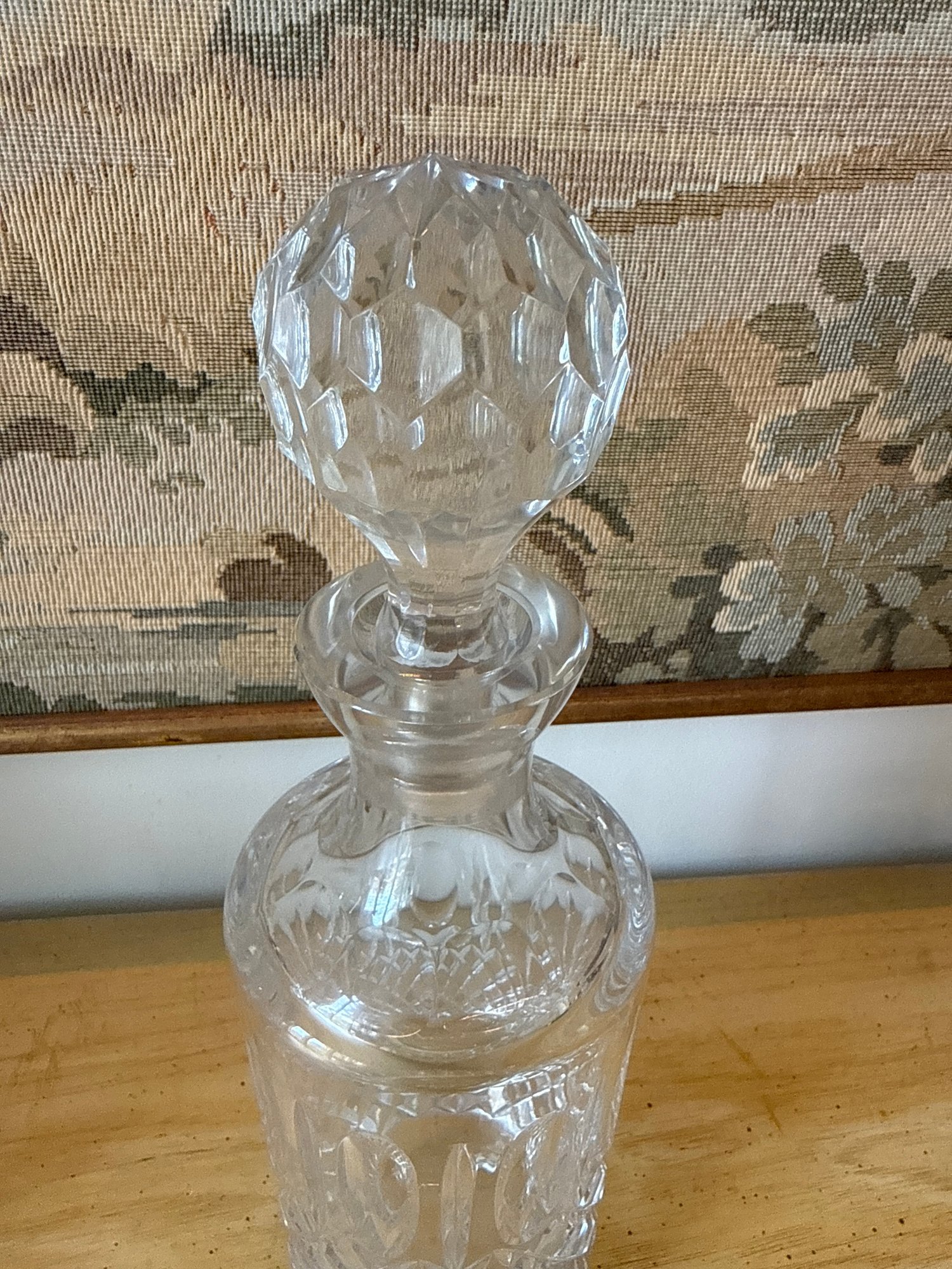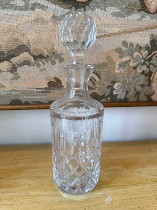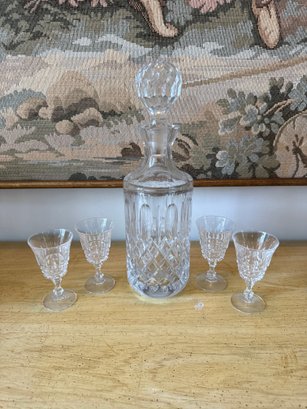 Cut crystal whiskey decanter, a classic barware piece with intricate diamond and wedge cuts. The cancer is 12 inches tall and includes 43 and three-quarter inch glasses.
