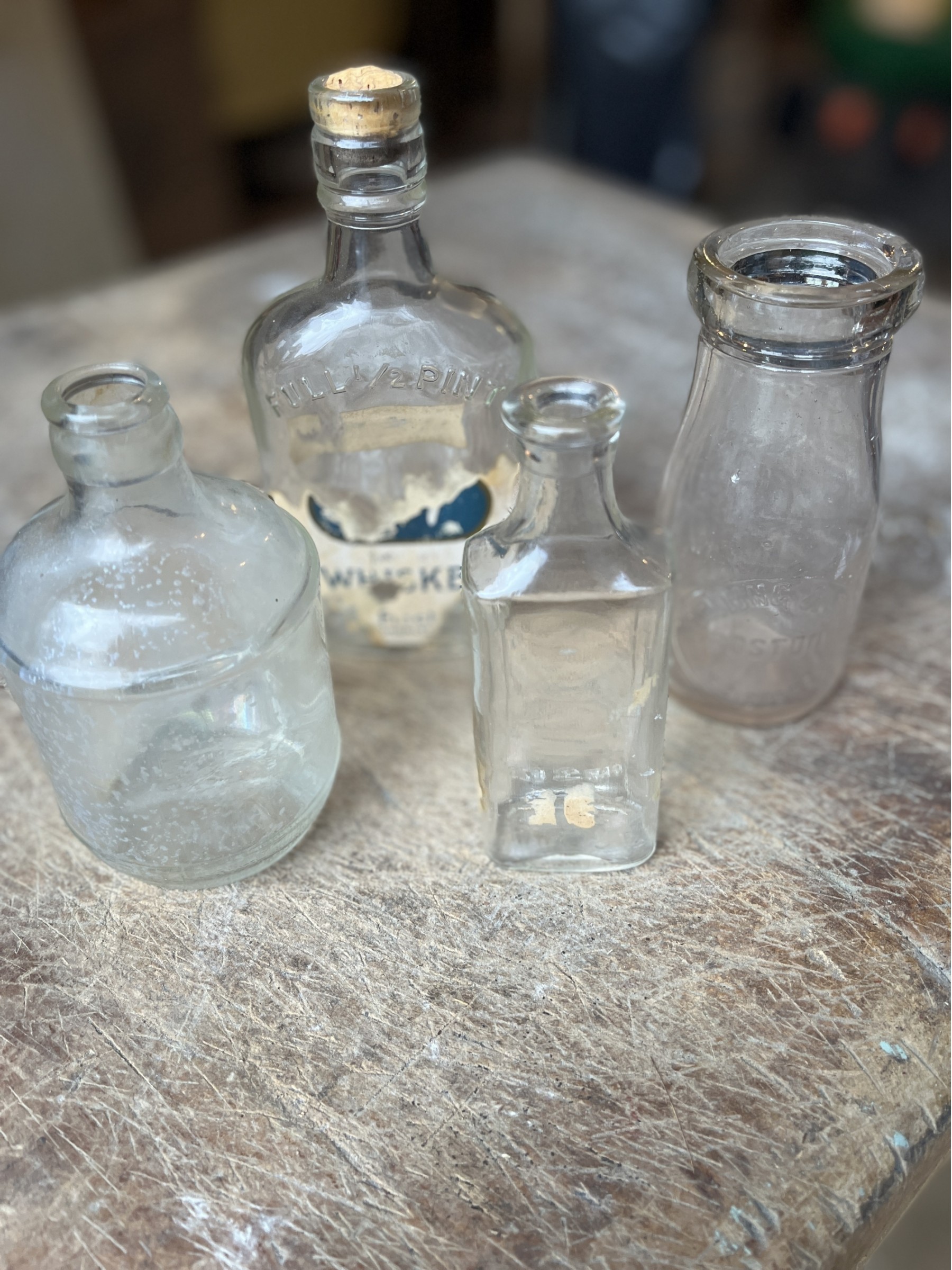 Lots of four decorative bottles. The rectangular bottle is marked “Gap 3 OZS”. The bottle with the widest mouth is marked “D Whiting & Sons Boston”. The bottom of the whitest bottle is marked “Penick & Ford LTD Inc. New Orleans”. The fourth bottle is marked “Full Half Pint” and has the remains of a whiskey label.