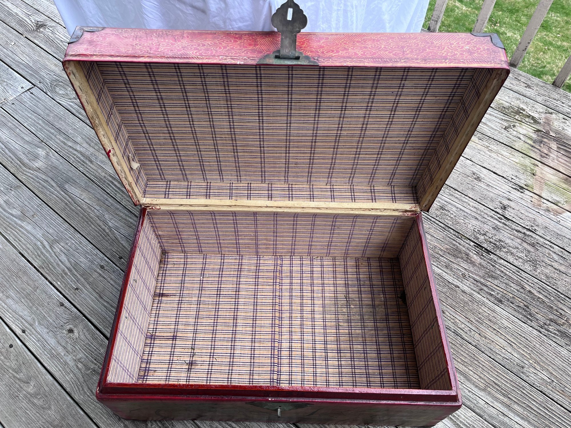 • Brass/iron corner mounts and latch hardware
