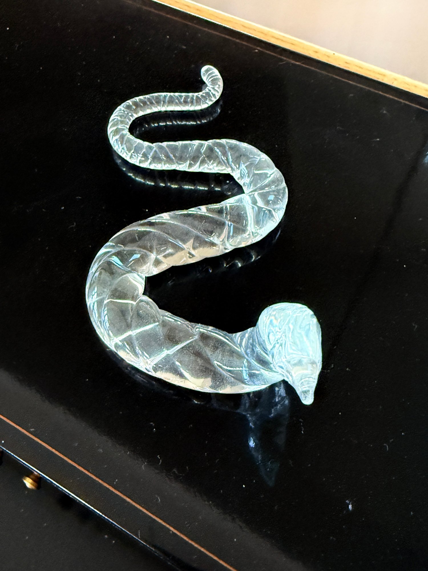 Decorative clear glass collectible sculpture, designed in the shape of a snake with a textured, segmented surface. Unique decorative accent piece rather than a mass-produced product.