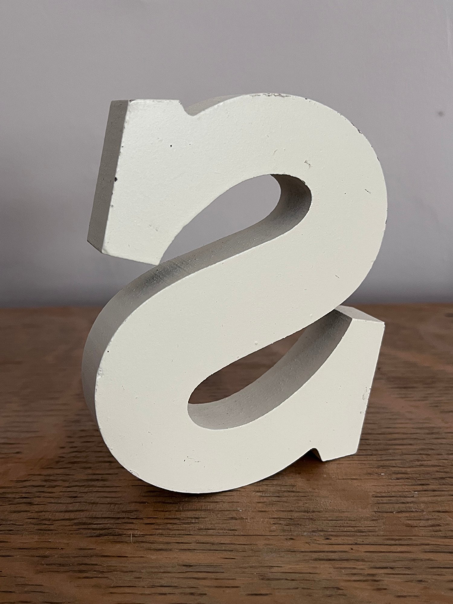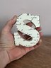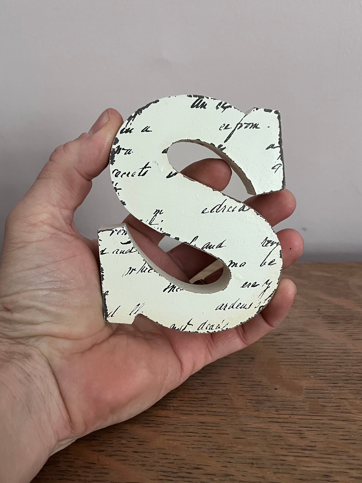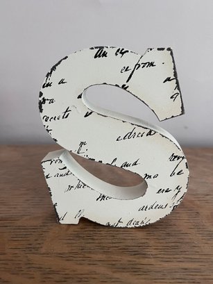 Decorative, distressed wooden letter "S" featuring black, script-style text. This item is typically used for home decor, often described as having a rustic, farmhouse, or shabby-chic aesthetic.