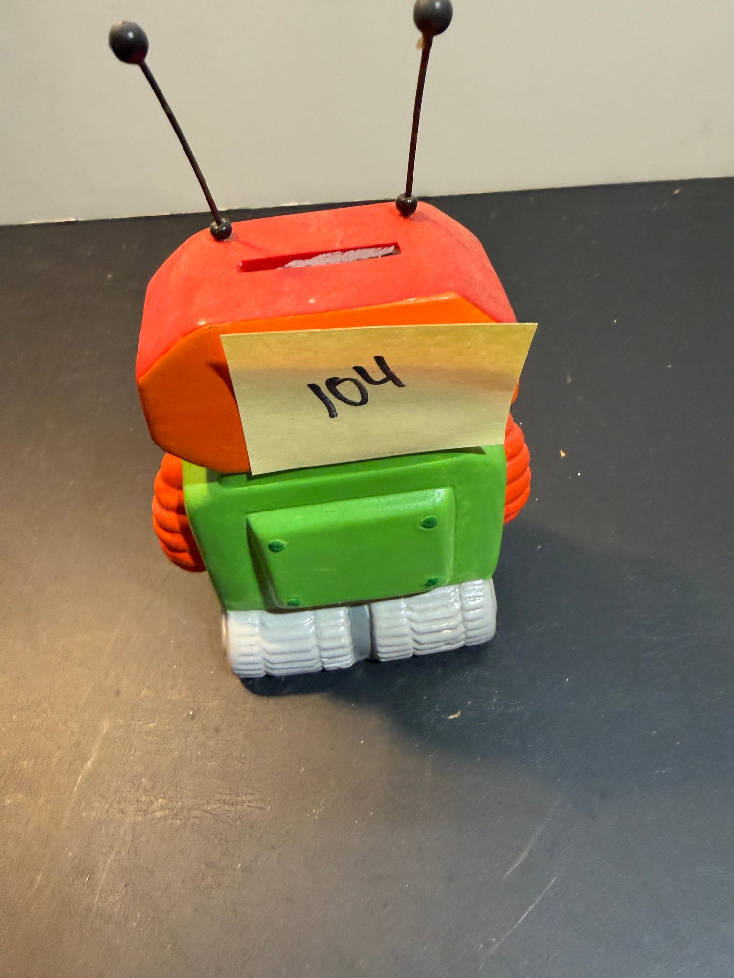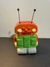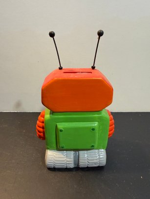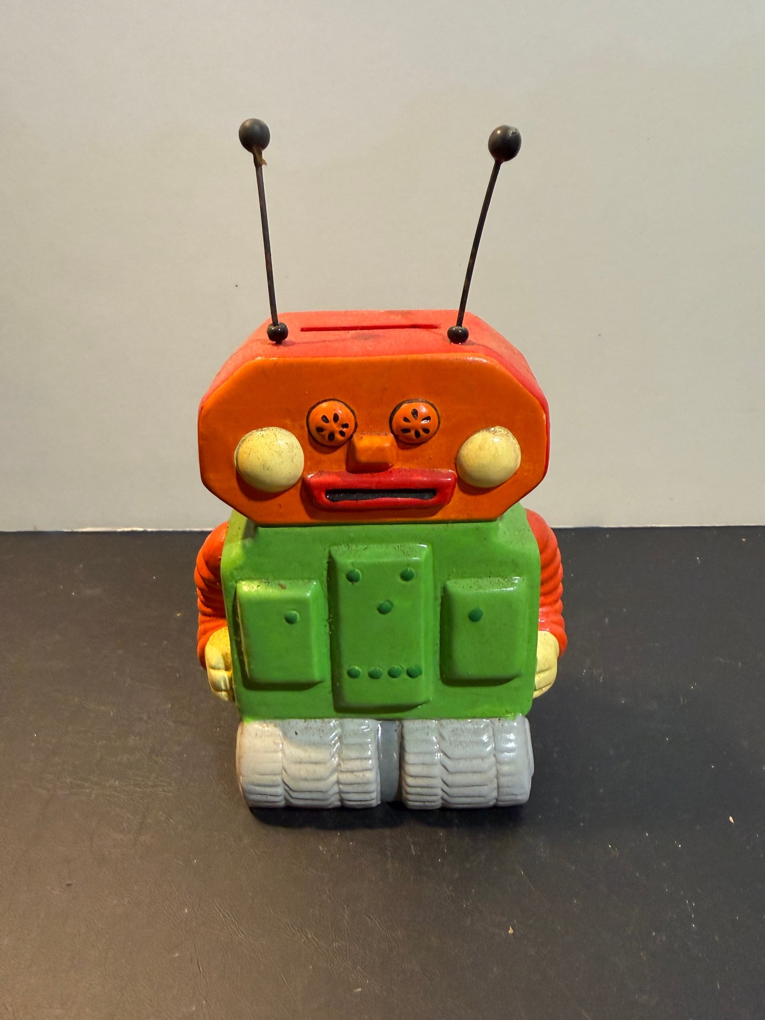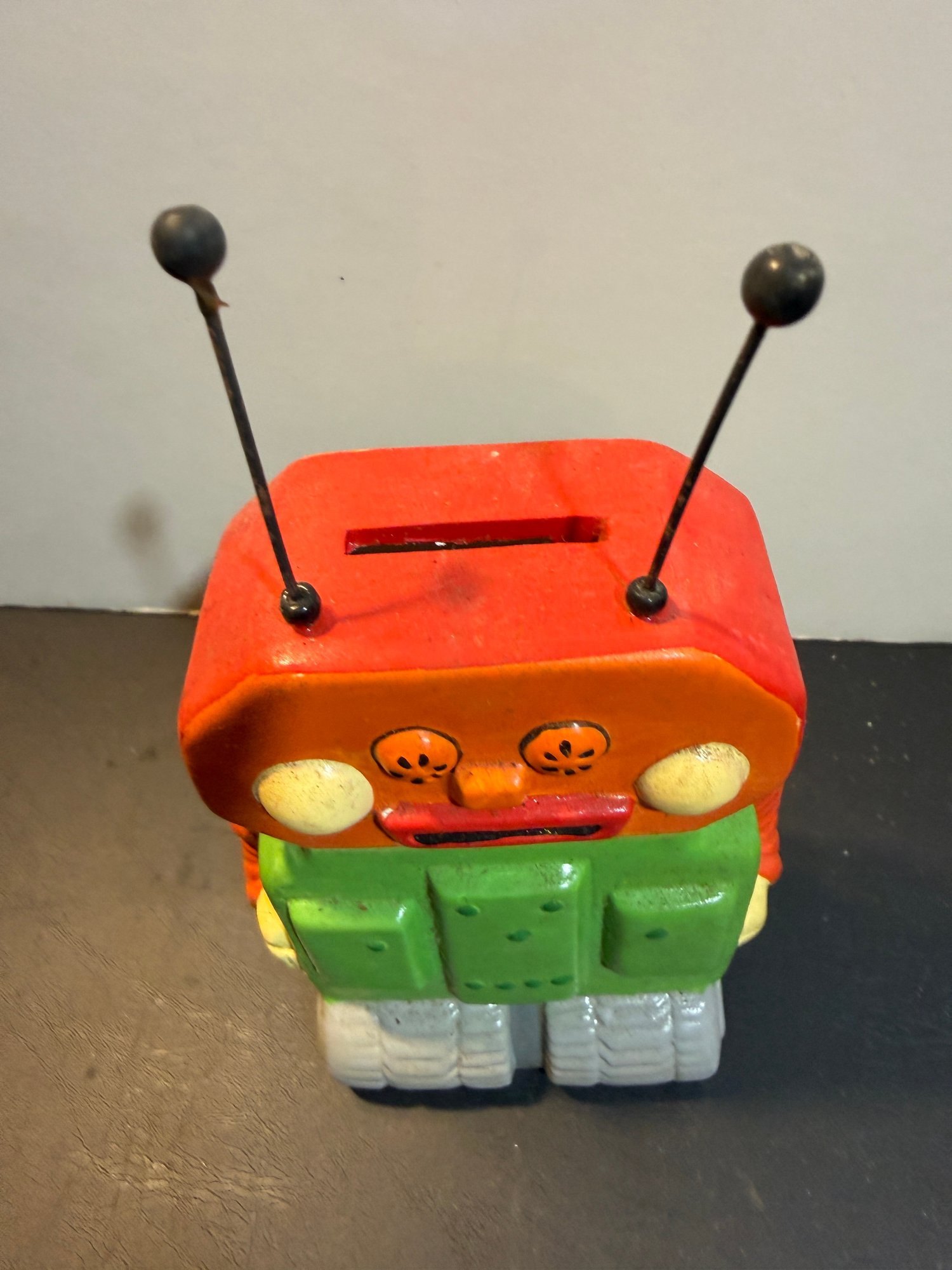 Decorative robot-shaped coin bank, ceramic or a similar molded material, designed with a retro or vintage aesthetic. It is used for storing coins and can also function as a decorative ornament for a room or display shelf.