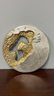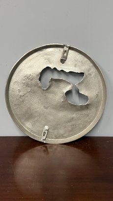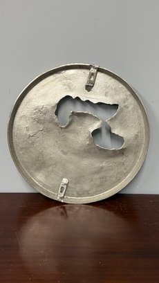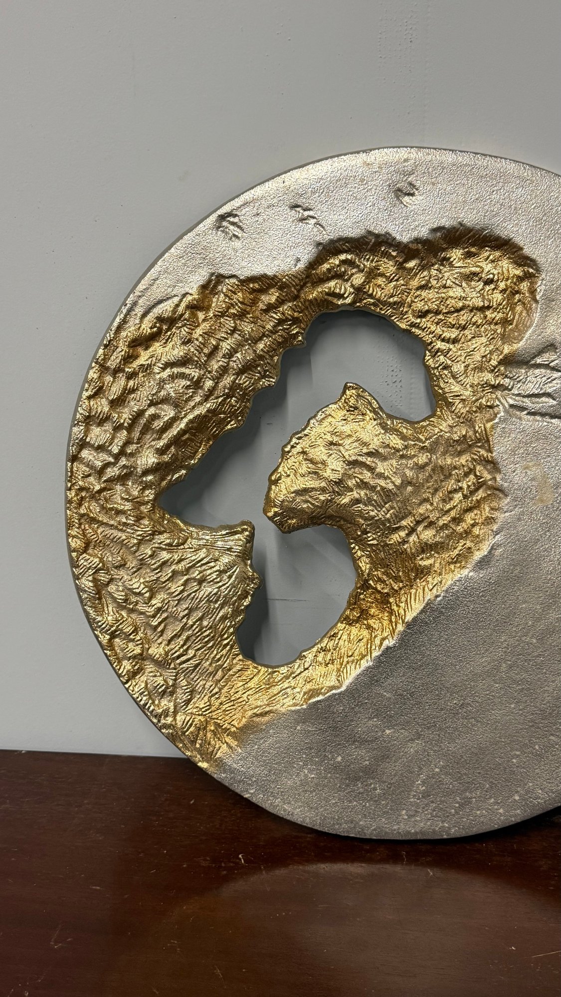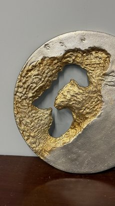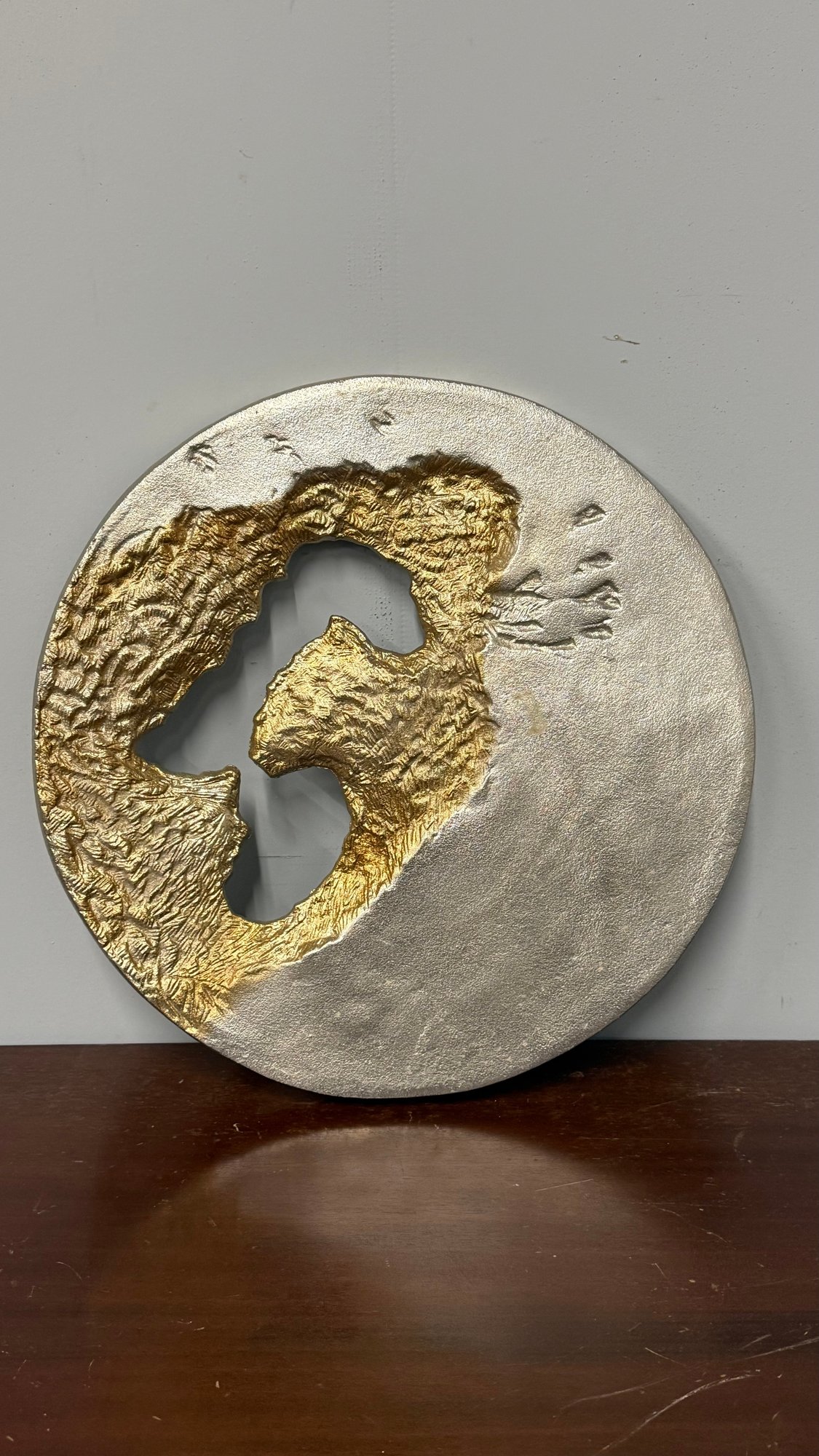 Decorative round textured wall artwork, a piece of modern, handcrafted art, featuring a gold leaf design on a silver-colored textured background.