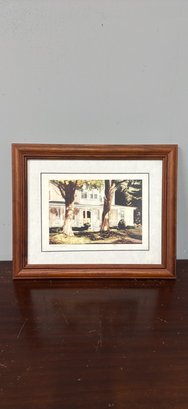 Charming framed art print. Has a house with trees in the picture. Signed by artist Denis LeBlanc. This is a limited edition print, number 15/450. Comes with a nice wooden frame.