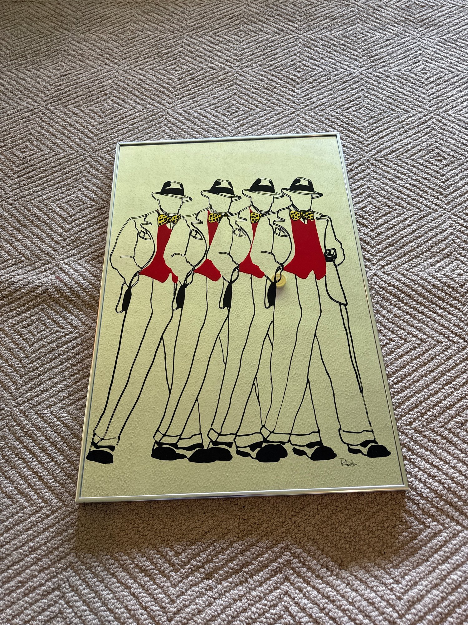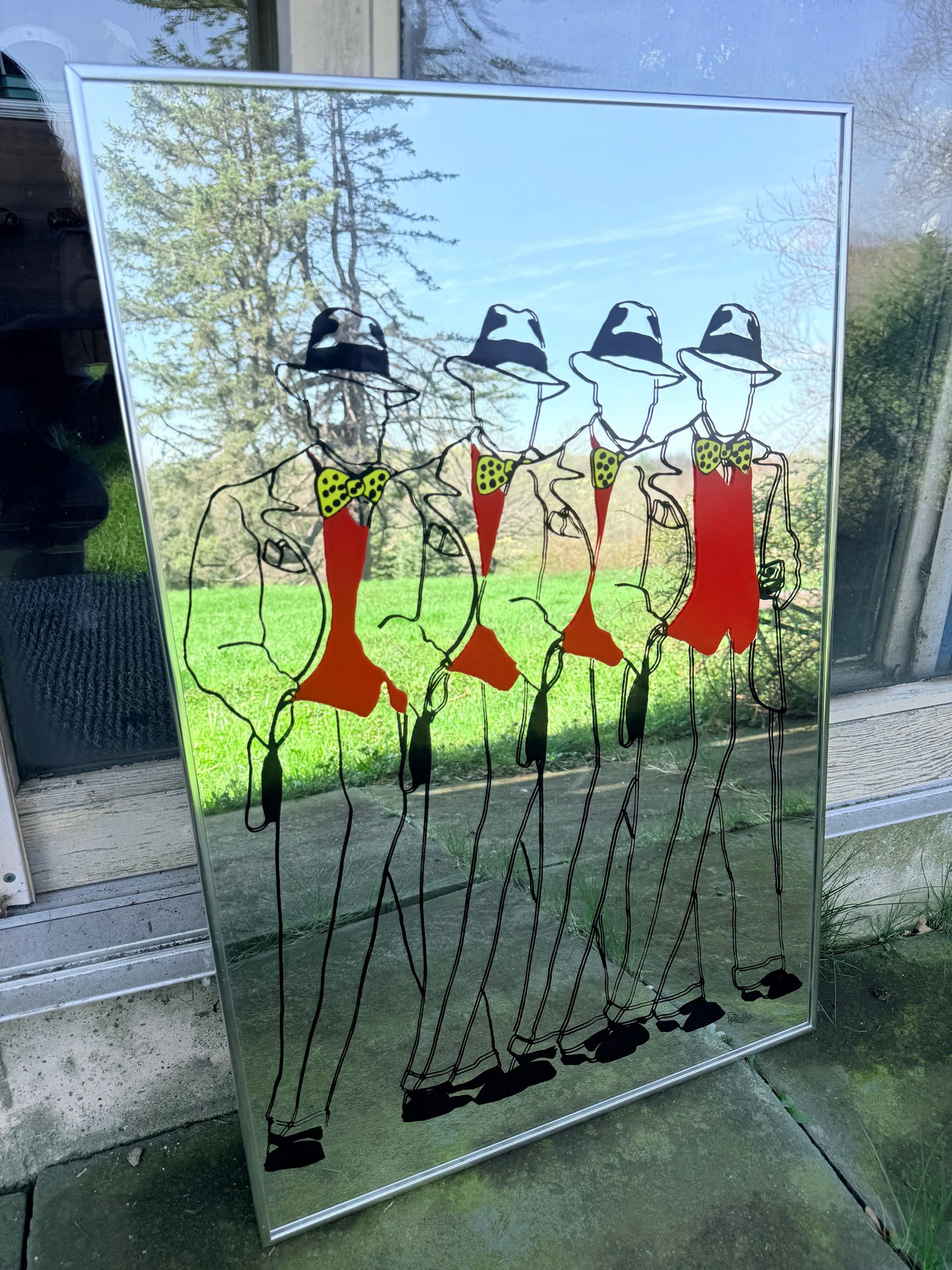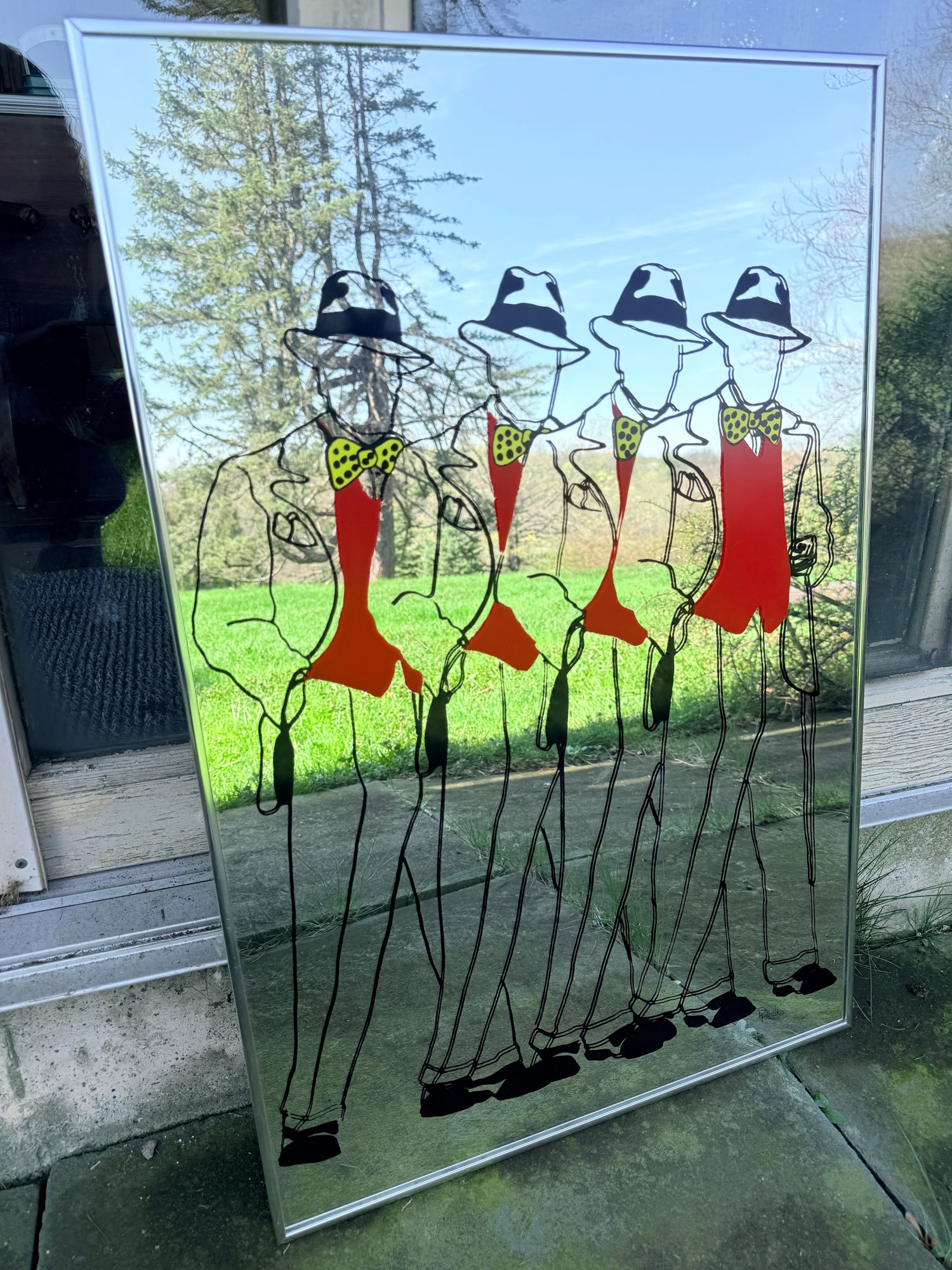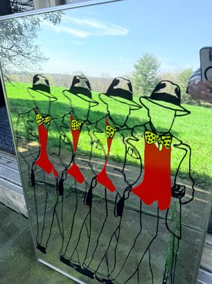 Distinct mid-century modern aesthetic, characterized by bold, minimalist line work and vibrant pops of color. It is consistent with the style of vintage carnival prizes or "fair glass" from the 1970s and 80s, which often depicted stylized figures and pop culture motifs on mirrored surfaces.