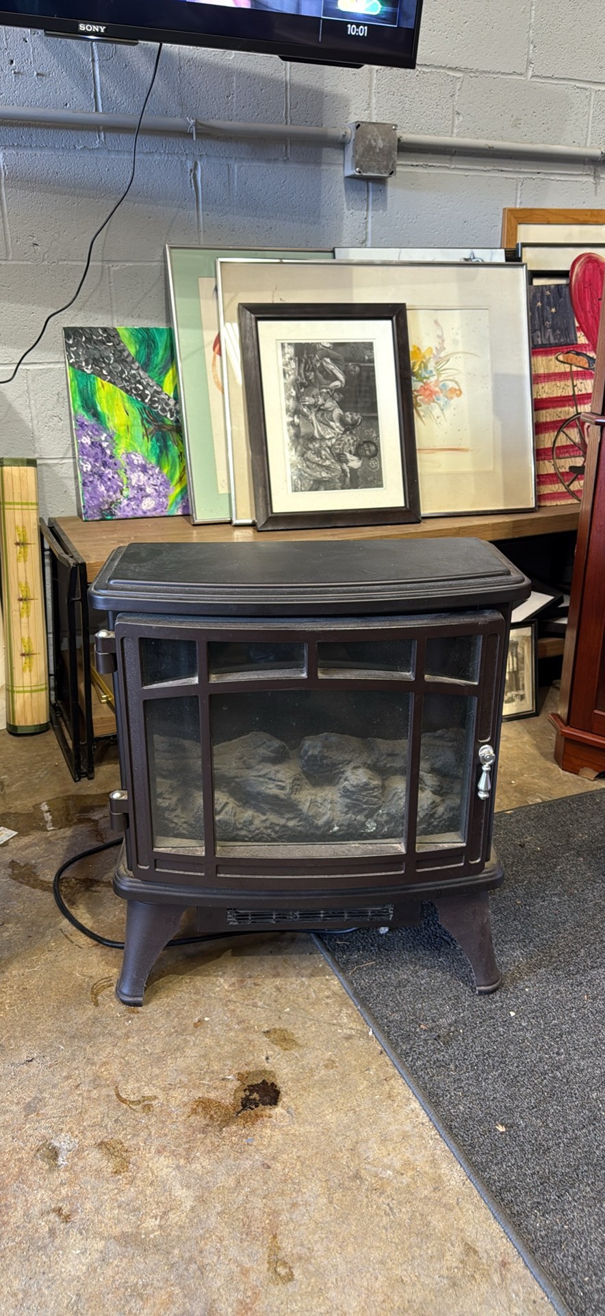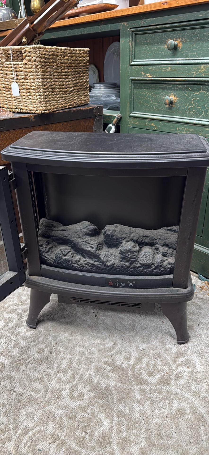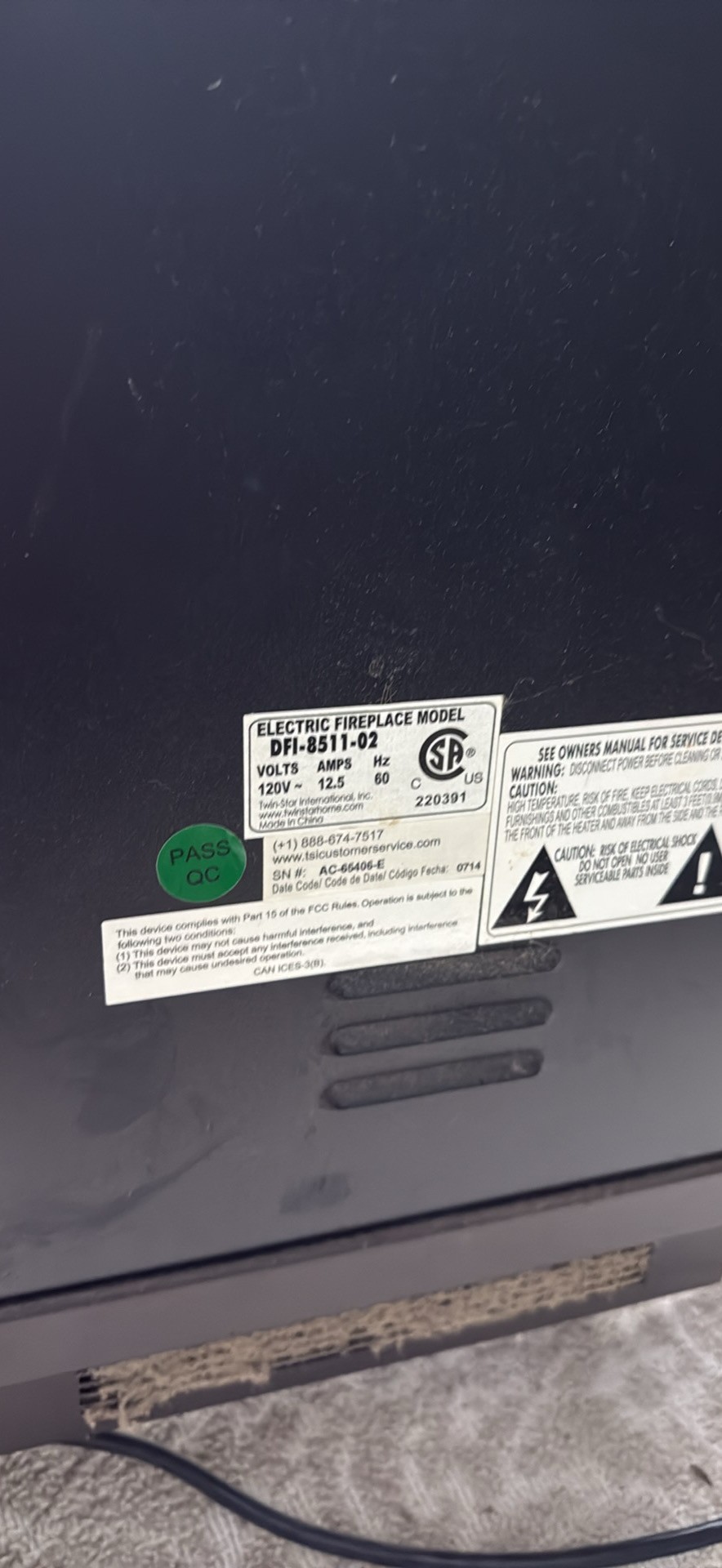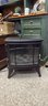 Cozy electric fireplace. Twin-Star brand, model DFI-8511-02. Has a dark brown/black finish. Faux logs inside for a nice flame effect. Controls on the front. Great for adding warmth and ambiance.