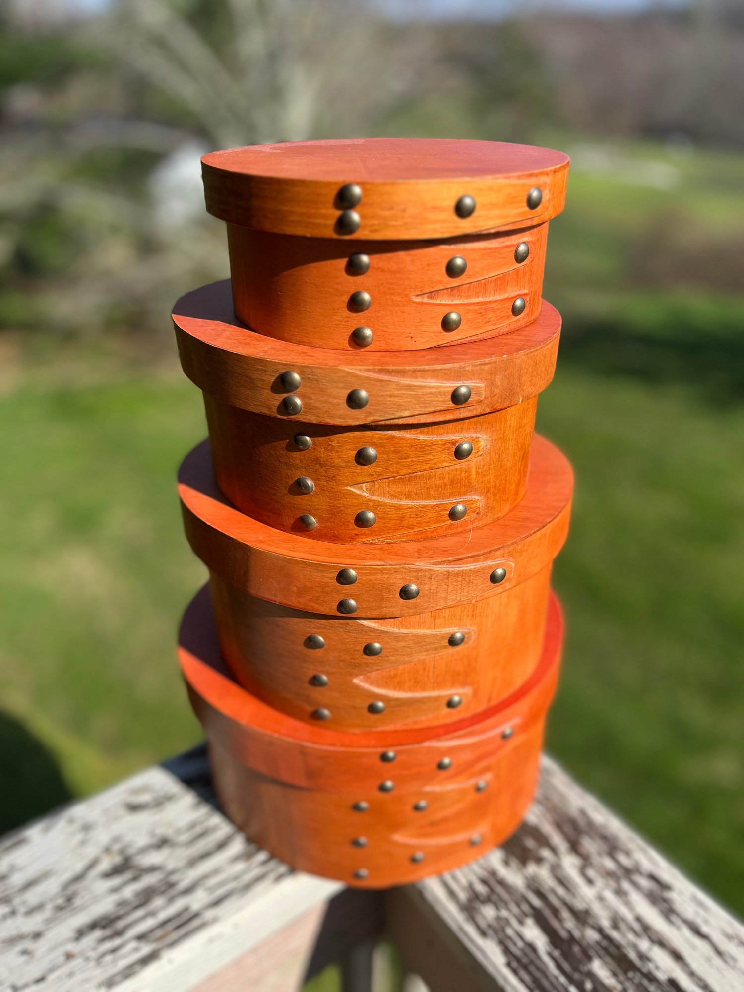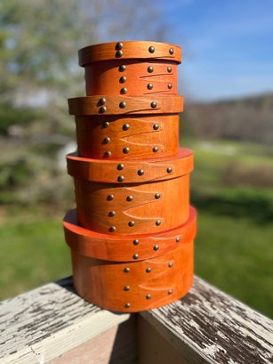 Set of nesting Shaker-style oval pantry boxes crafted from wood with a reddish-brown stain, featuring copper-tone tack fasteners on the swallowtail joints.