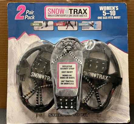 The NEW Snow Trax Ice Traction is designed for women's shoes and boots in sizes 5-10. Each pack includes 2 pairs, featuring a strap made of nylon reflective material for security. The metal and rubber construction ensures durability for use in snowy and icy conditions. The black color adds versatility and style to these snowshoe accessories, ideal for winter sports like skiing, snowboarding, and snowshoeing.
