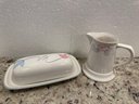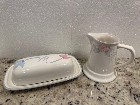 Butter dish is 8 inches long and creamer is 4 1/2 inches tall.