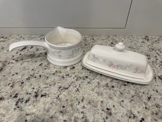 Butter dish is 8 inches long and gravy pot is 8 1/2 inches wide, including handle and 2 1/2 inches high.