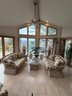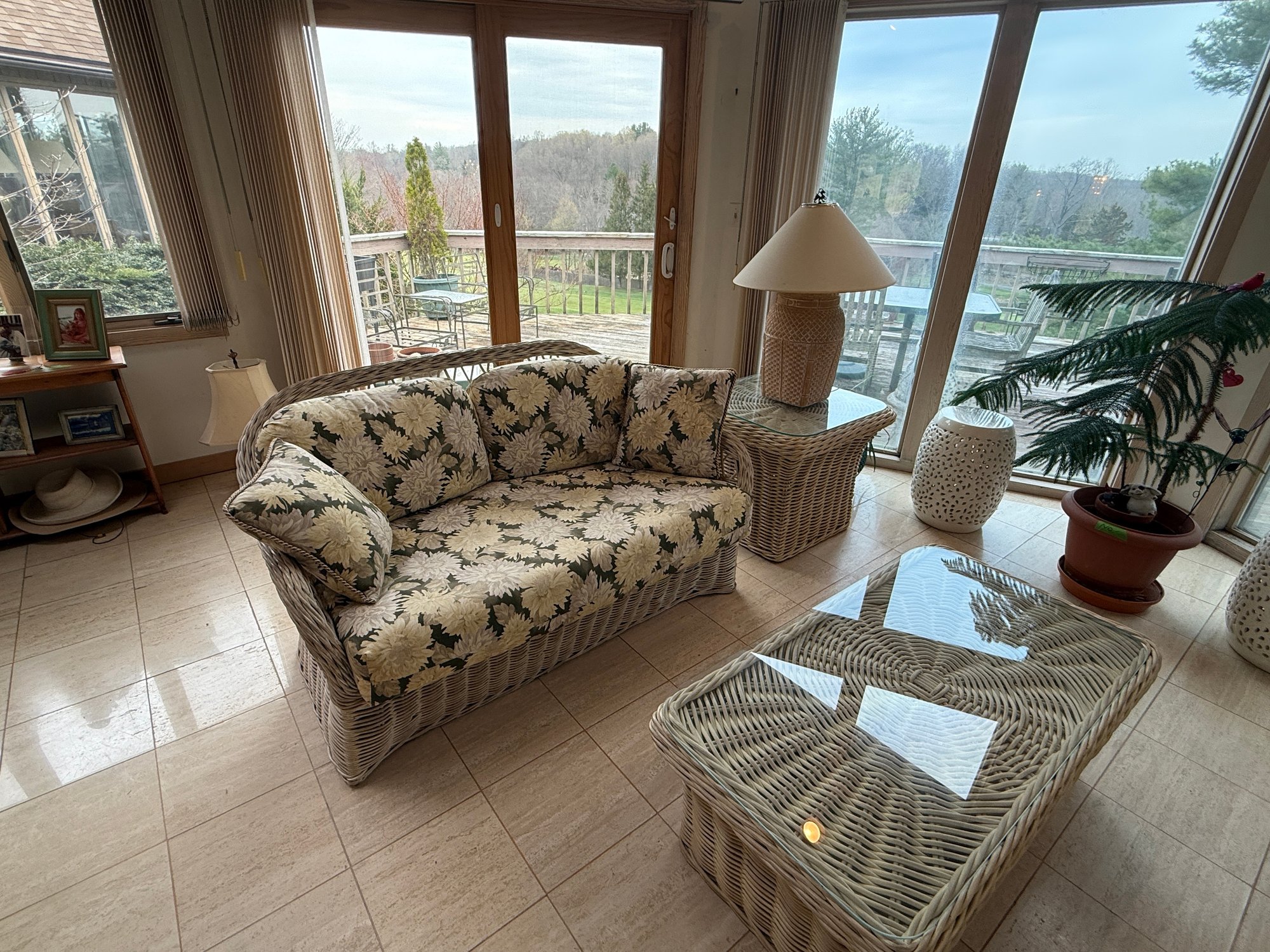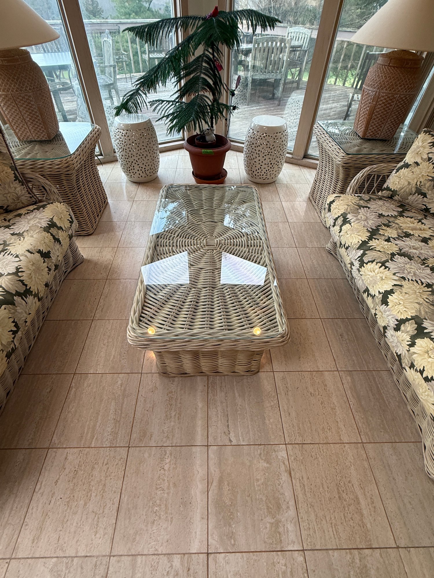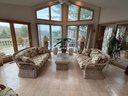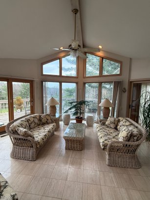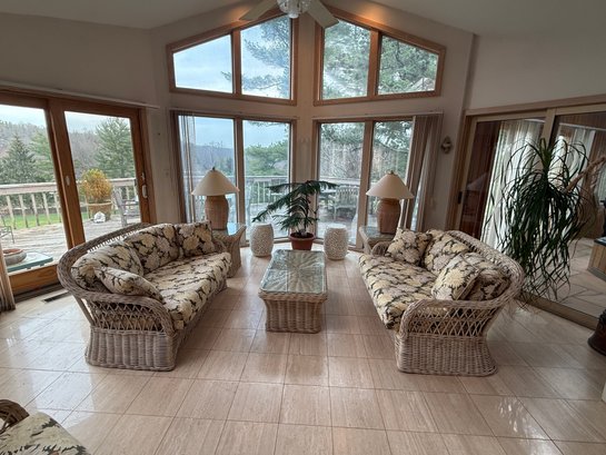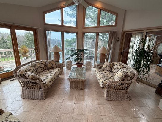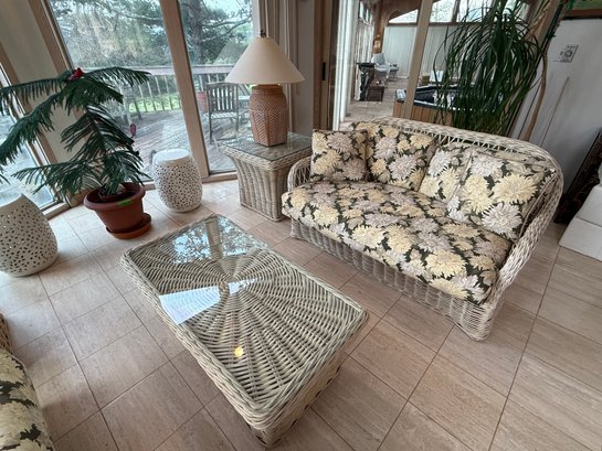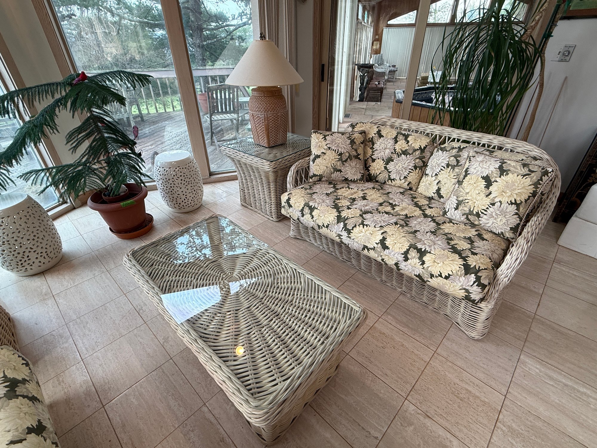 This vintage-inspired wicker set is perfect for a sunroom, patio, or coastal living space. Set includes two love seats, coffee table, and two end tables. All other items shown in photos are not included. It features a classic hand-woven design and thick, comfortable cushions with a subtle botanical print. Cushions and chairs are in very good condition. Super sturdy!