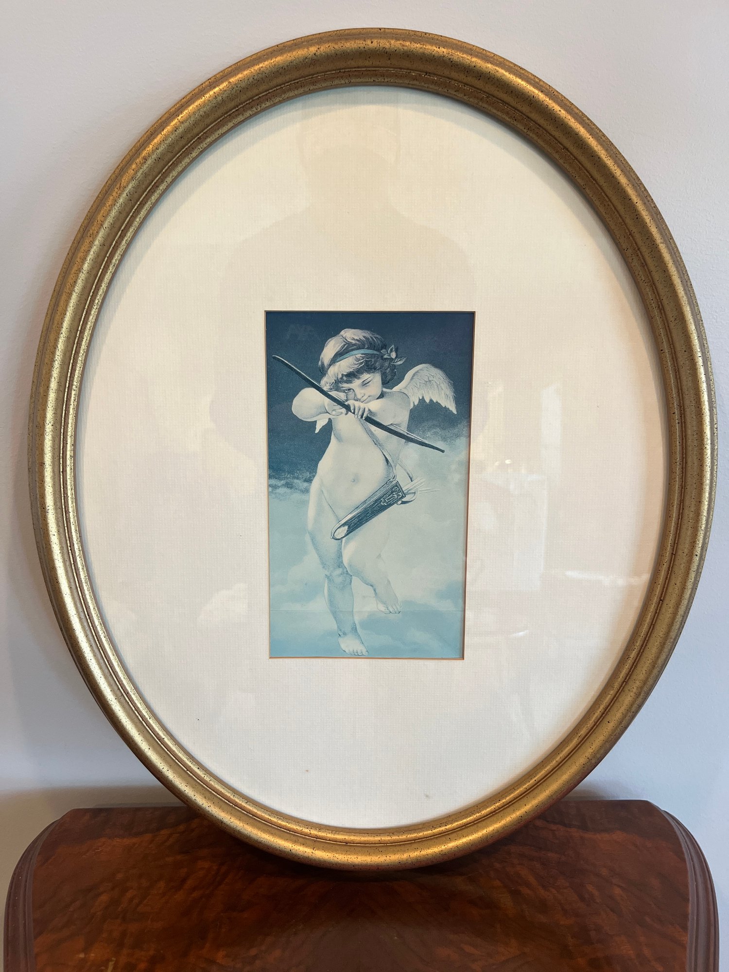 Framed depiction of a putto, which is a chubby male child, often nude and winged, commonly found in Renaissance and Baroque art.