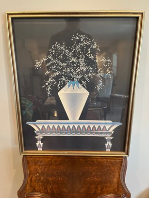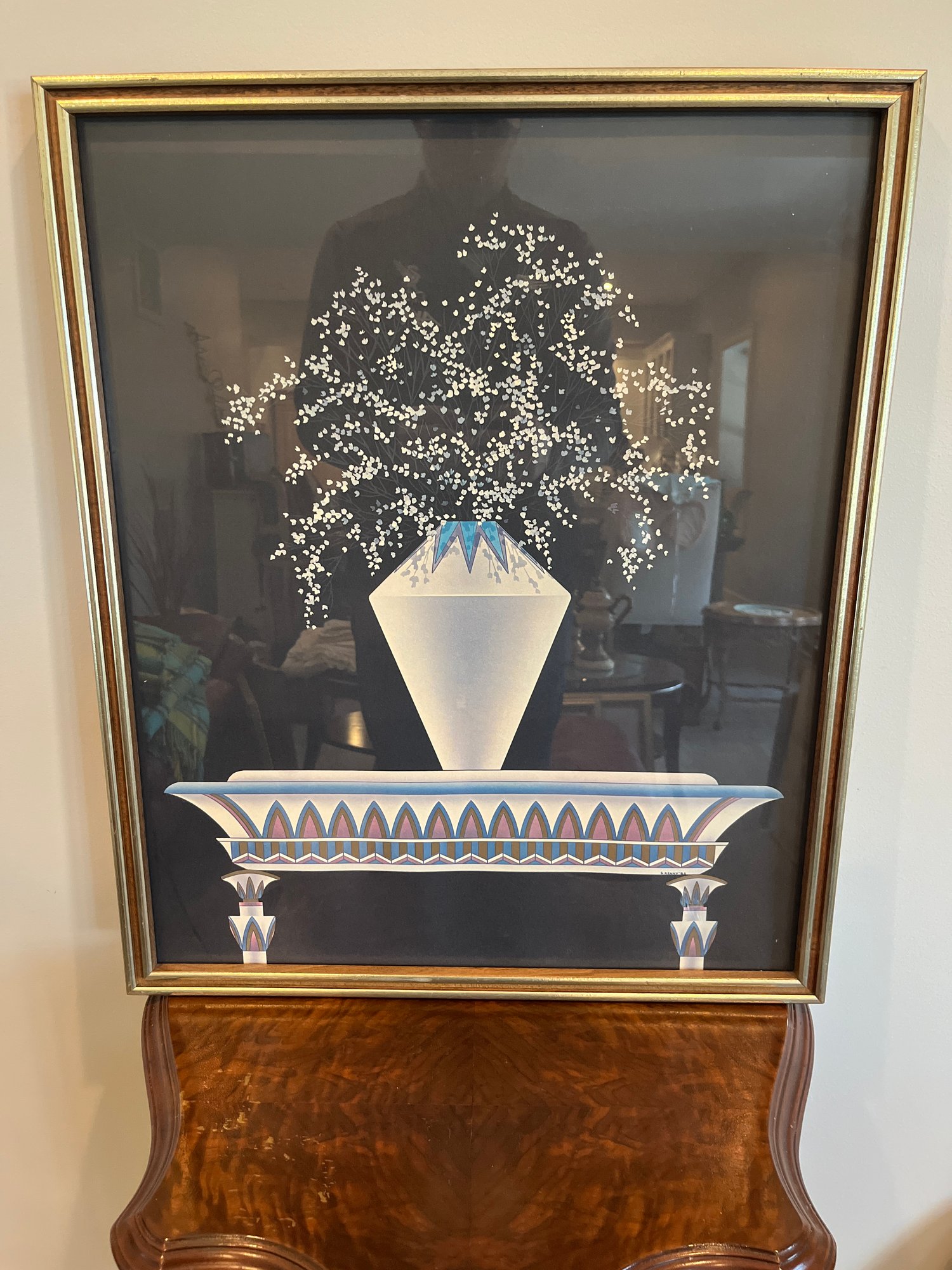 Print by Canadian artist Steve Kenny, likely from 1980, titled "Artworks International" or "No title (flowers, vase, table)". Features a stylized vase with flowers on a decorative table. Has contemporary, with geometric and art deco influences.